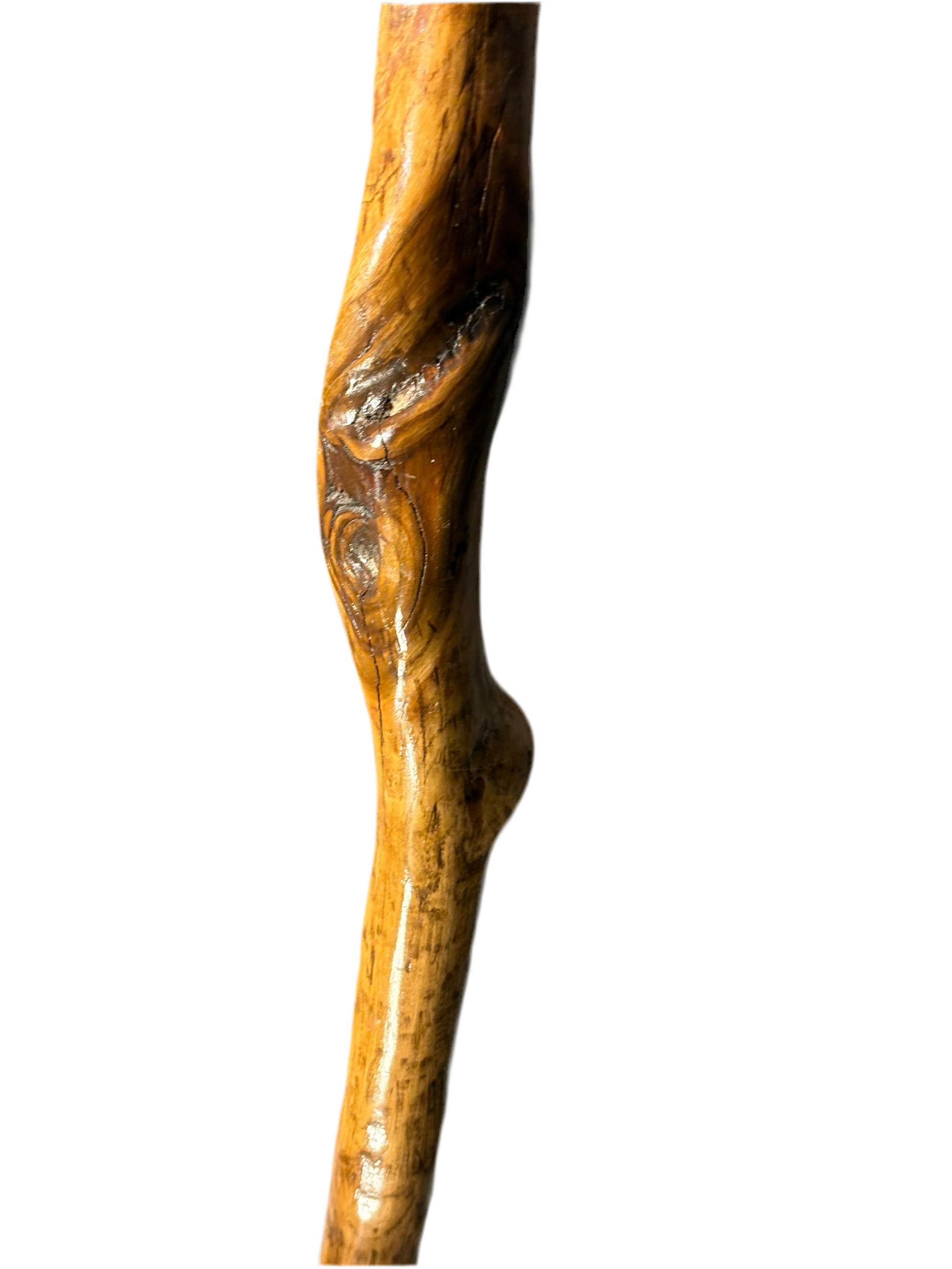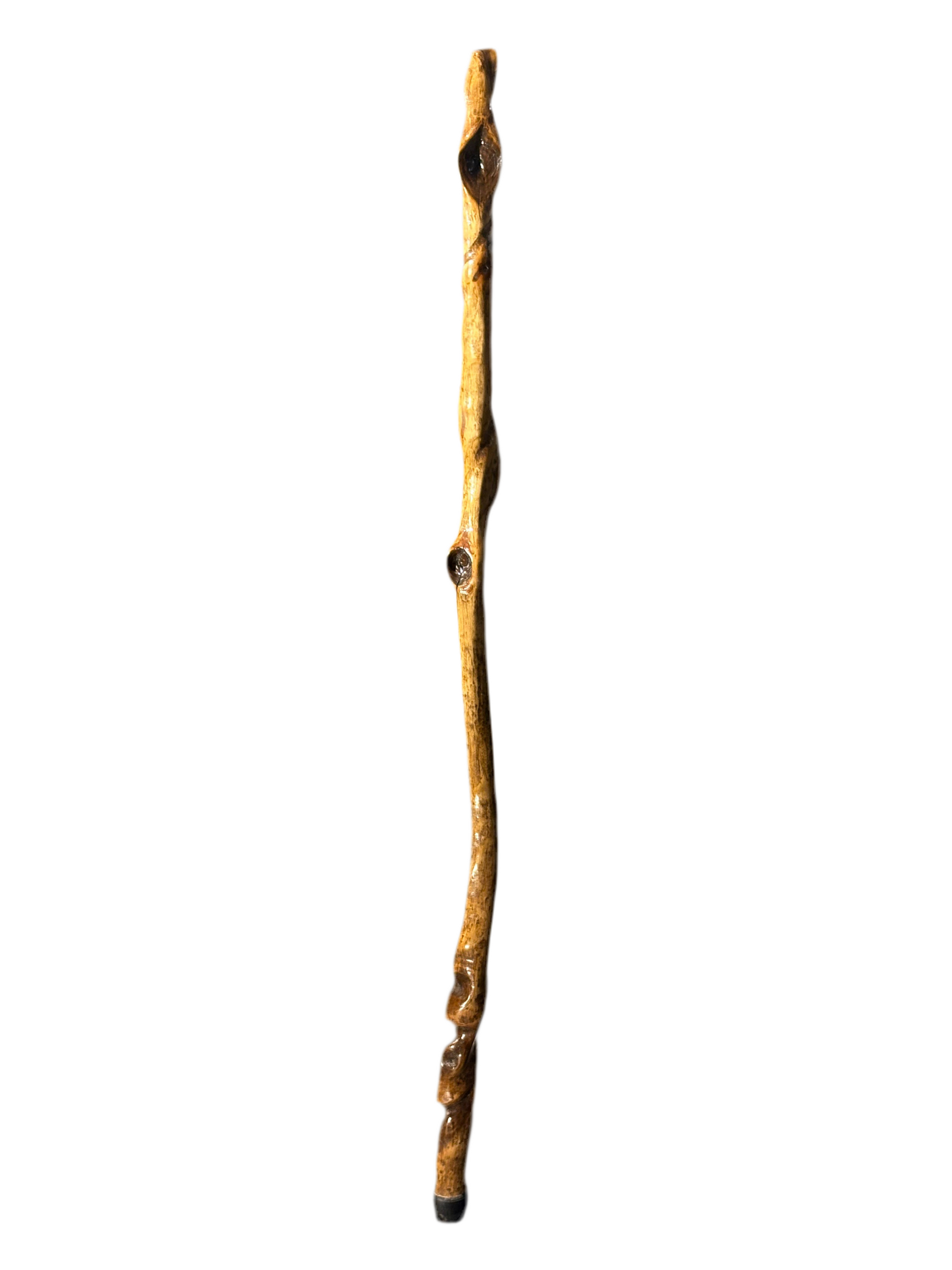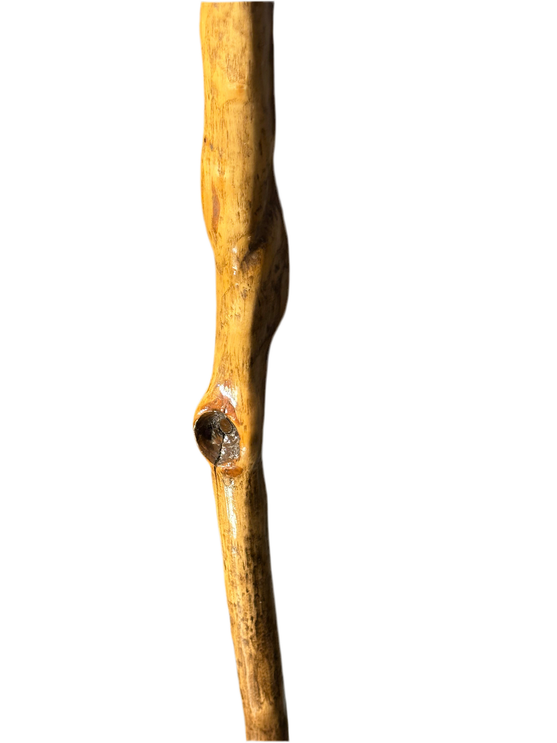 About- Rugged and unrefined, this natural walking stick embraces the wilderness in every knot and curve. Polished just enough to to bring out its inner glow, it’s a quiet companion for wanders who prefer the trail less paved. Abo is 41 1/4 inch’s tall and is 1 1/4 by 1 1/4 wide.