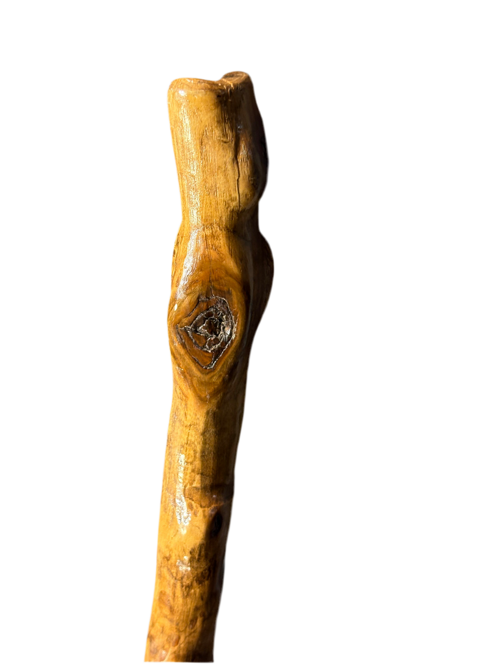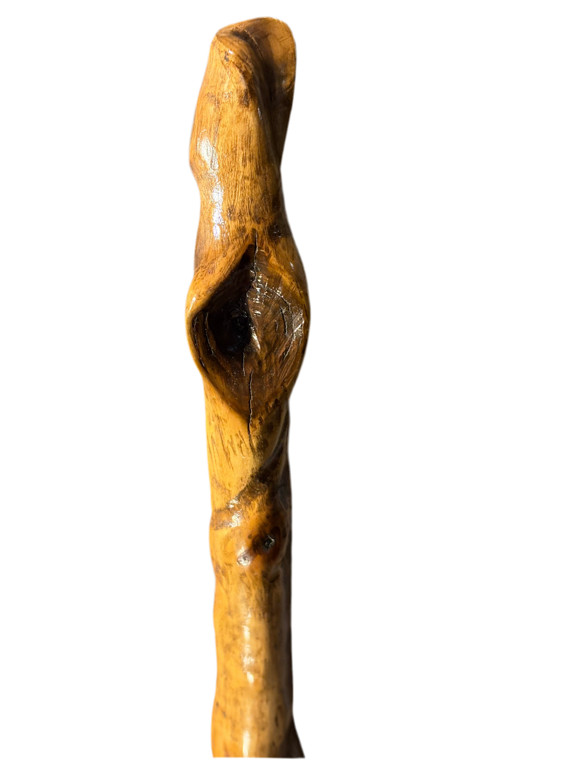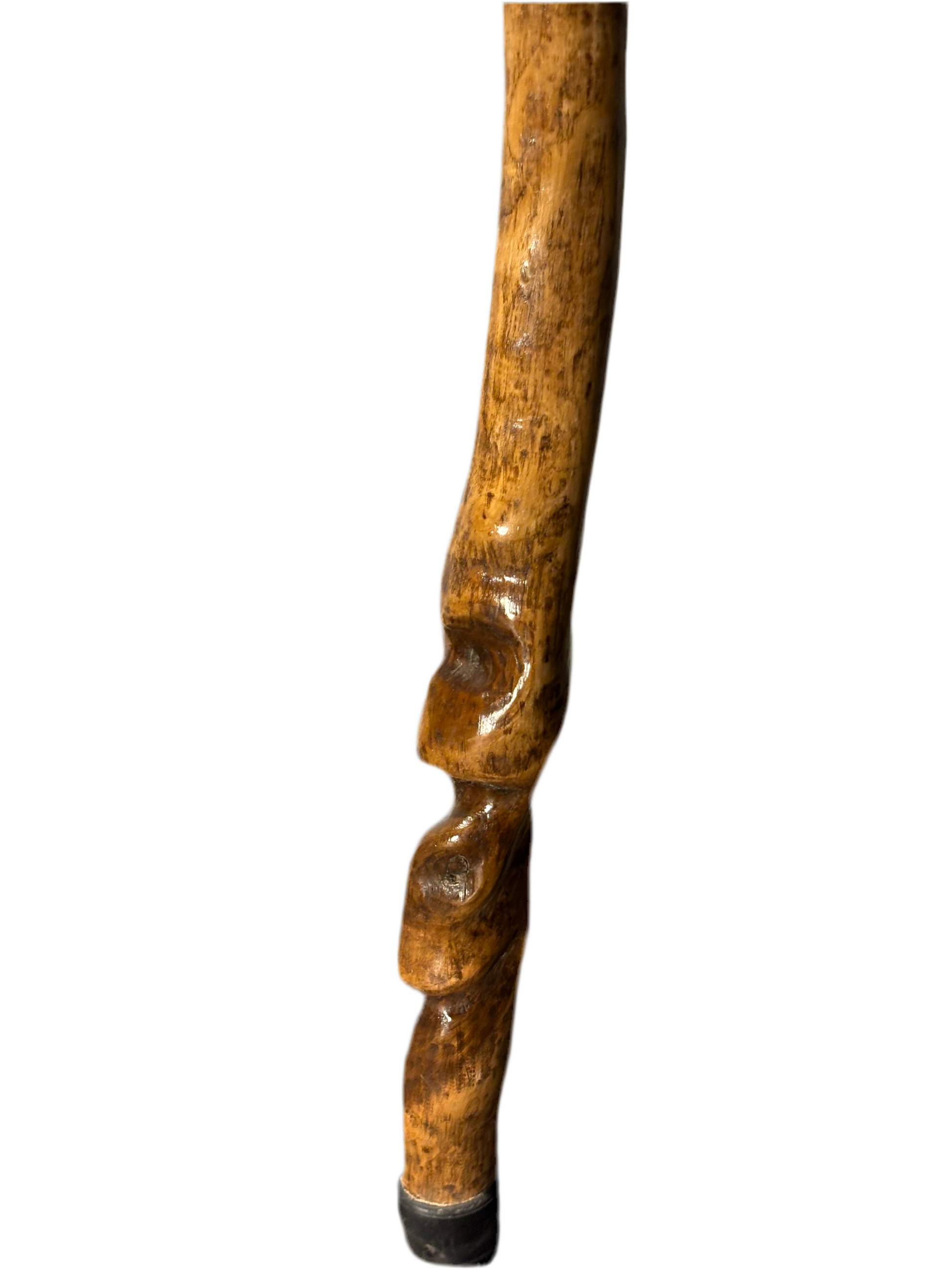 About- Rugged and unrefined, this natural walking stick embraces the wilderness in every knot and curve. Polished just enough to to bring out its inner glow, it’s a quiet companion for wanders who prefer the trail less paved. Abo is 41 1/4 inch’s tall and is 1 1/4 by 1 1/4 wide.