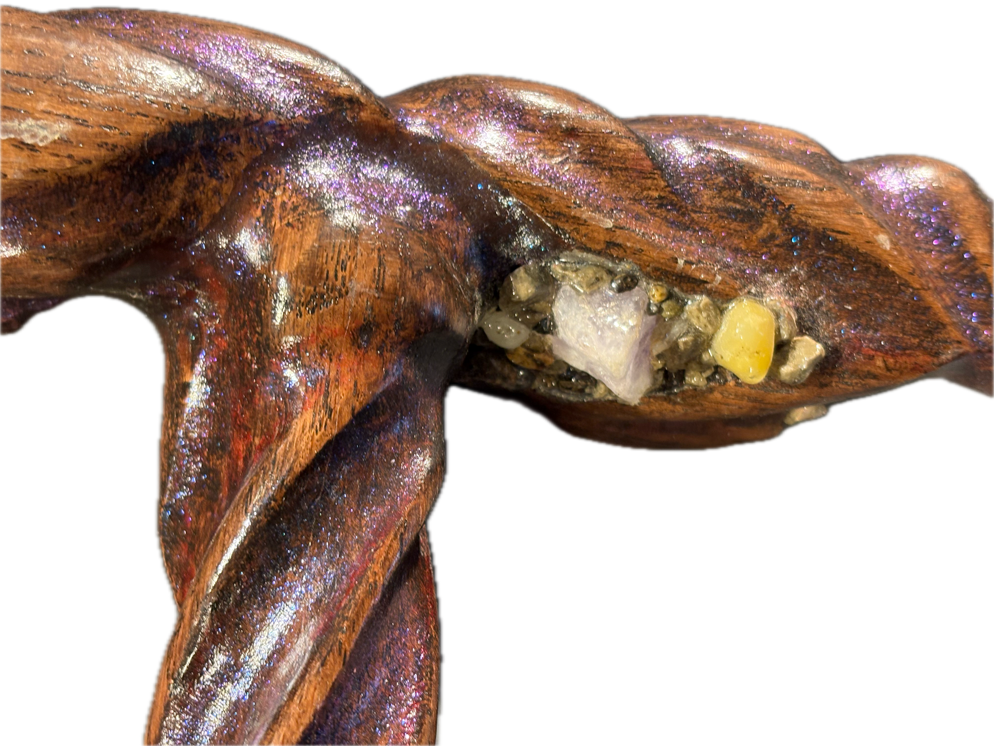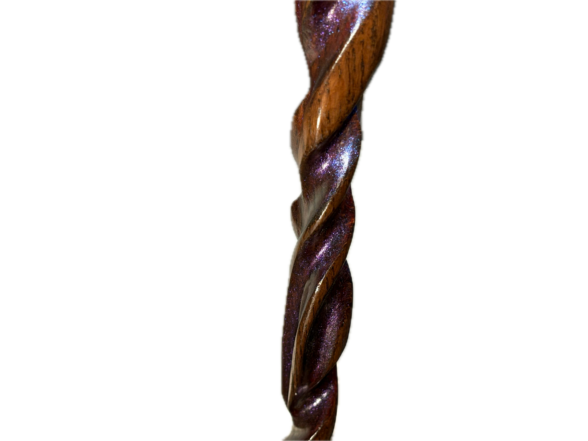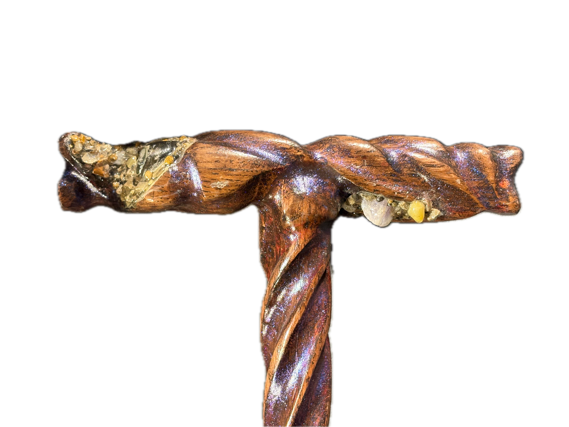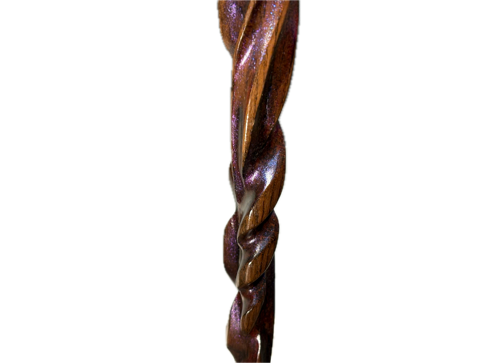 Amethyst- A red oak cane with hidden stone magic crafted from sturdy red oak, this 34 1/2 inch cane carries the subtle shimmer of an embedded amethyst and other hidden stones that catch the light just right. Measuring 1 1/4 by 1 3/4 at its widest, it offers both comfort and strength- with a quiet spark of mystery running through its core.