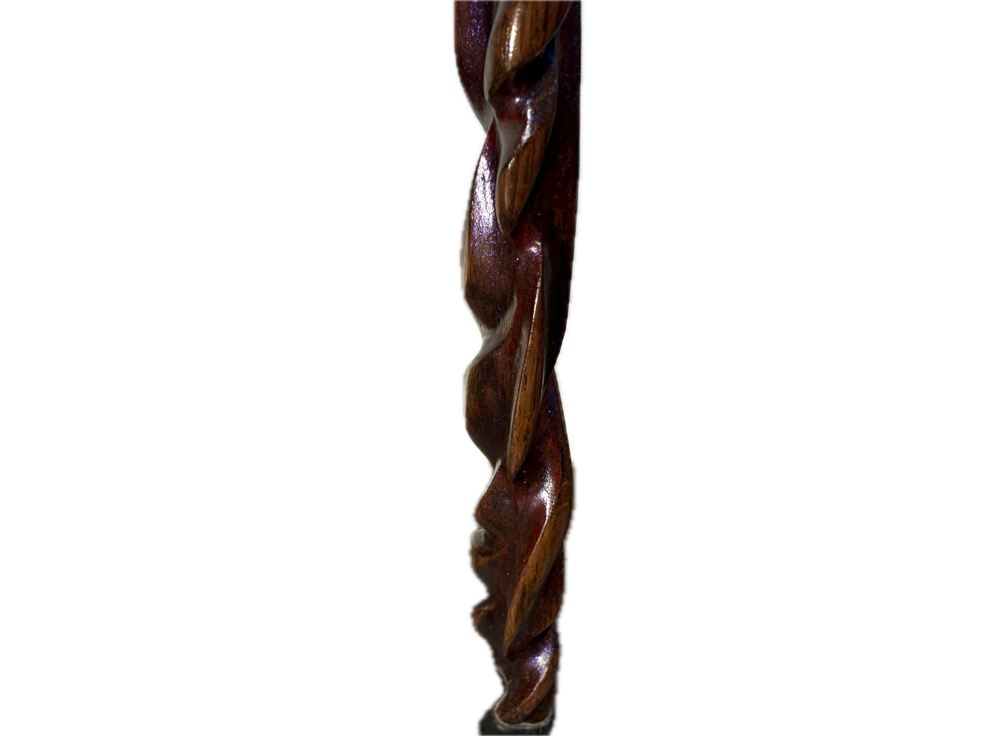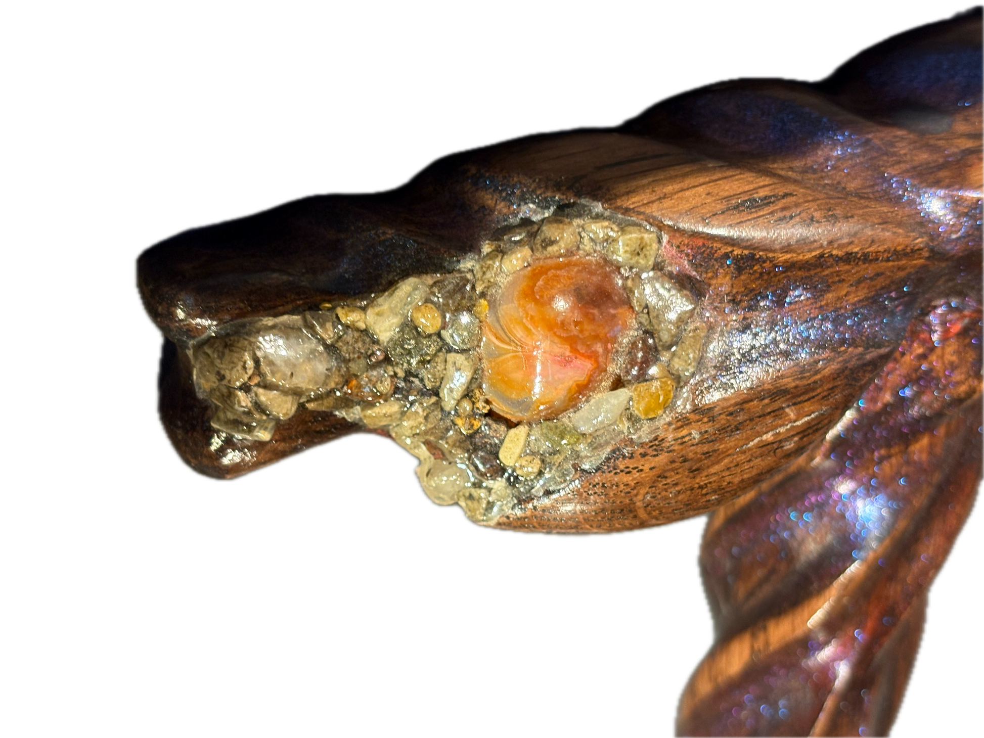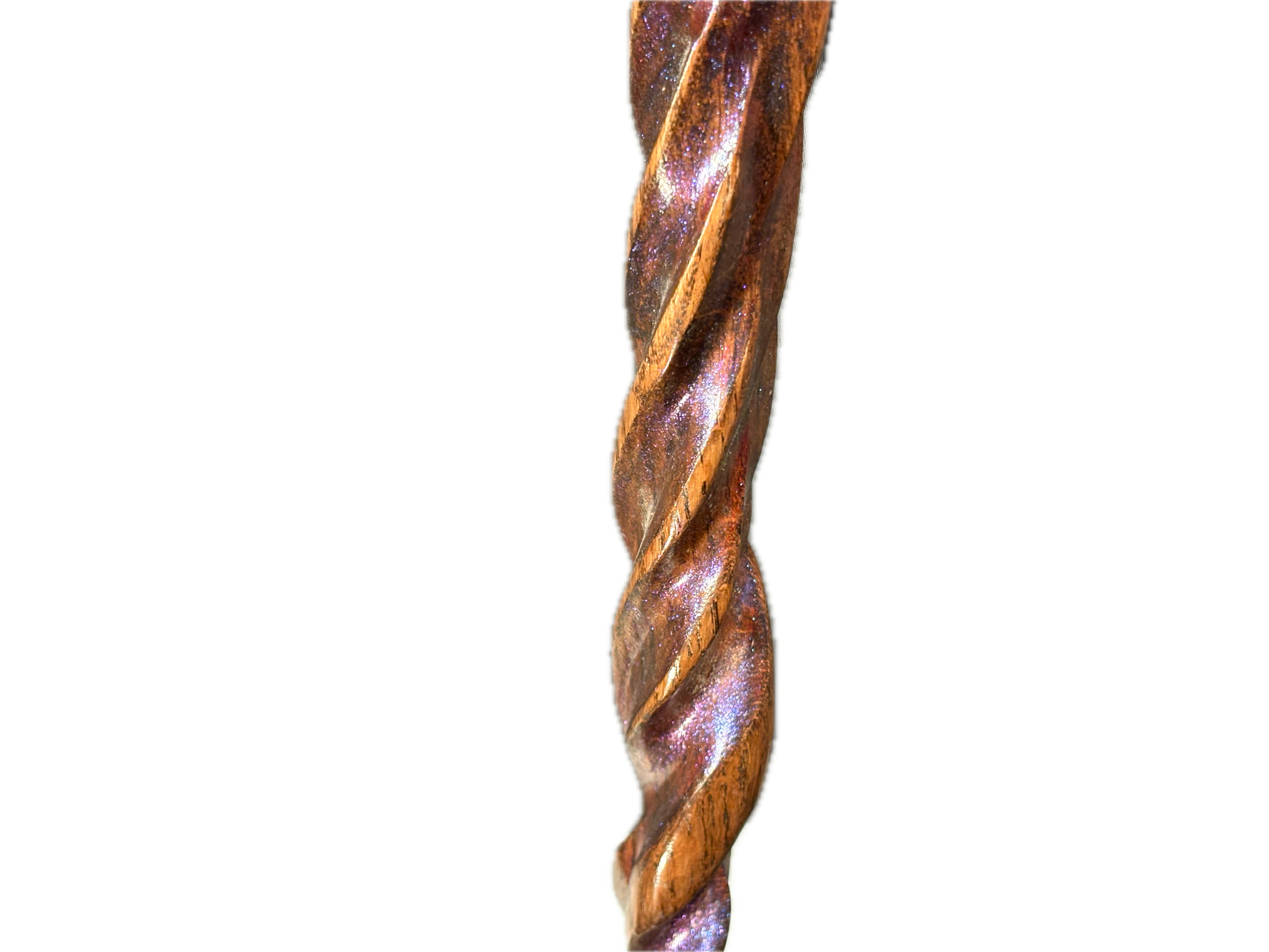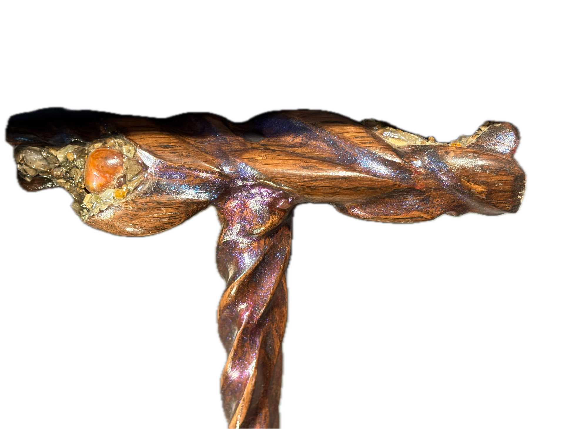 Amethyst- A red oak cane with hidden stone magic crafted from sturdy red oak, this 34 1/2 inch cane carries the subtle shimmer of an embedded amethyst and other hidden stones that catch the light just right. Measuring 1 1/4 by 1 3/4 at its widest, it offers both comfort and strength- with a quiet spark of mystery running through its core.