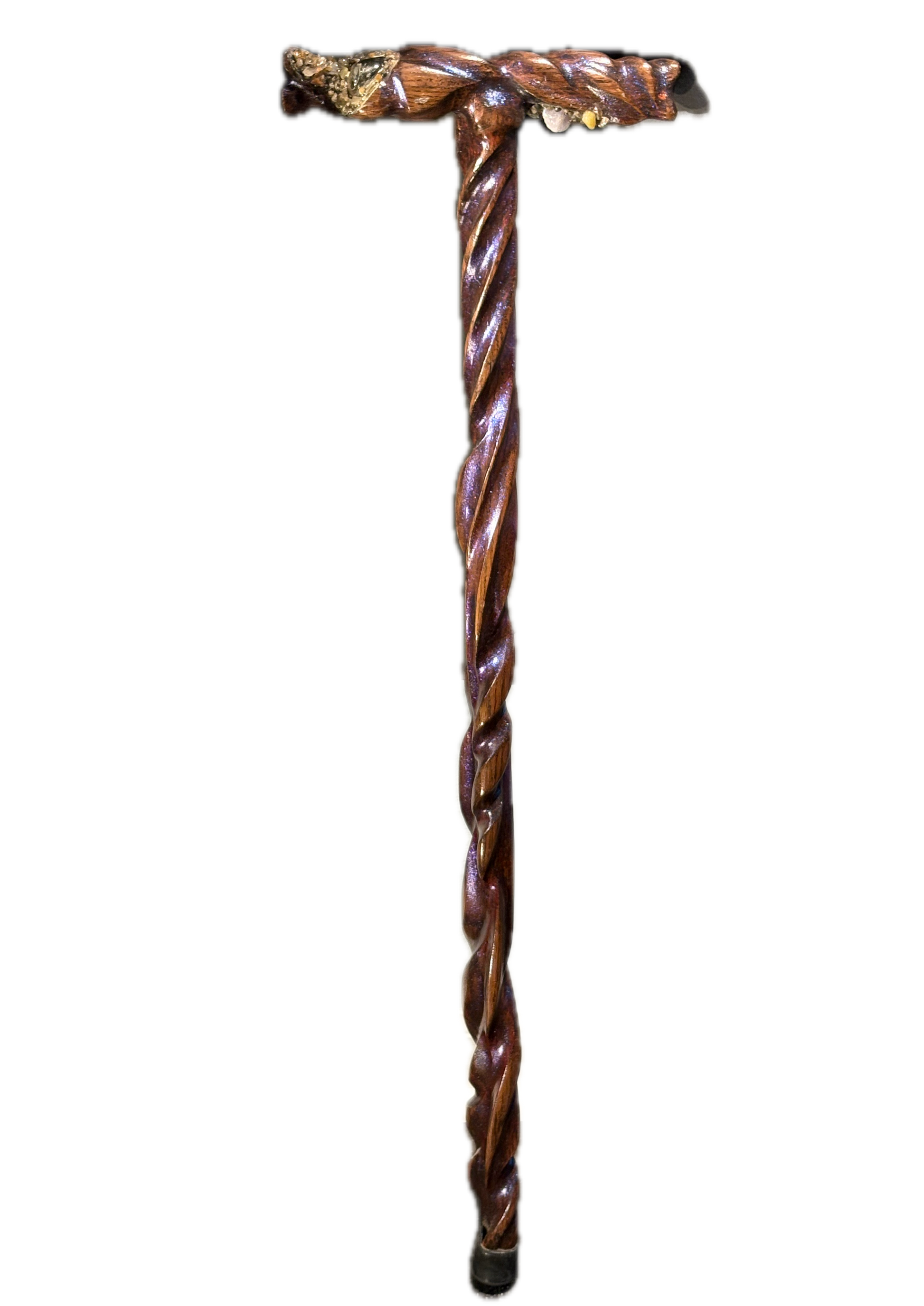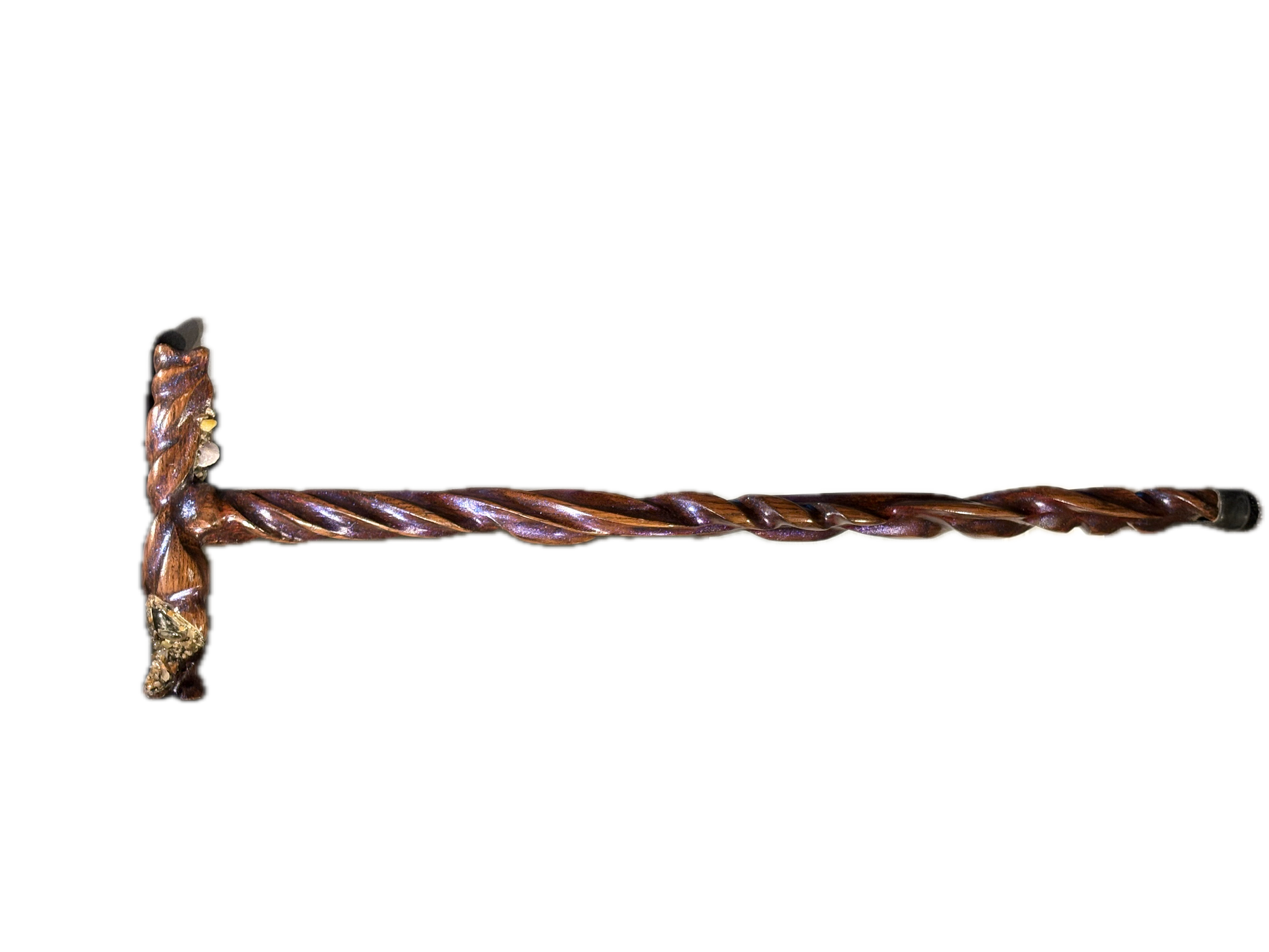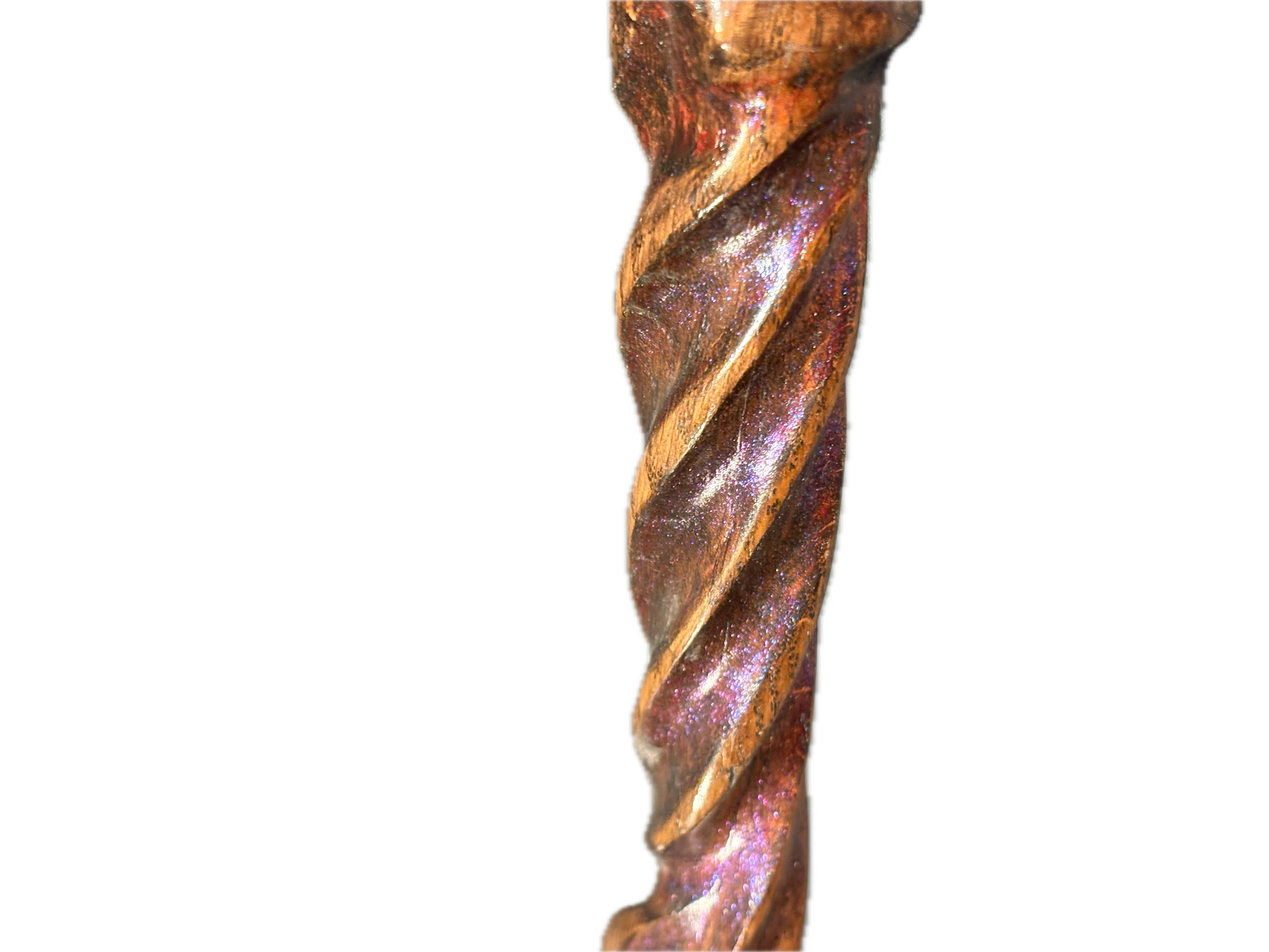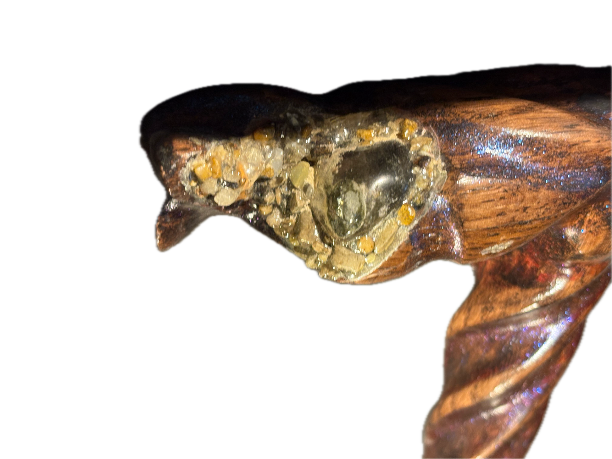 Amethyst- A red oak cane with hidden stone magic crafted from sturdy red oak, this 34 1/2 inch cane carries the subtle shimmer of an embedded amethyst and other hidden stones that catch the light just right. Measuring 1 1/4 by 1 3/4 at its widest, it offers both comfort and strength- with a quiet spark of mystery running through its core.