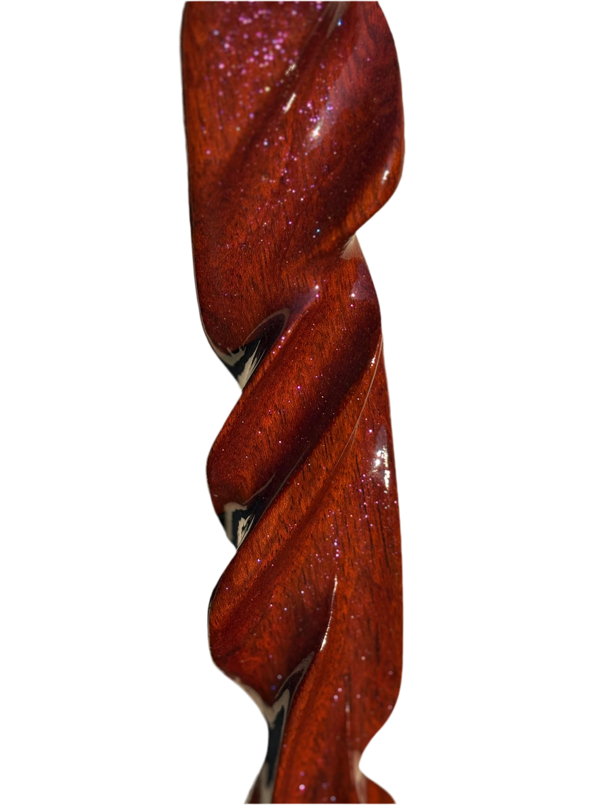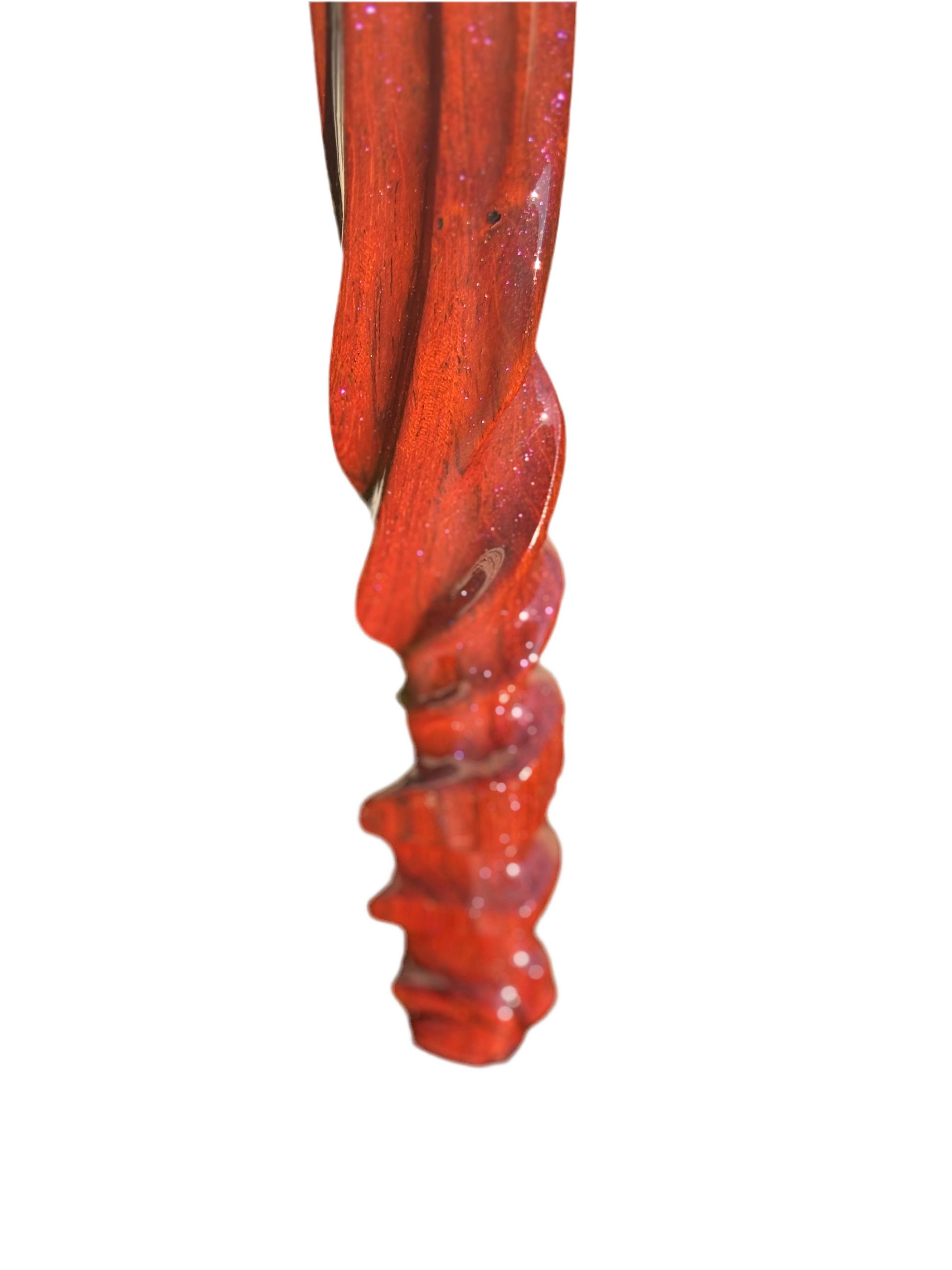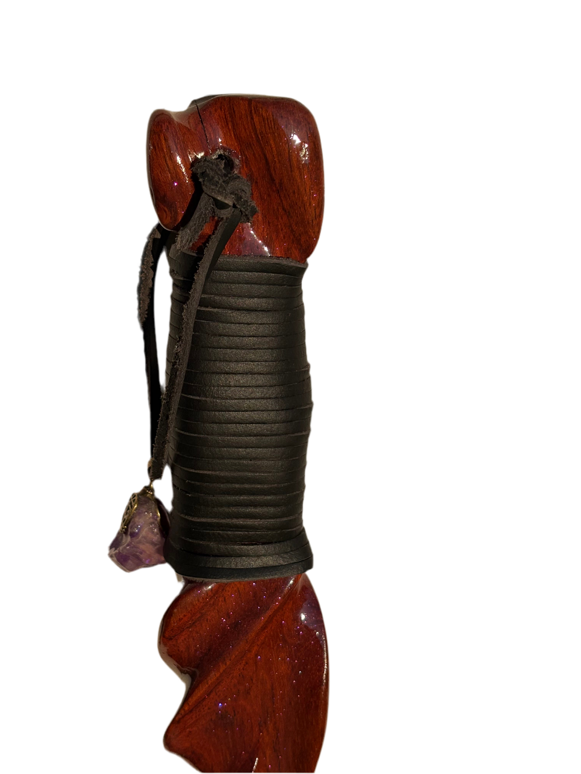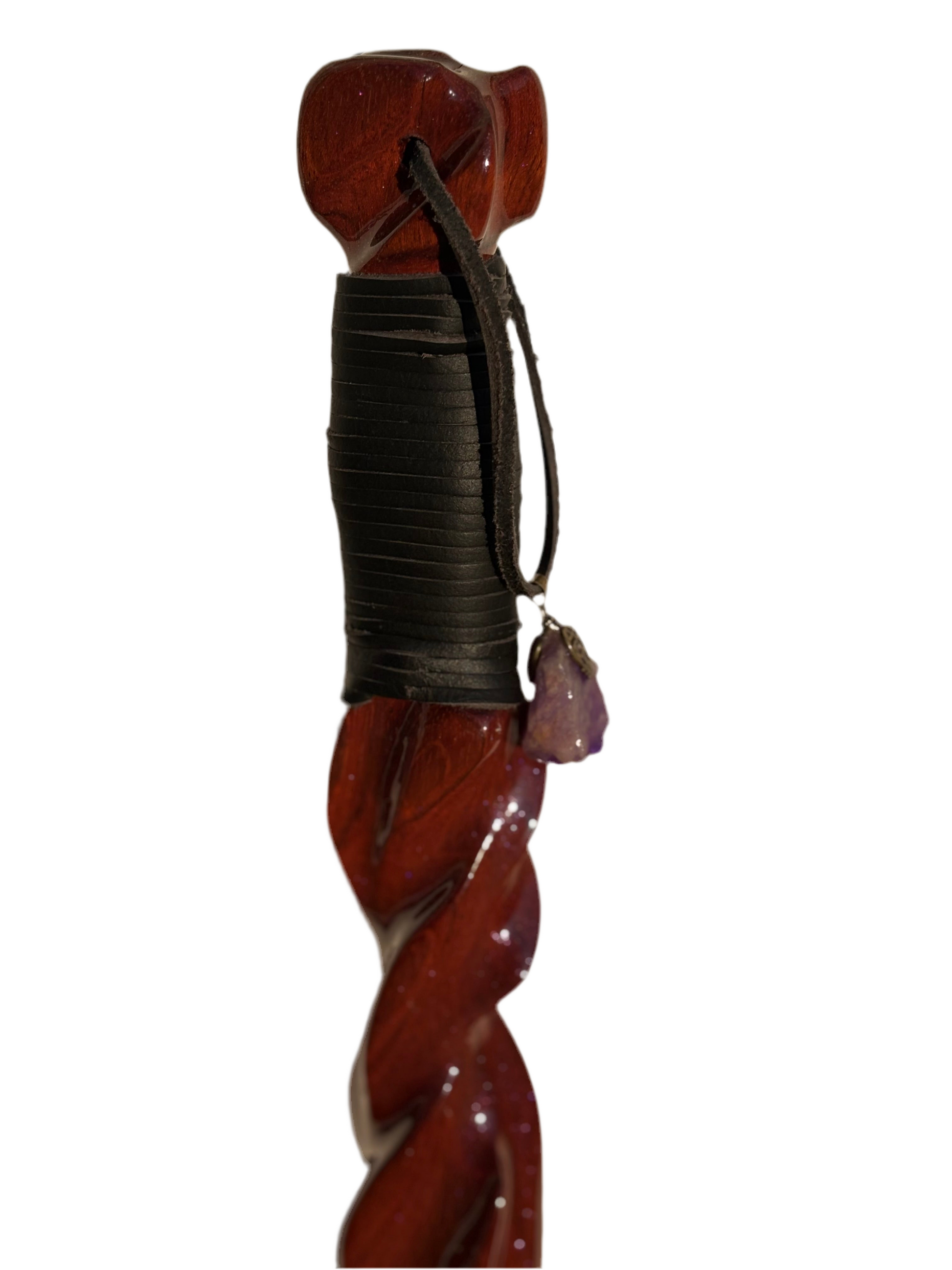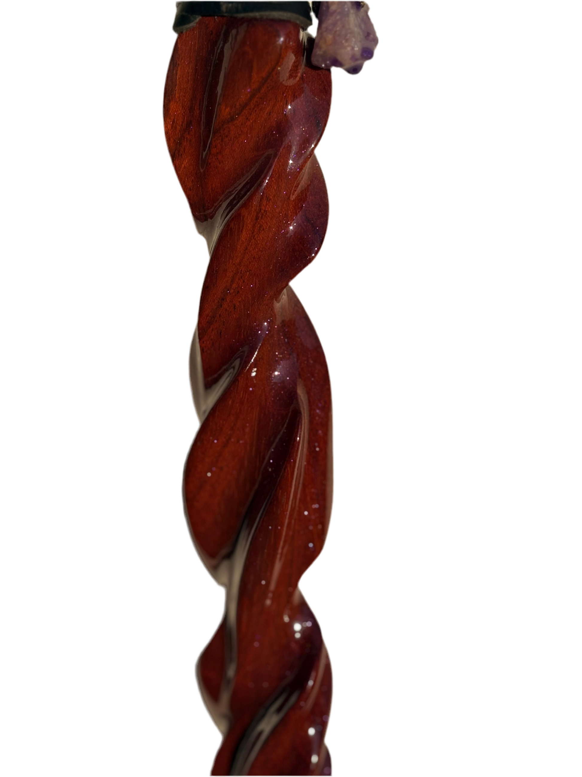 Amethyst ember- a swirl of deep crimson and soft shimmer catches the light beneath a clear epoxy finish, laced with glitter like embers suspended in glass. Topped with a natural amethyst stone, this piece balances warmth and tranquility in a sleek, hand carved design. Whether displayed or the perfect piece for you costume amethyst ember stands at 43 inches tall and 1 3/4 by 7/8 inches wide.