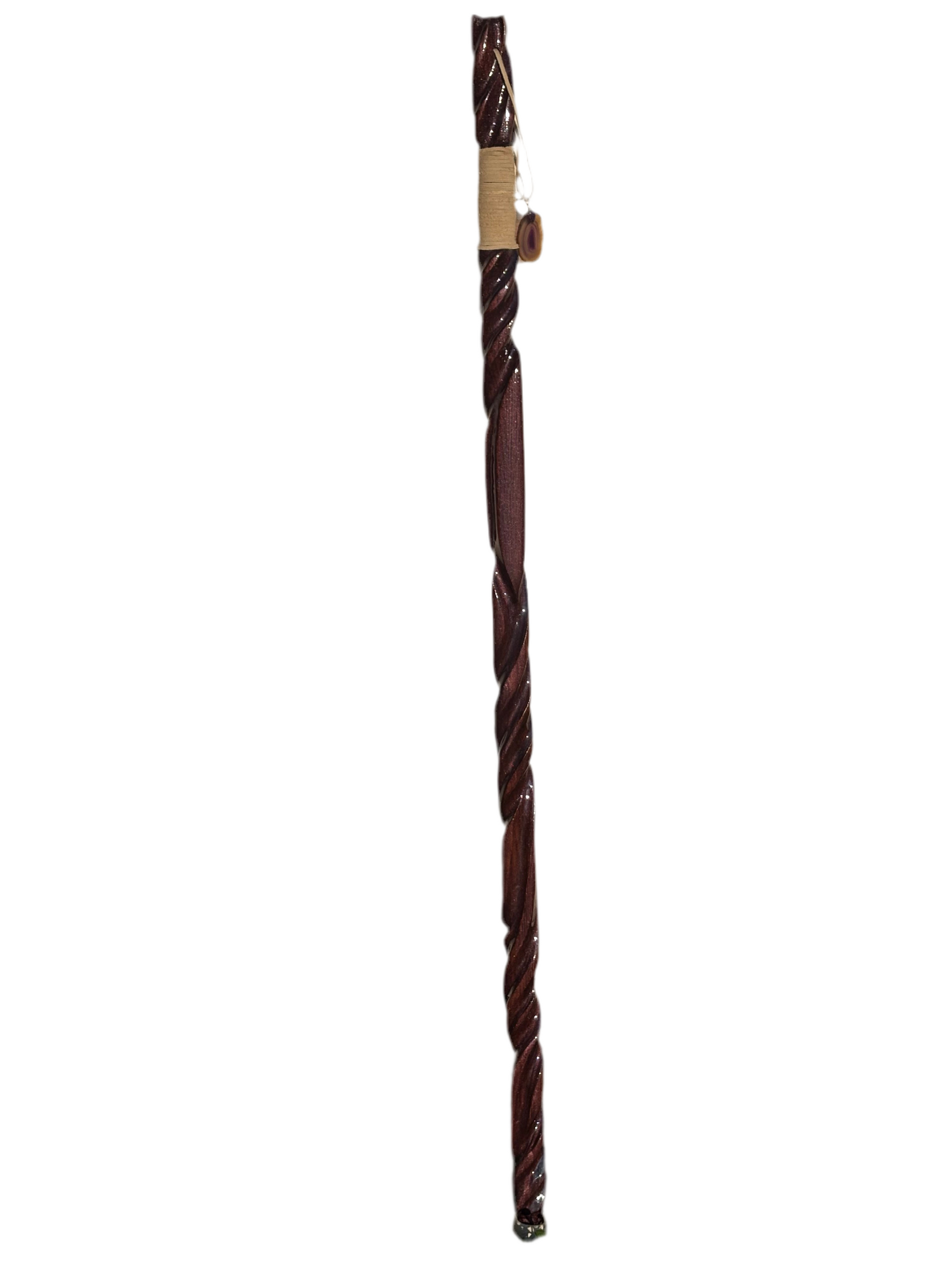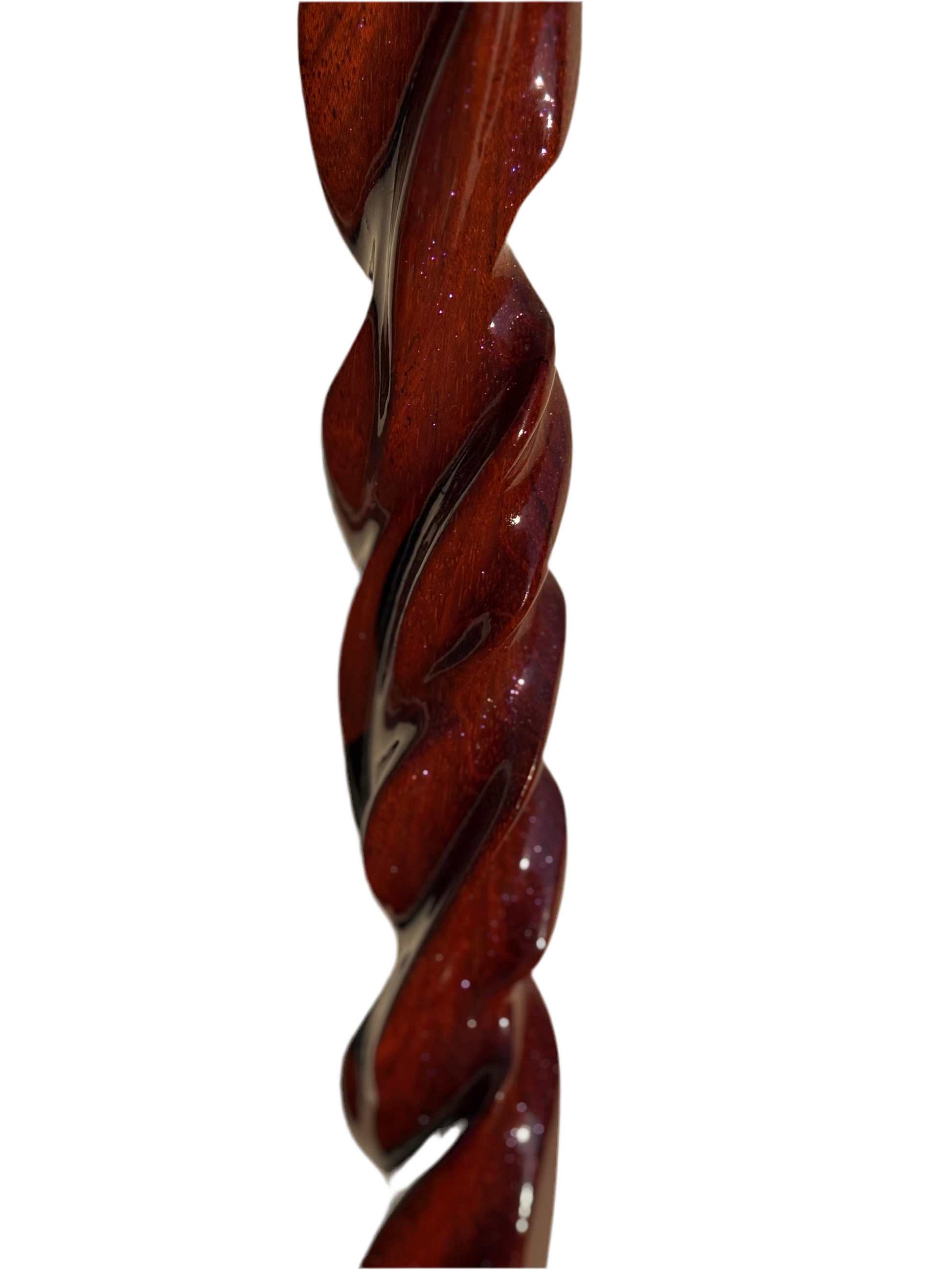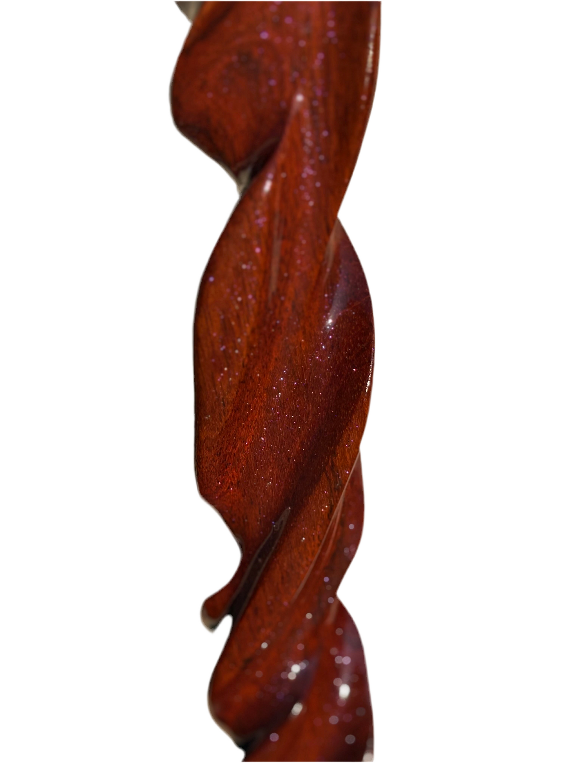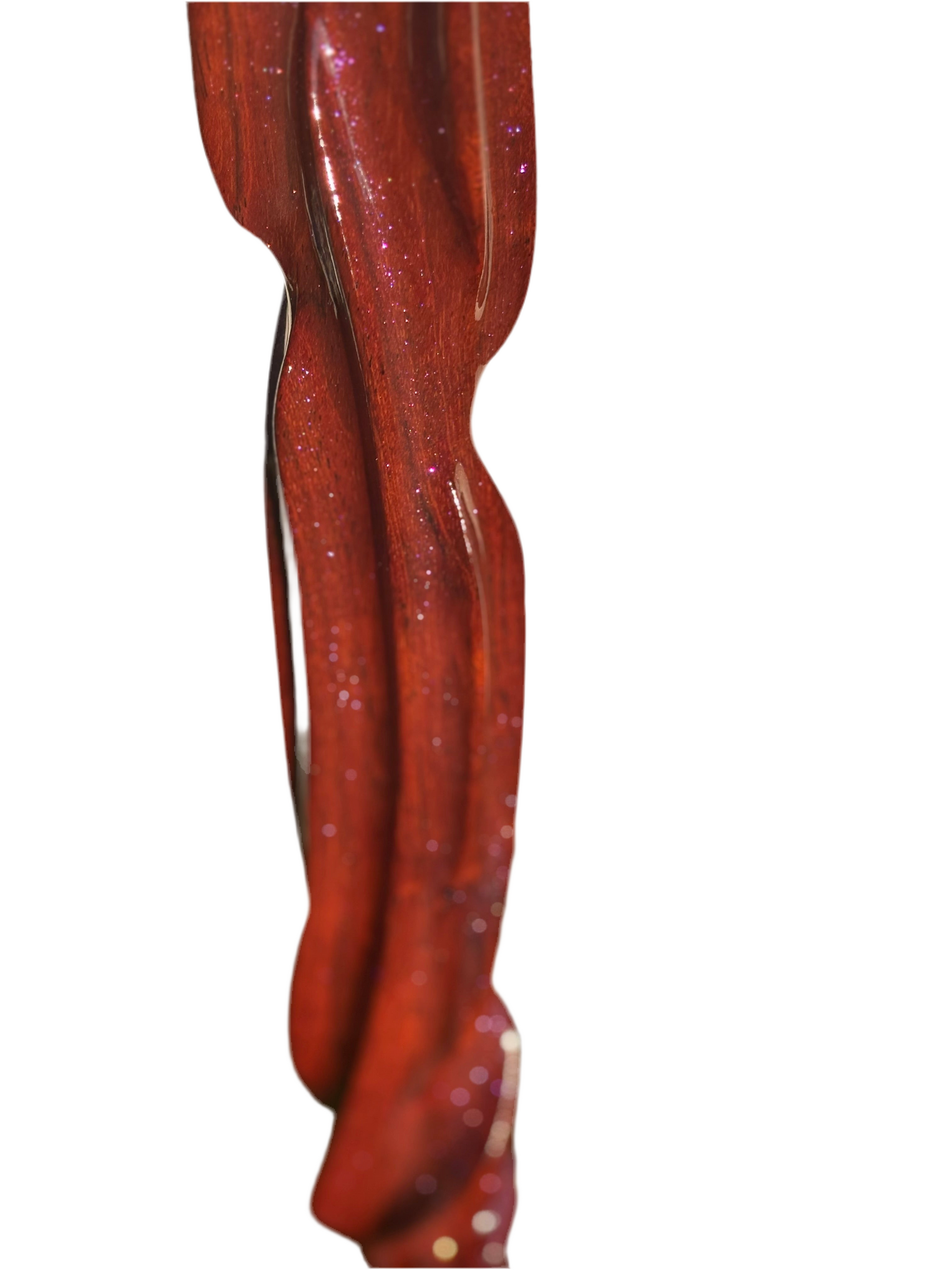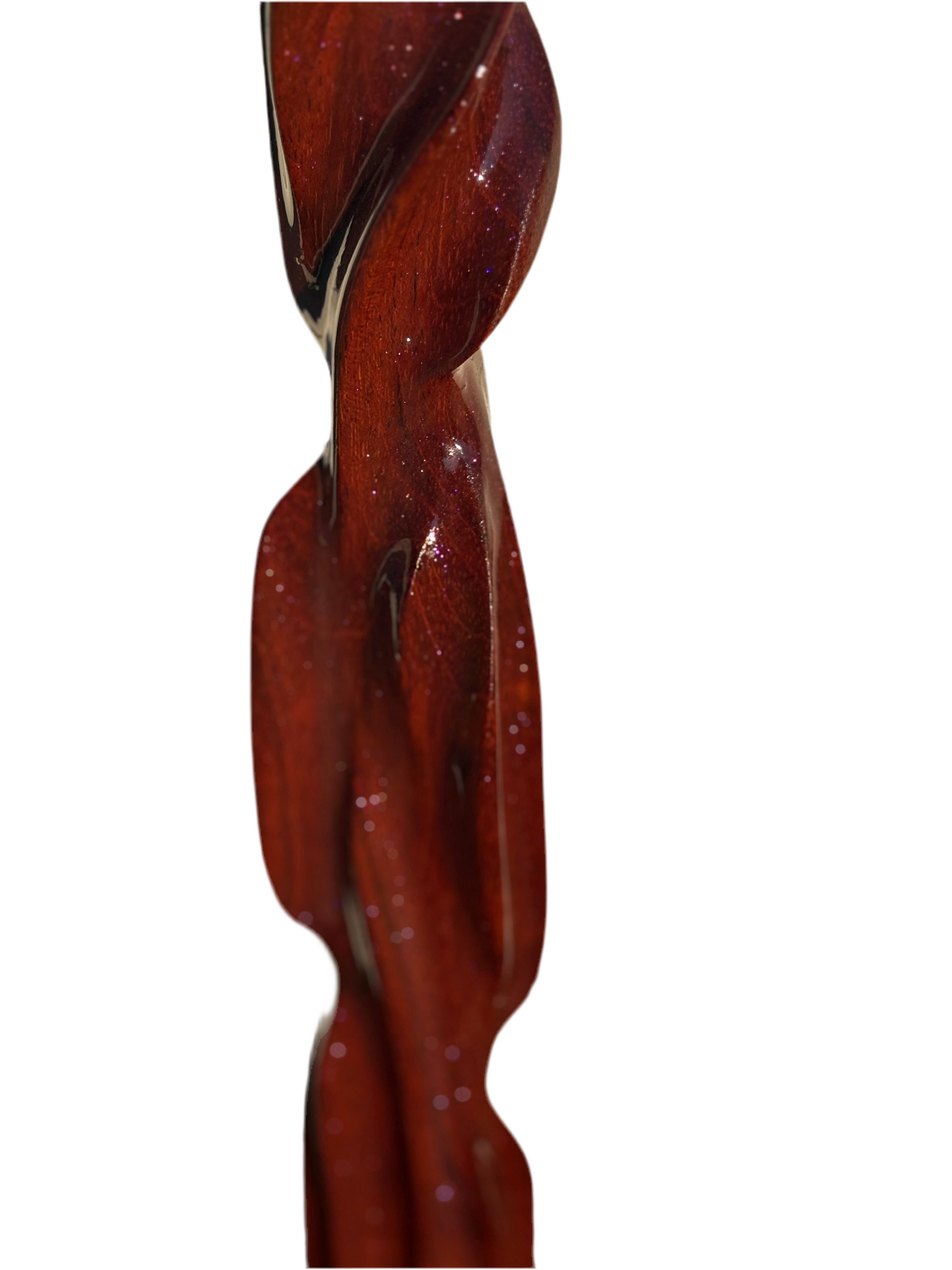 Amethyst ember- a swirl of deep crimson and soft shimmer catches the light beneath a clear epoxy finish, laced with glitter like embers suspended in glass. Topped with a natural amethyst stone, this piece balances warmth and tranquility in a sleek, hand carved design. Whether displayed or the perfect piece for you costume amethyst ember stands at 43 inches tall and 1 3/4 by 7/8 inches wide.
