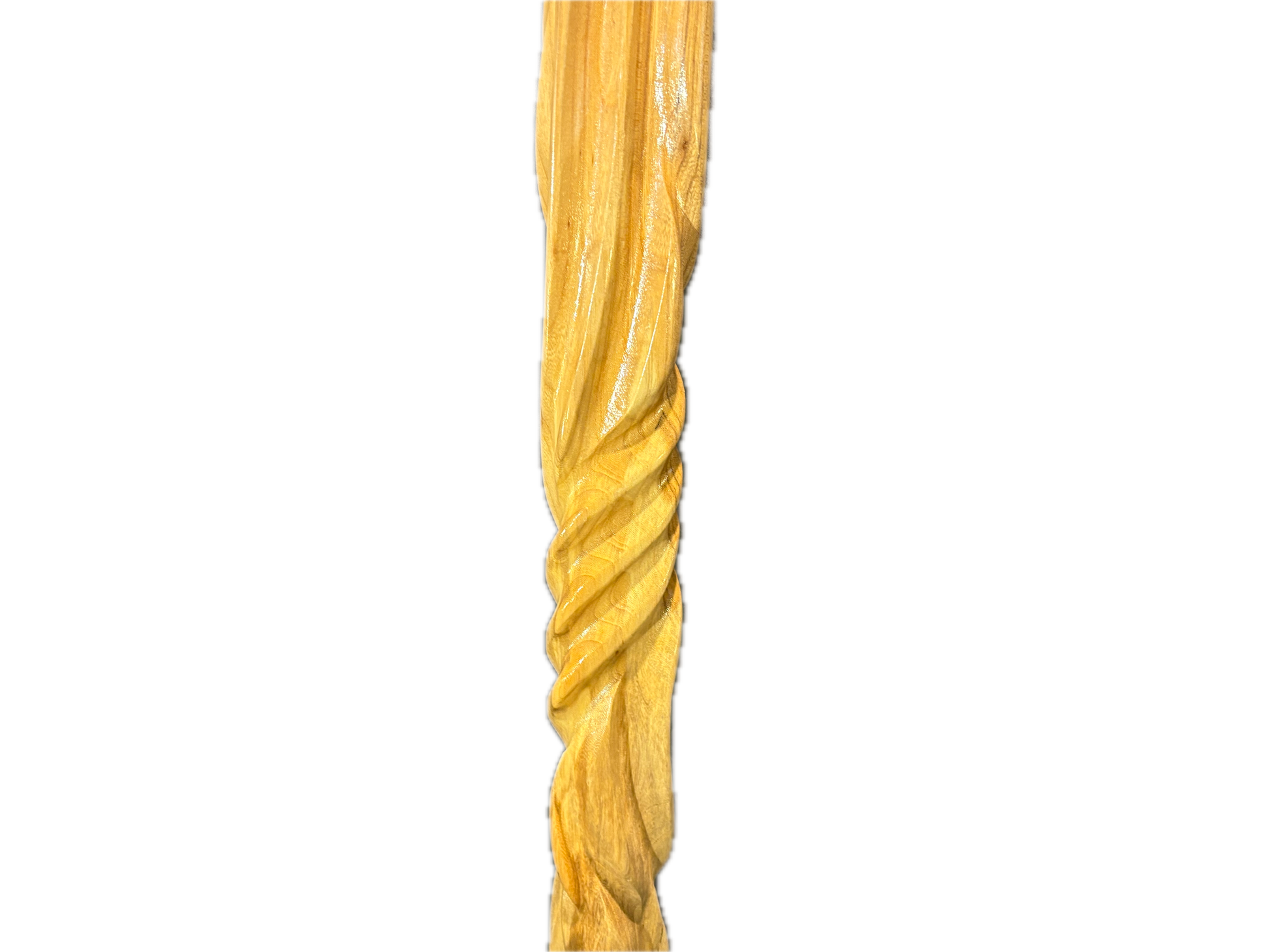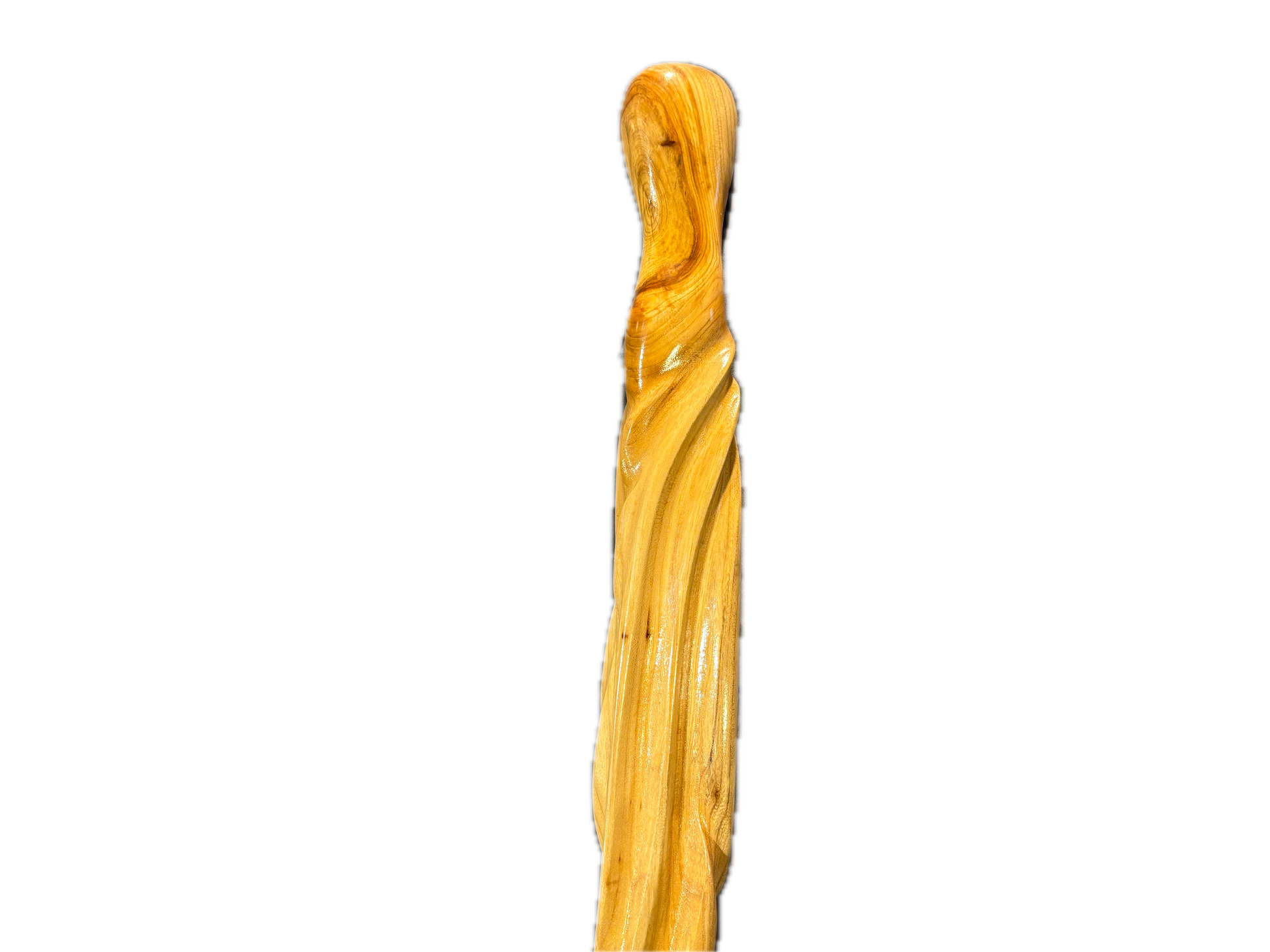 Big sly hickory was carved from hearty hickory and polished to reveal its , wild natural grain , big sly is a staff with presence. Its twisted shaft coils with quiet strength , as if shaped by time and mischief rather than hand tools.big sly hickory is 41 3/4 tall and 2 1/2 by 1 1/2.
