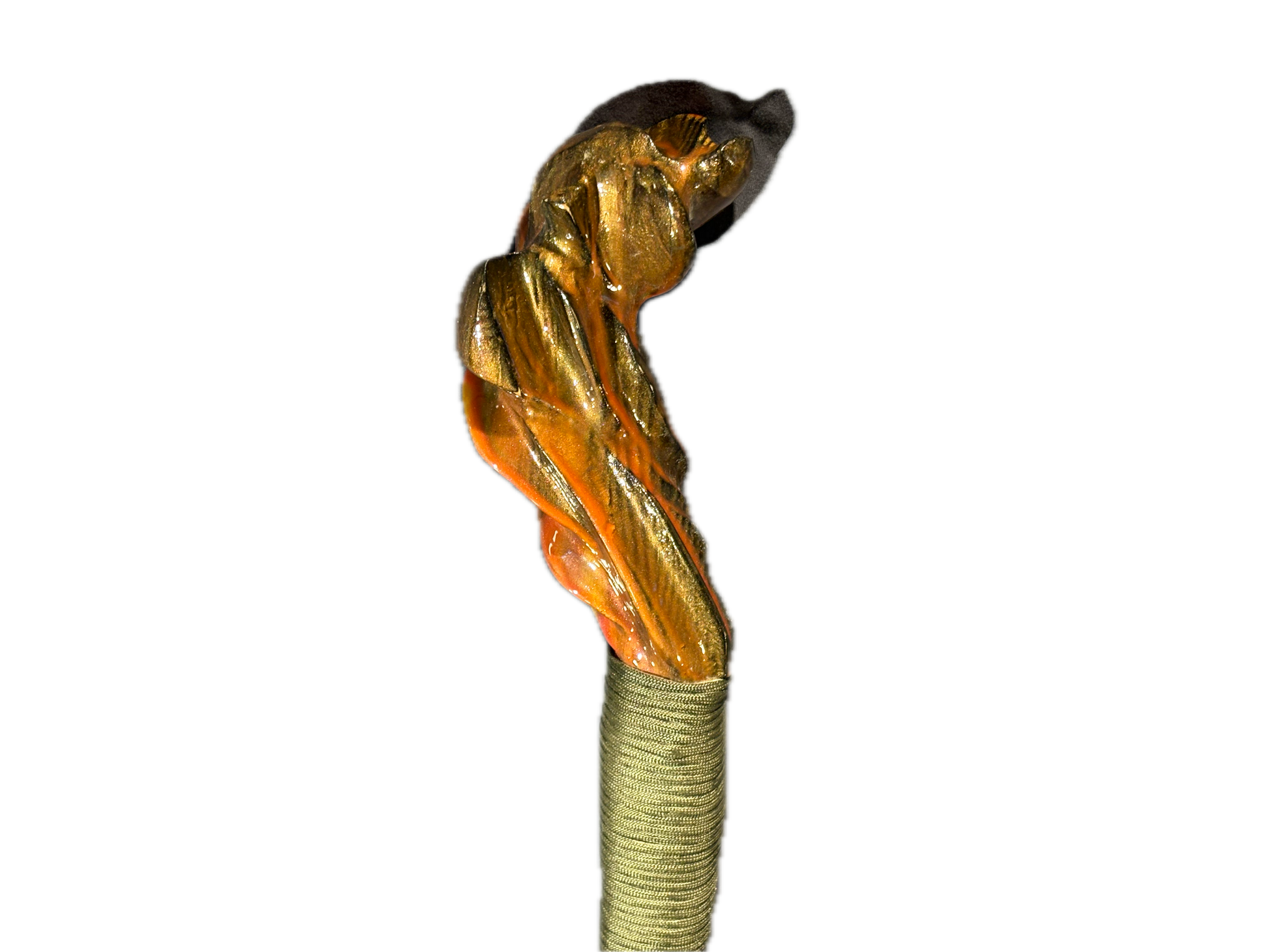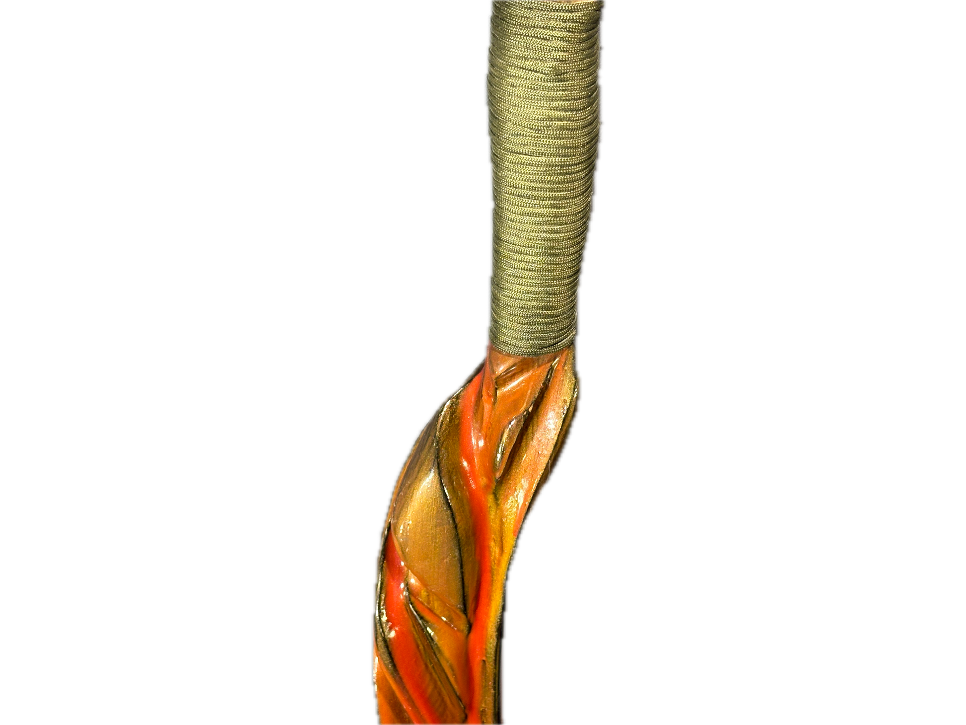 Blaze grain- The ember crafted staff flame -toned and boldly twisted , blaze grain-stands 44 inches tall with a stout 2 3/4 by 2 1/2 inch frame. Carved from yellow pine and finished to a smoldering sheen made from epoxy.It’s a peice that commands attention-sturdy stylish , and sparked with personality.