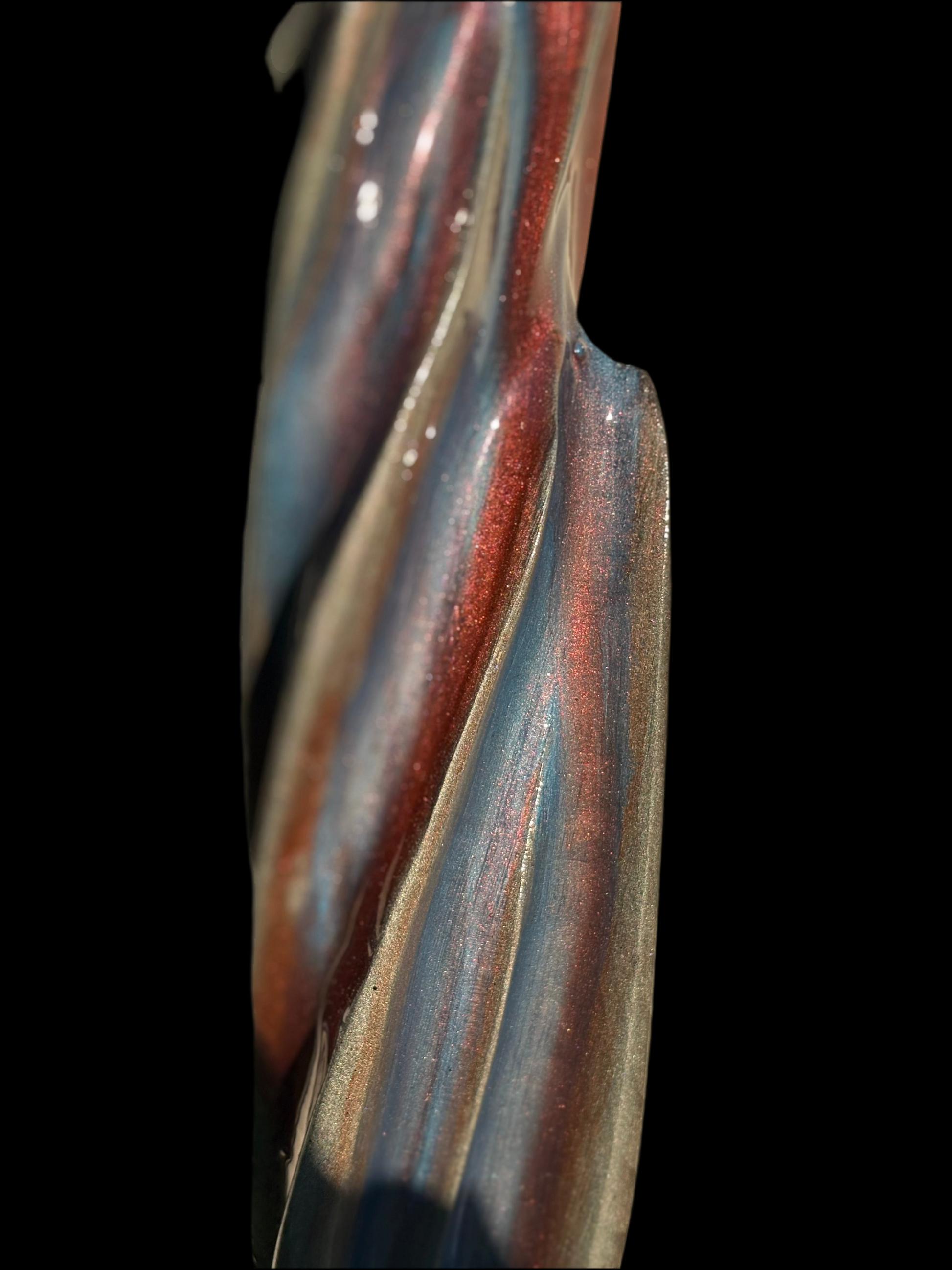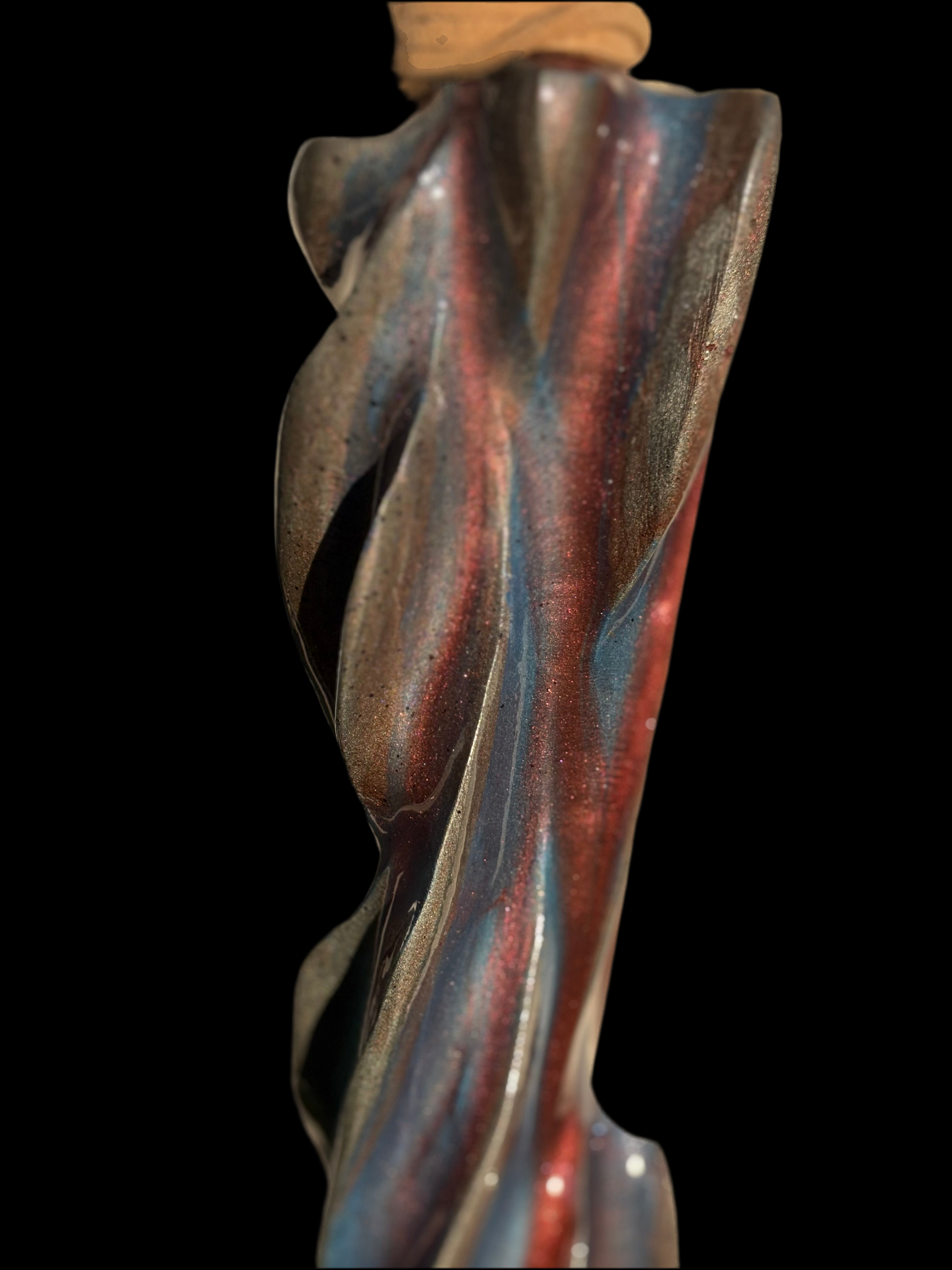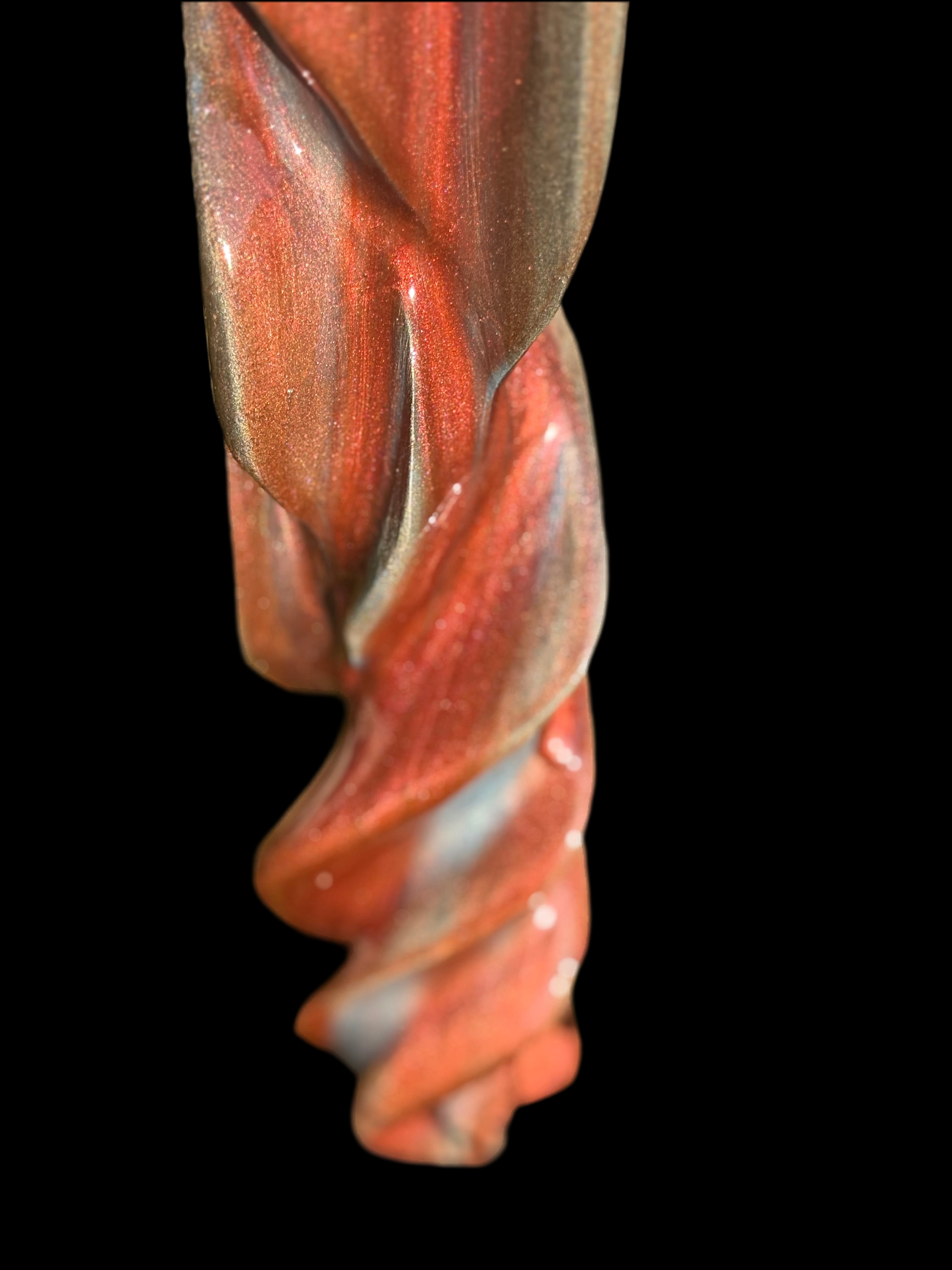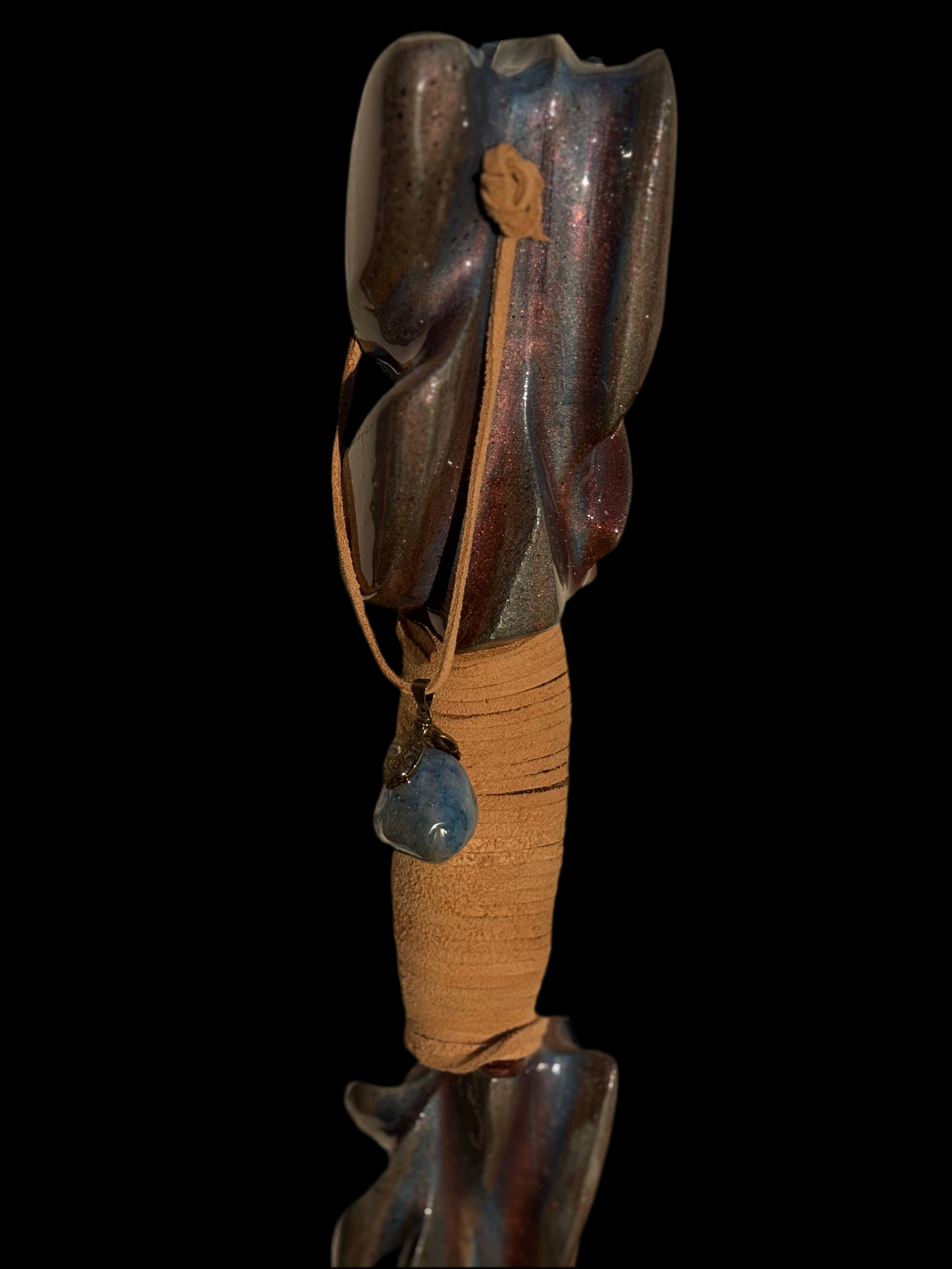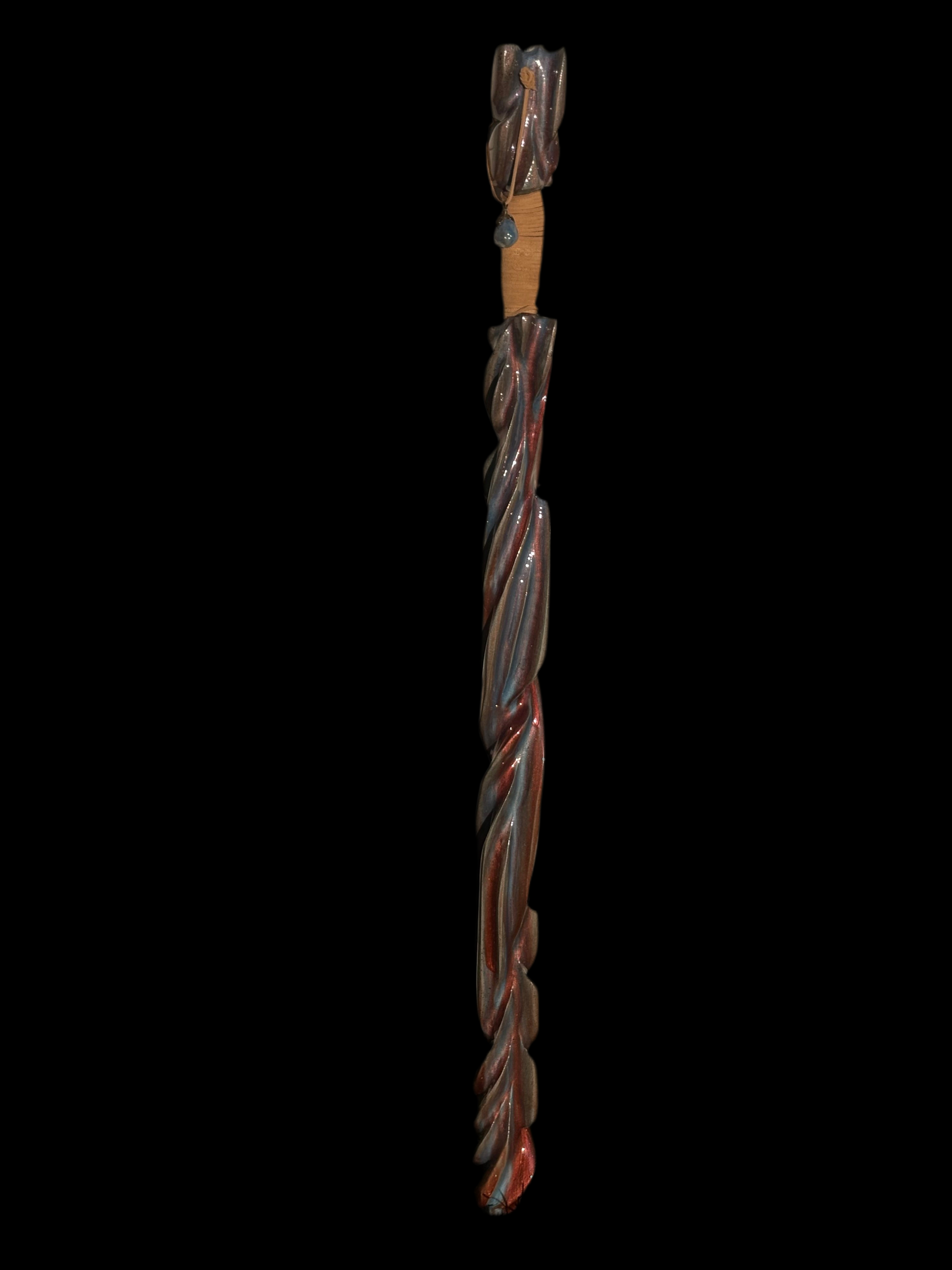 Blaze rune- crackling with the pulse of elemental fire, this twisted red and blue staff bears the mark of a flame rune at its wrapped leather hilt. Metallic shimmer meets mystical grit.Blaze rune stands at 44 inches tall and is 2 1/4 by 1 1/4 inches wide.