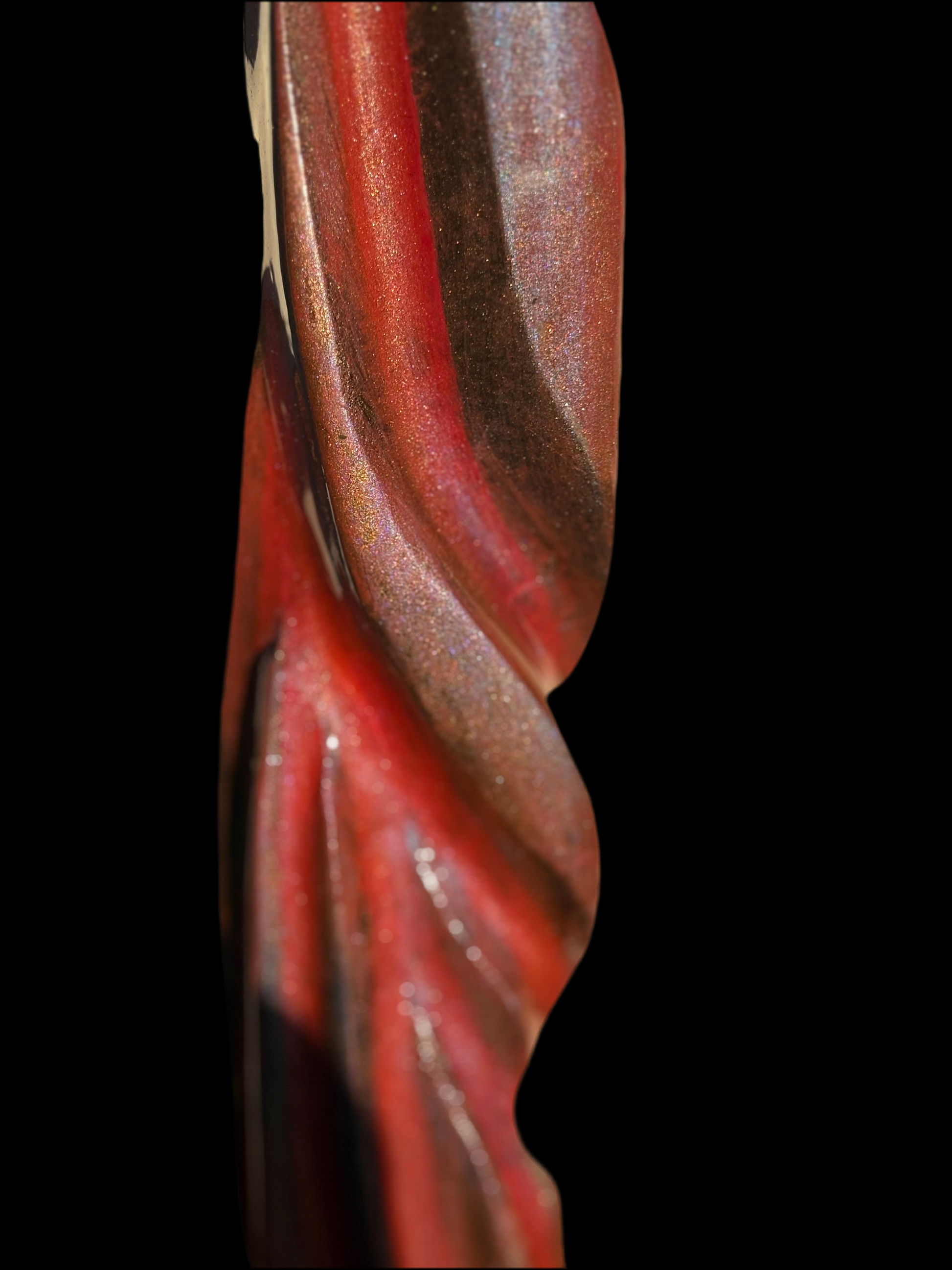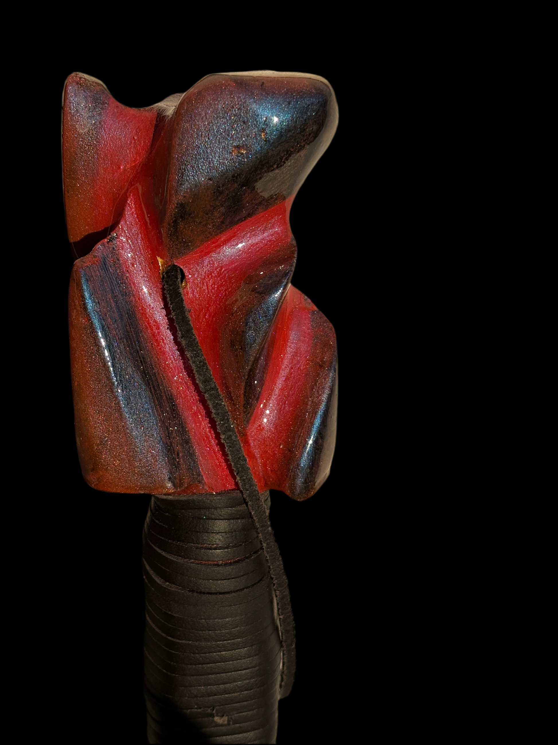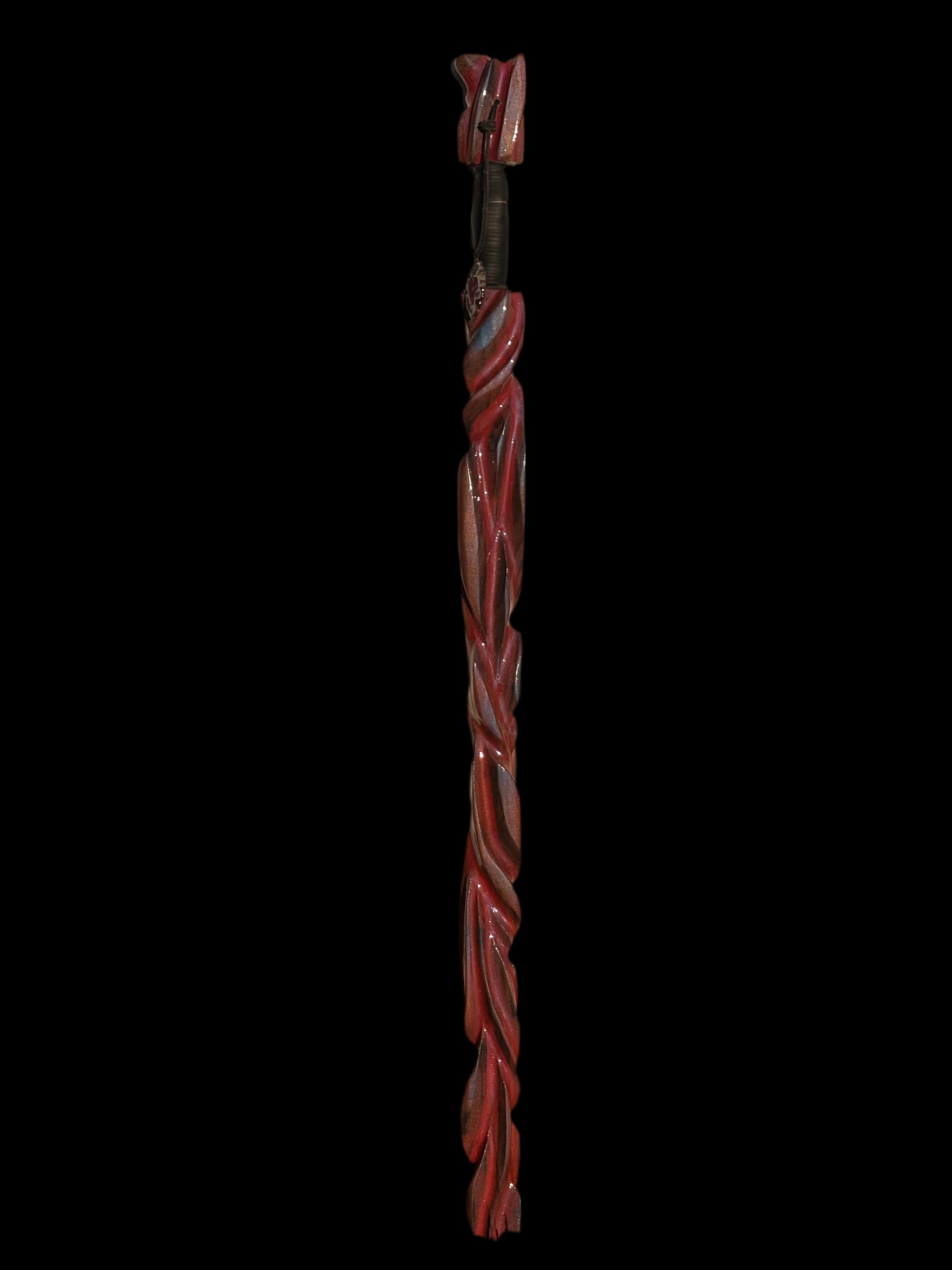 Blood Grain- Twisted with fire and finesse, this crimson- glossed staff reveals the raw beauty of its wood grain- like veins of ancient power sealed in epoxy.a bold, decorative piece for collectors and costume adventurers.Blood Grain stands at 44 1/2 inches tall and is 2 1/4 by 1 inches wide.
