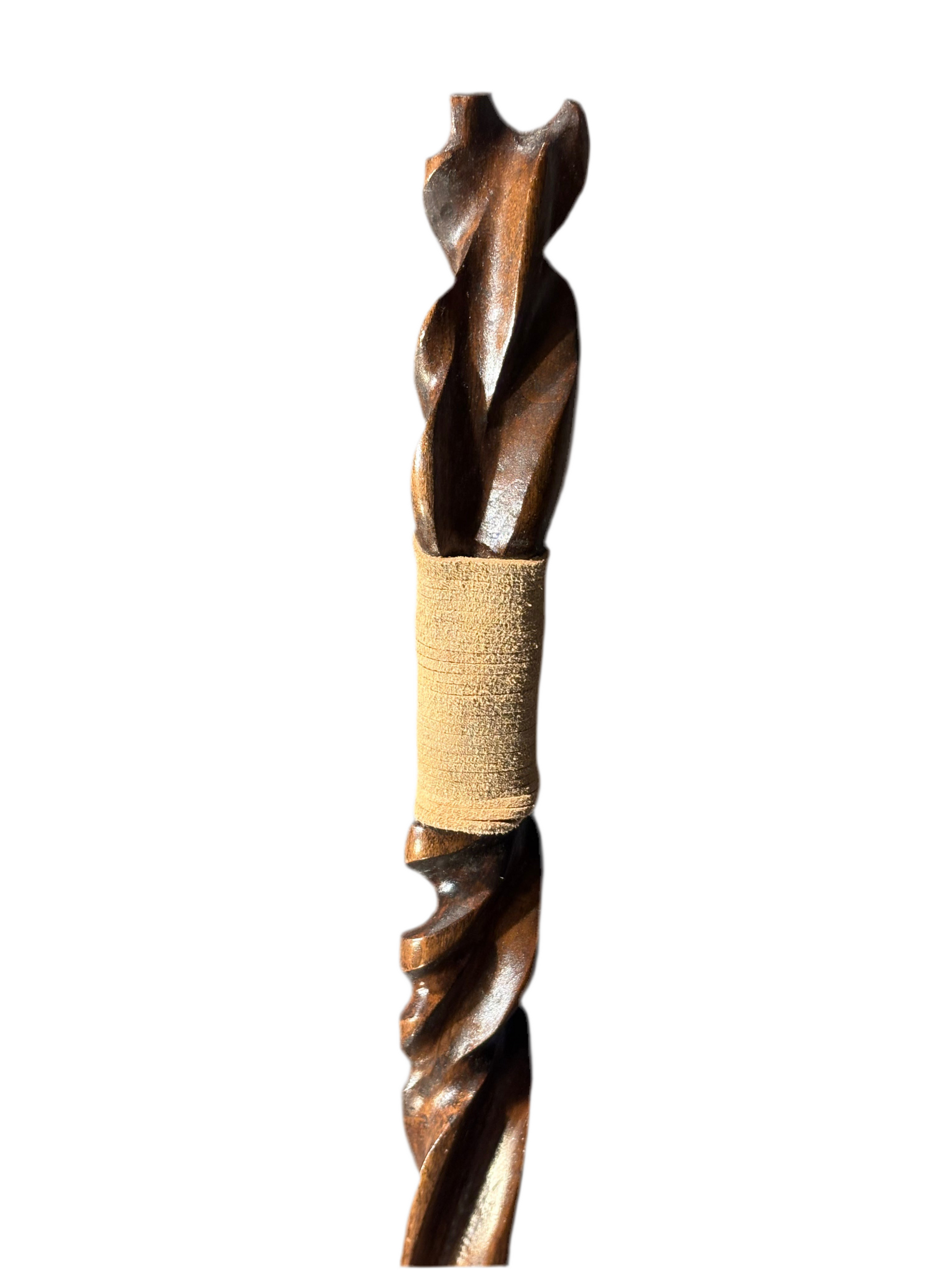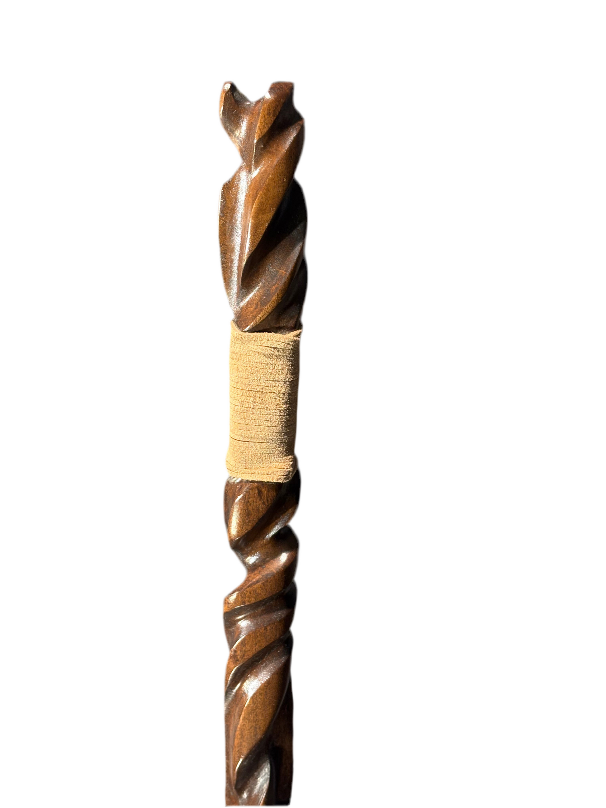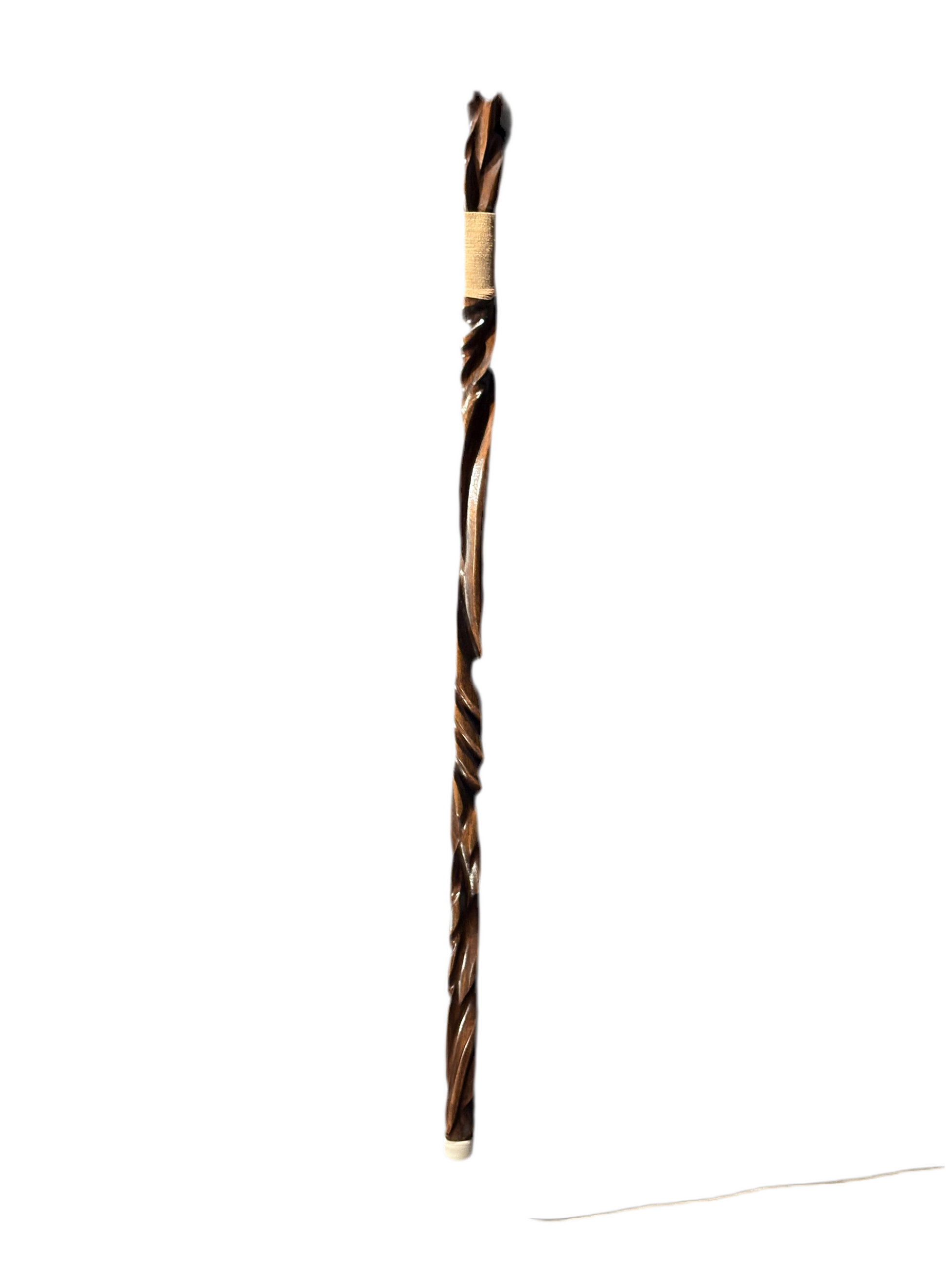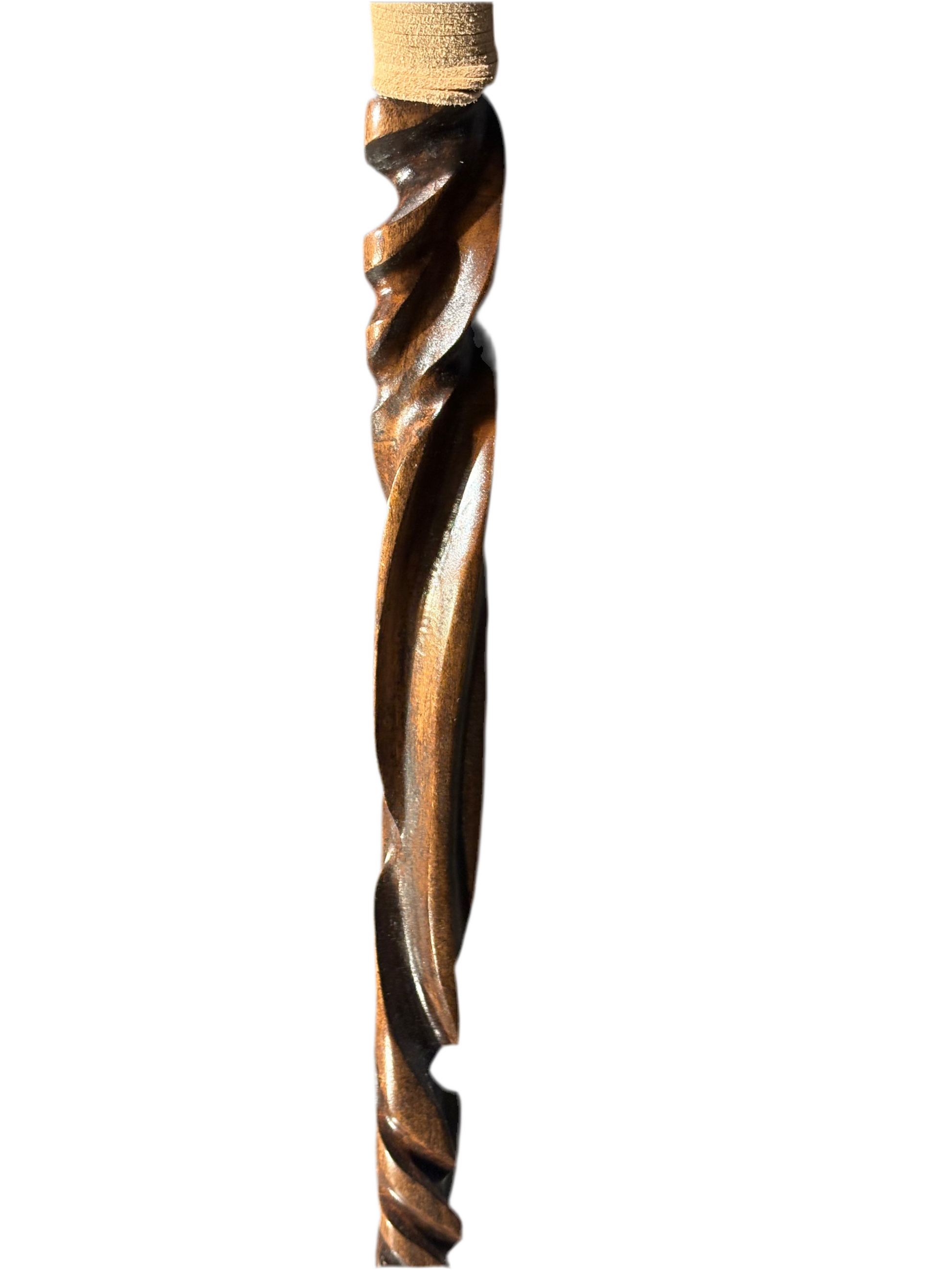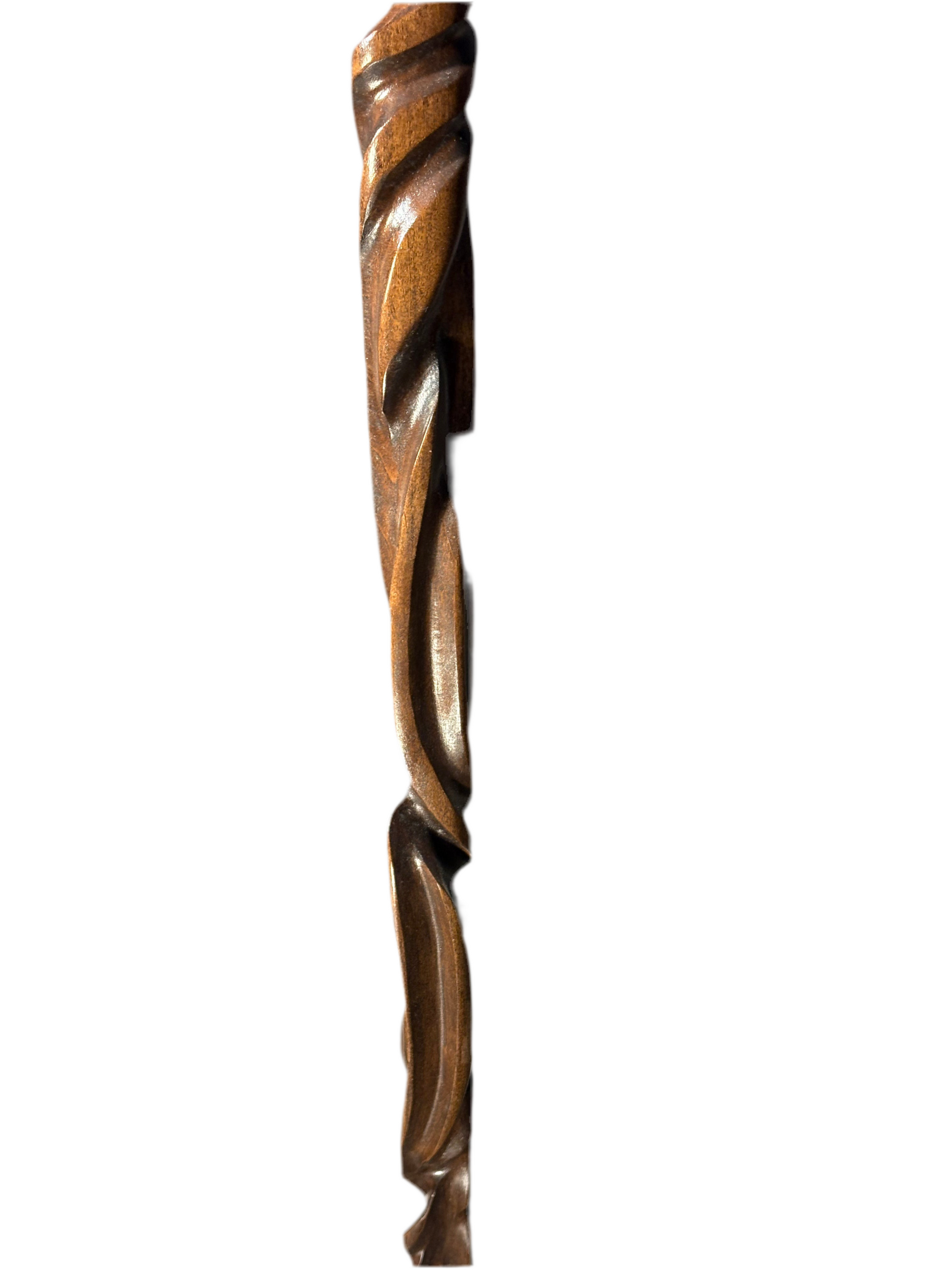 Doe- light as a whisper and carved with gentle elegance, this walking stick carries the quiet strength of the forest. Its delicate twist and airy weight make it a graceful companion for any path. Doe stands at 48 1/2 tall and is 1 1/2 by 1 1/2 inch’s wide and made from poplar.