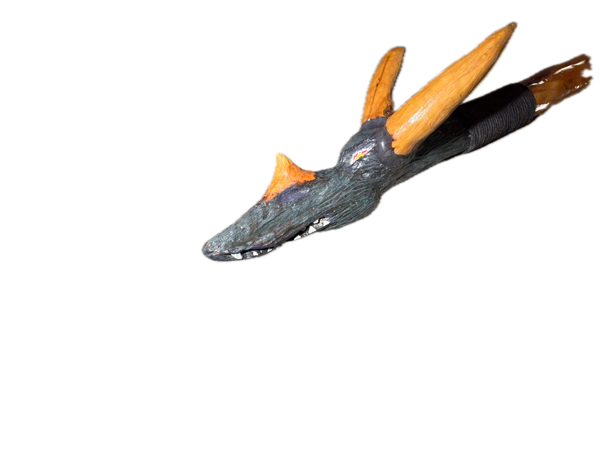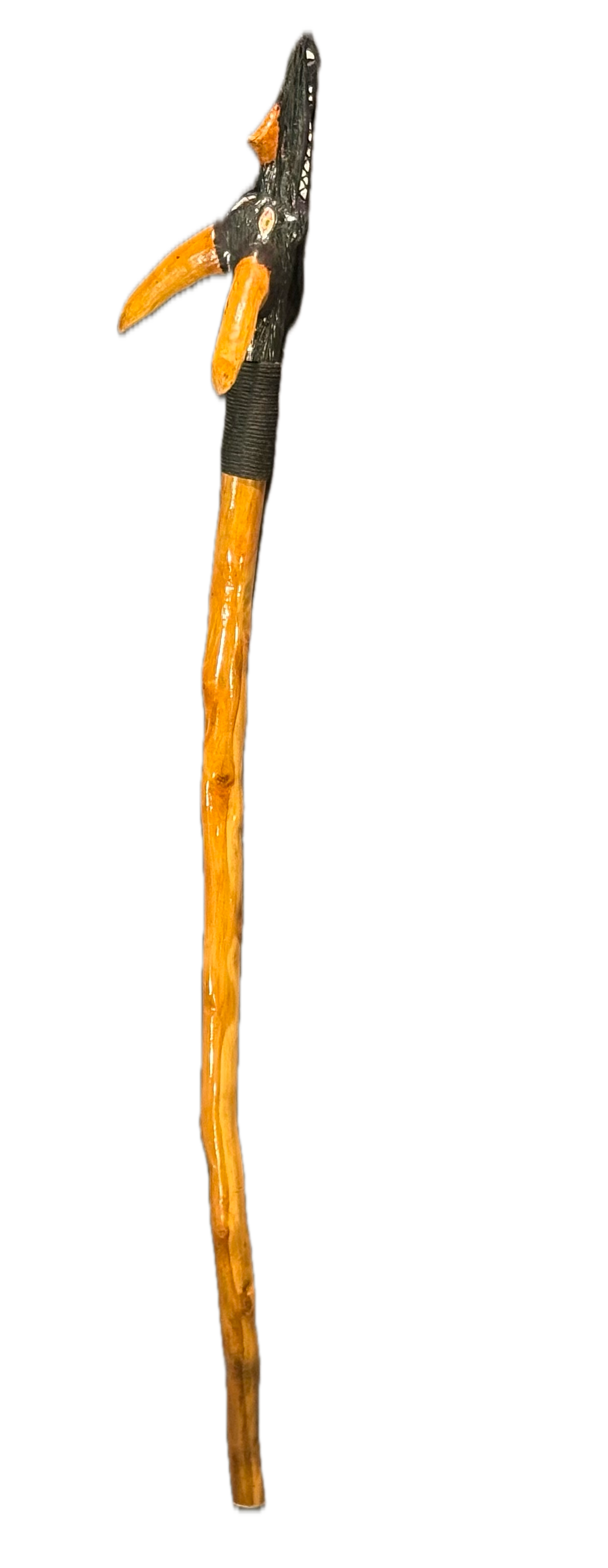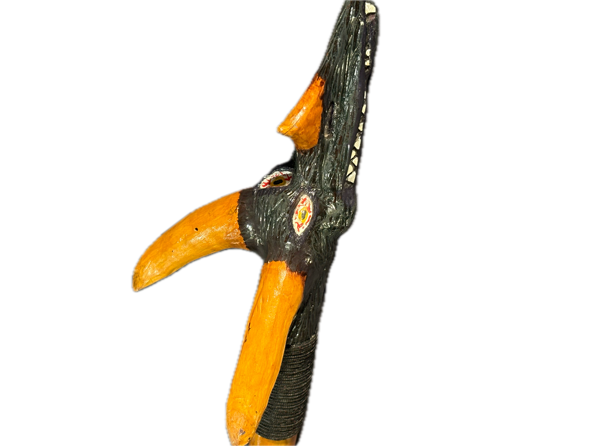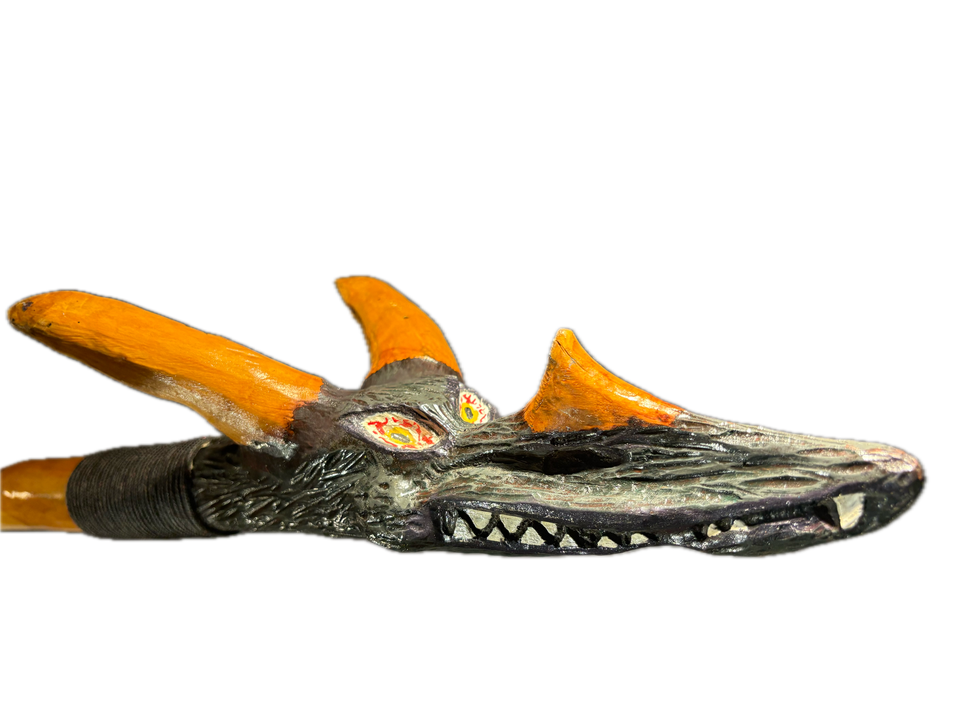 Drayco was forged from imagination that embodies the sport of a fiery dragon sentinel. Its carved head , painted in a bold dark green scales with a piercing white eyes and fanged teeth. Drayco is 50 inches tall.