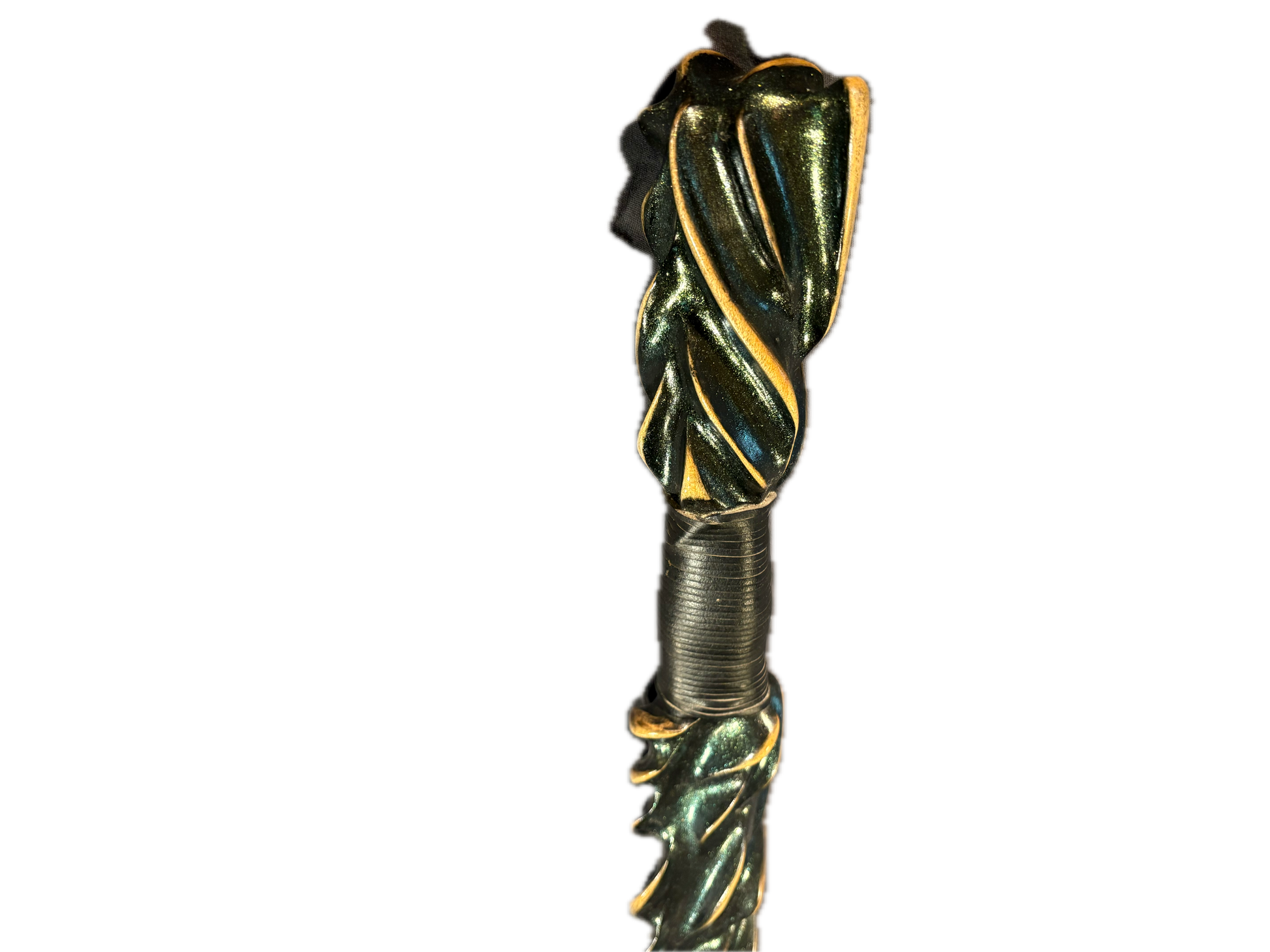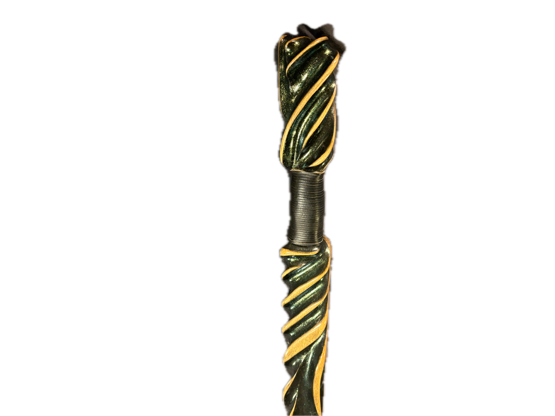 Emerald is a hand-carved staff that dazzle’s with the mystique of enchanted forest and precious stones. Its deep metallic green finish catches the light with every turn , while golden highlands trace the curves of its twist , adding a regal air to its presence. Emerald is 54 inches tall and it is 2 1/2 by 1 1/2 wide , and is made out of maple wood.