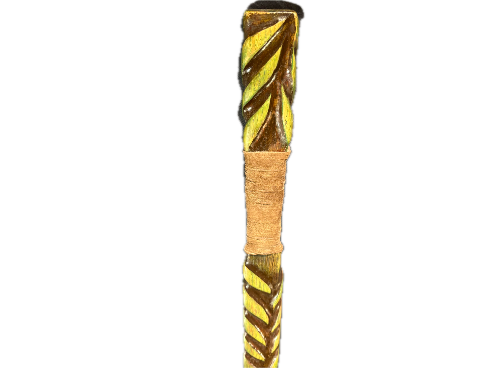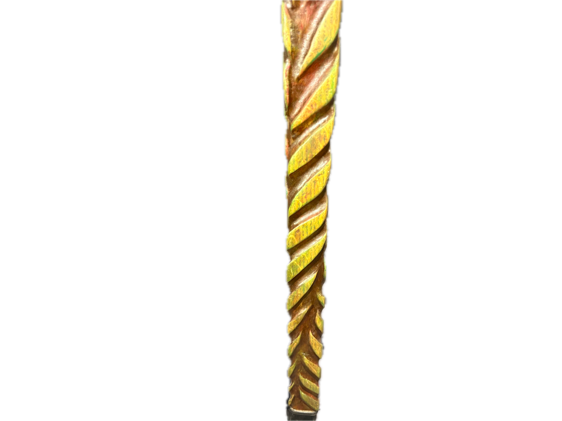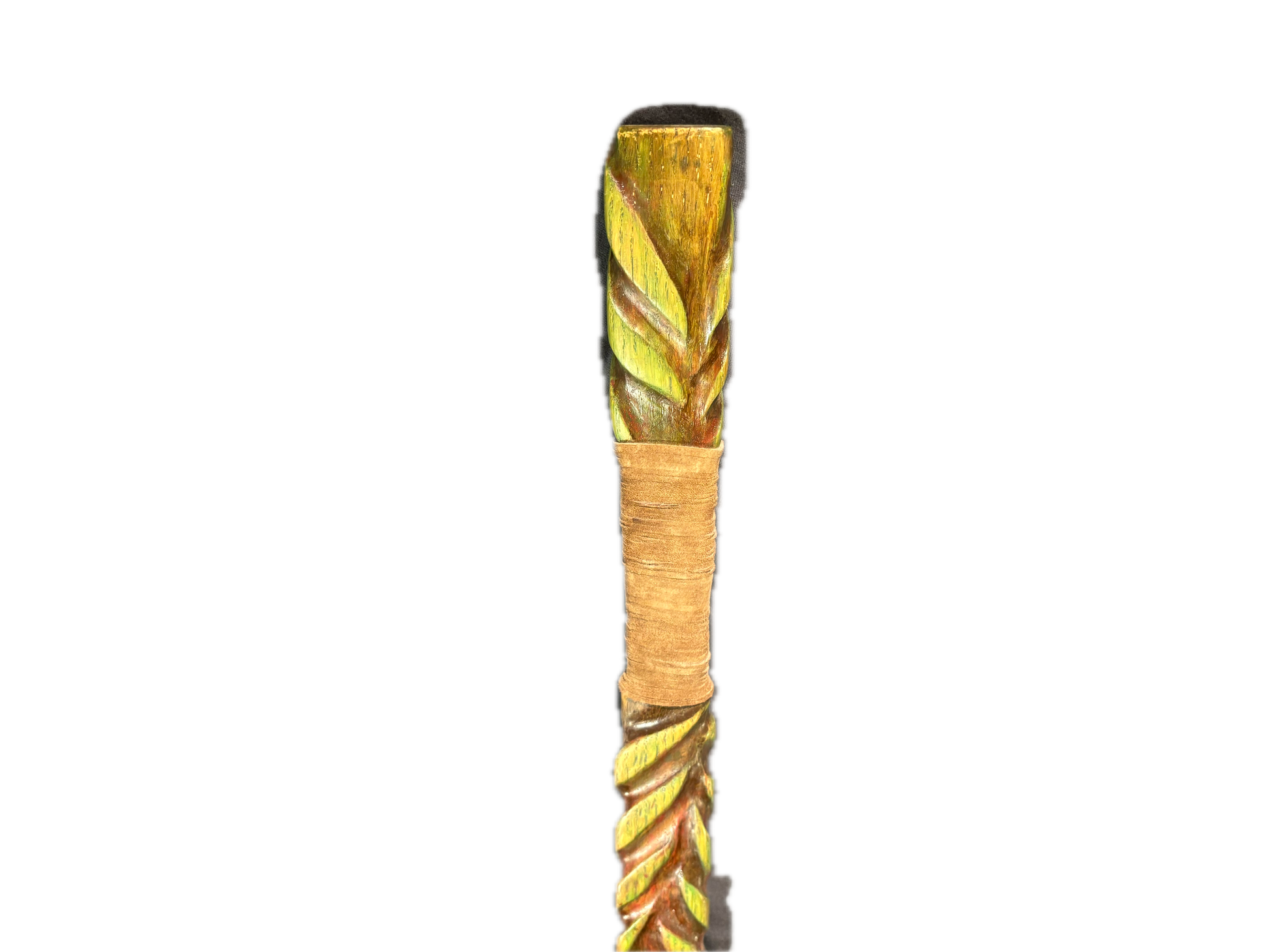 Verdant coil- The grove born staff with carved leaf work twisting up its length and a green finish that echoes fresh growth , verdant coil feels more grown than made. It’s a staff that channels the calm power of the woods- vibrant , rooted , and full of quit life.verdant coil stands at 60 3/8 tall and is 1 3/4 by 1 inches wide.