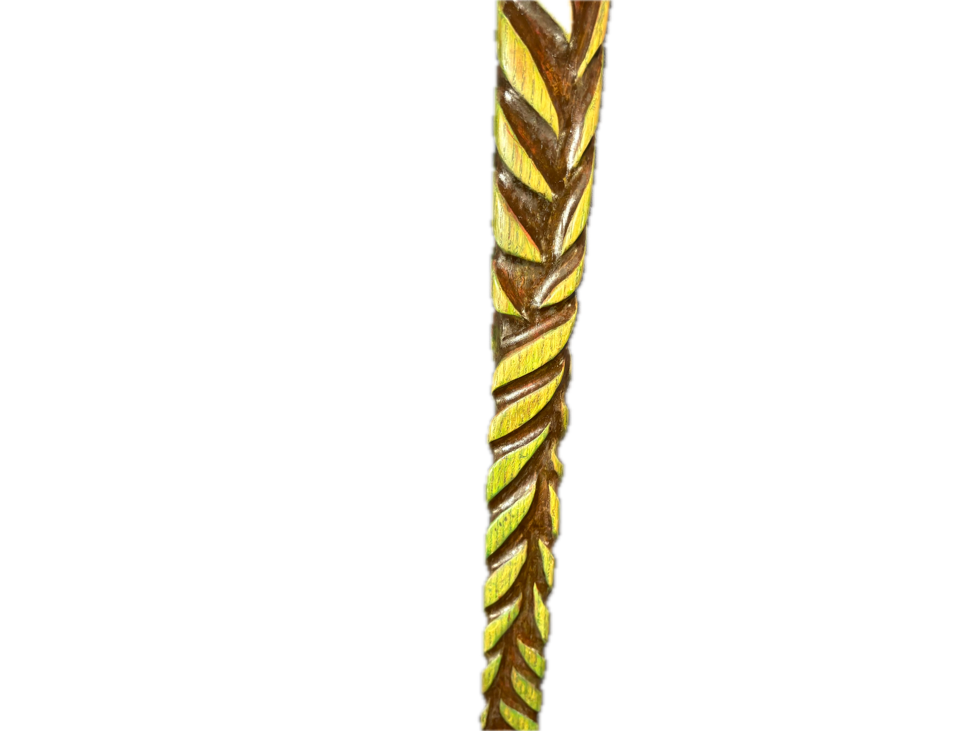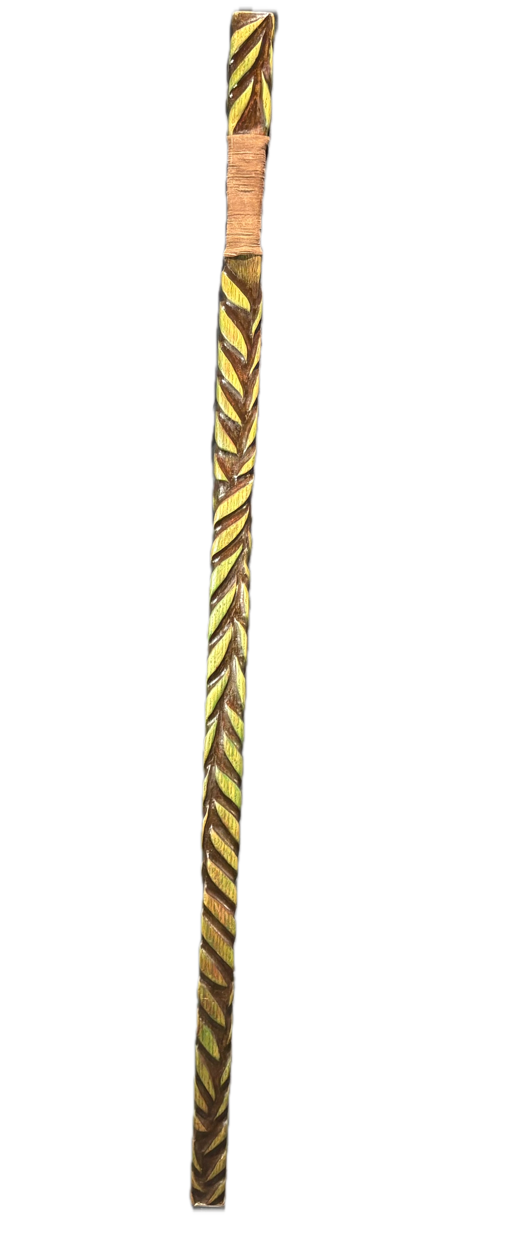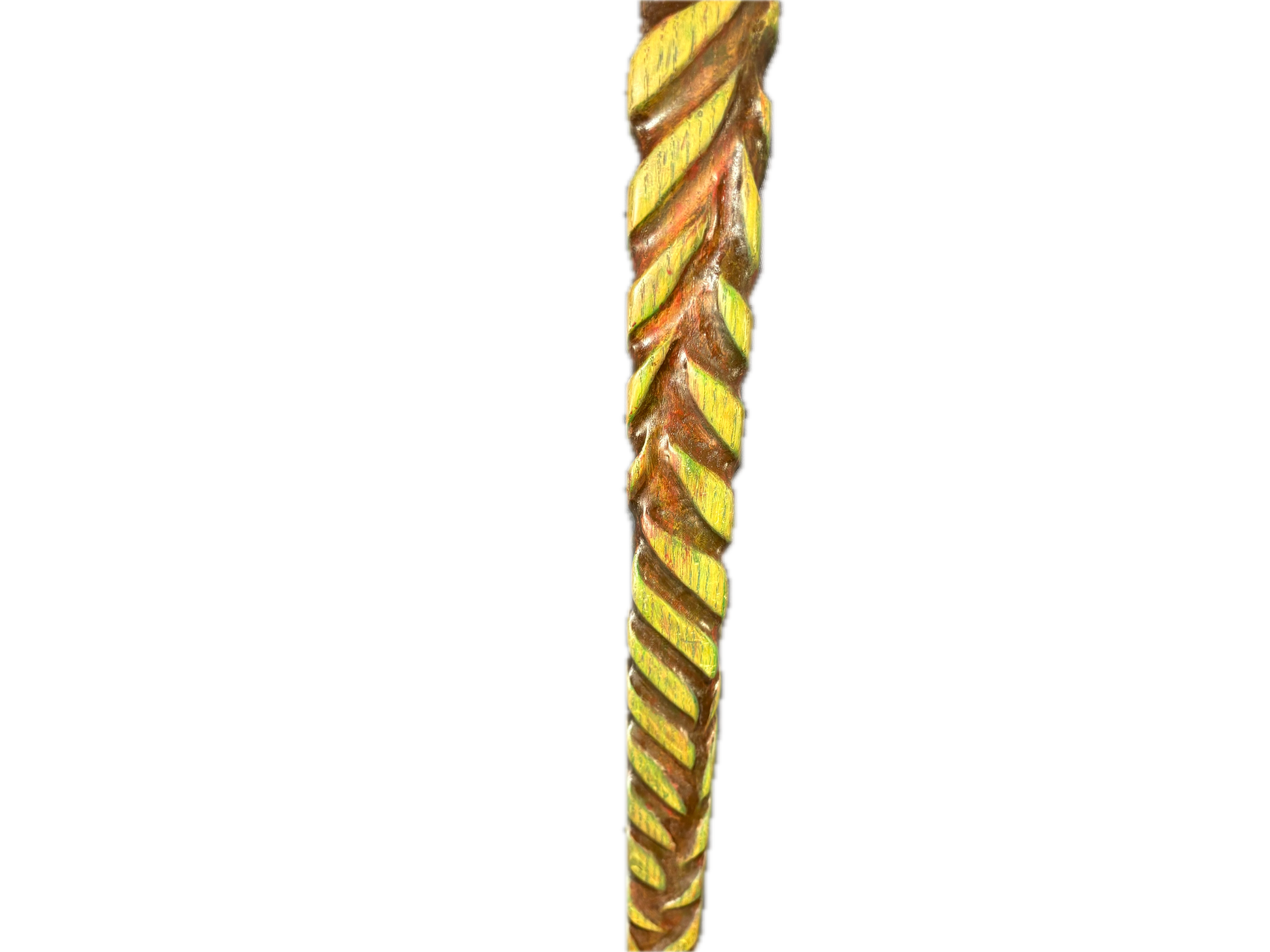 Verdant coil- The grove born staff with carved leaf work twisting up its length and a green finish that echoes fresh growth , verdant coil feels more grown than made. It’s a staff that channels the calm power of the woods- vibrant , rooted , and full of quit life.verdant coil stands at 60 3/8 tall and is 1 3/4 by 1 inches wide.
