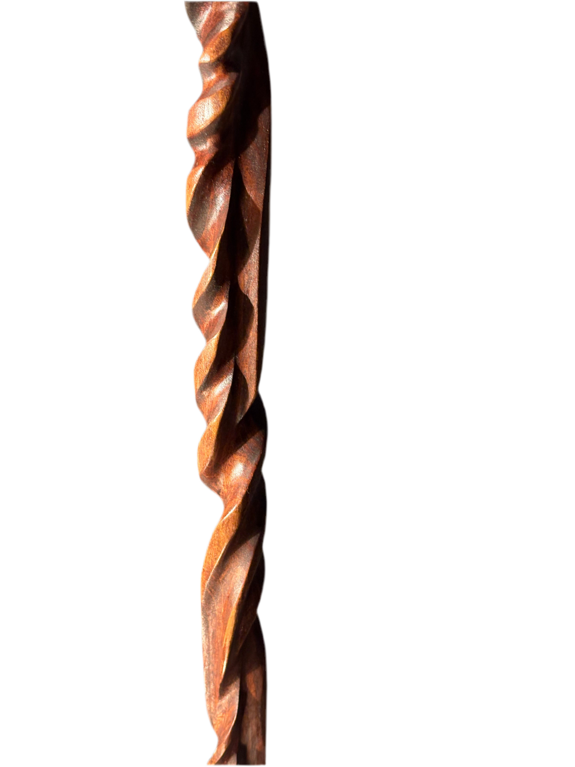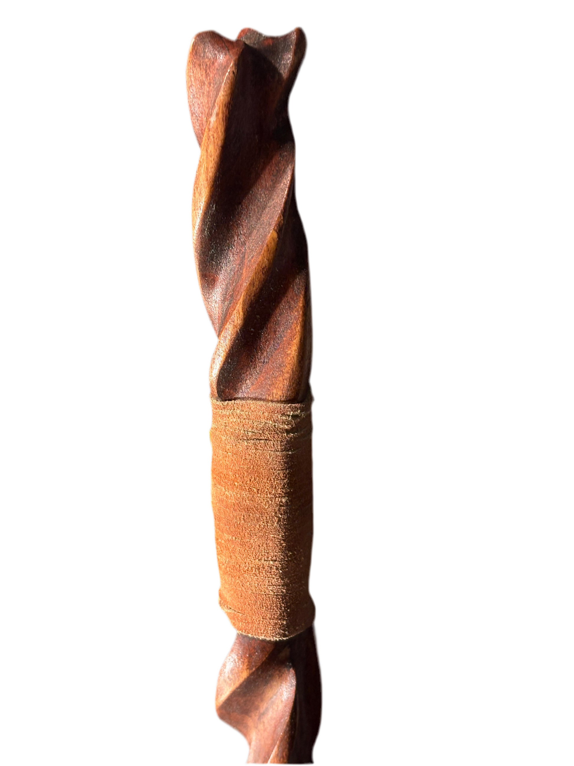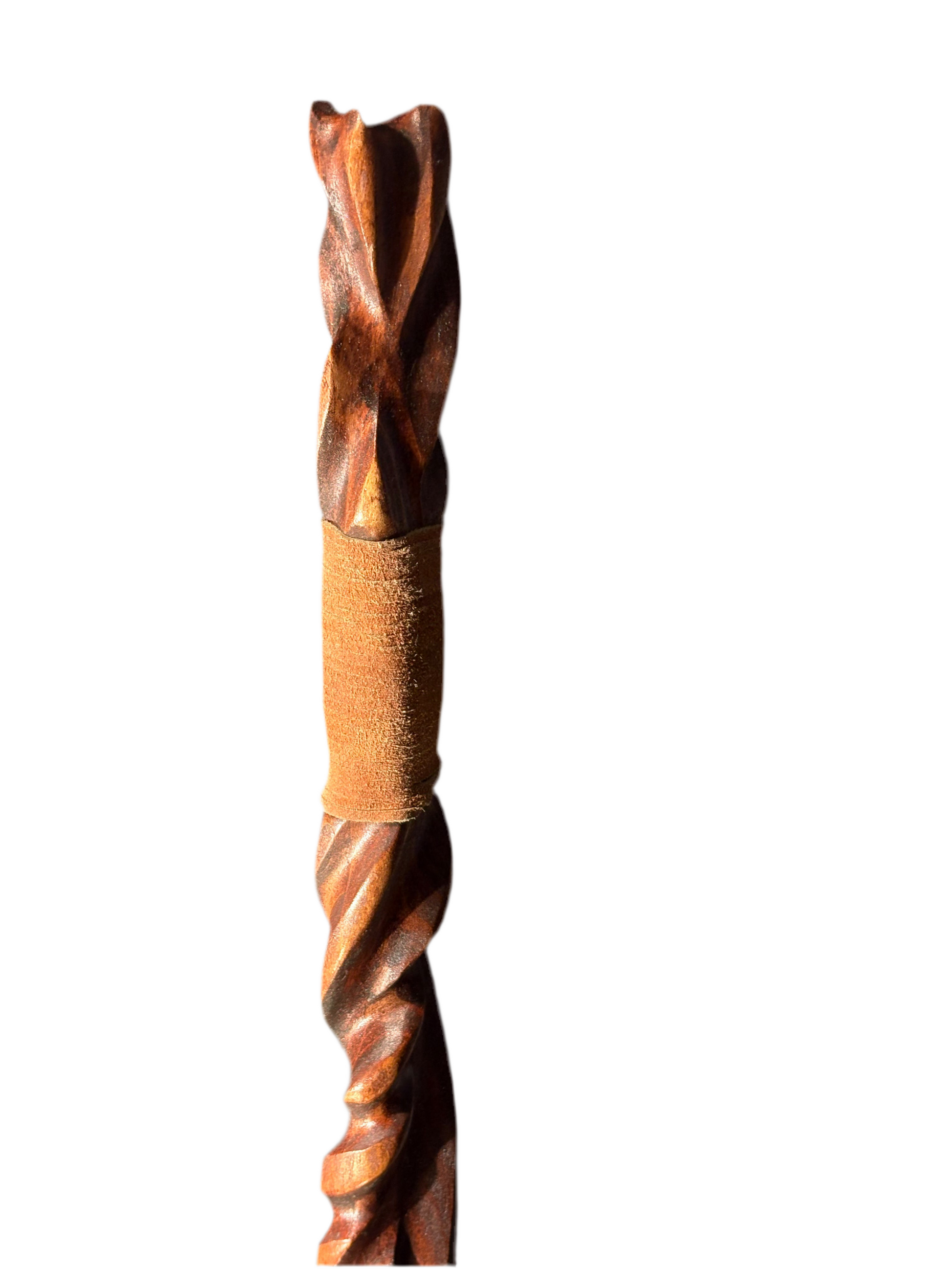 Igni- A graceful staff with a warm reddish brown twist, crowned by a bold red leather handle. Elegant, fiery, and full of character- crafted to stand out with style. Igni is made with poplar and stands at 53 1/4 inch’s tall and is 1 1/2 by 1 1/2 inch’s wide.
