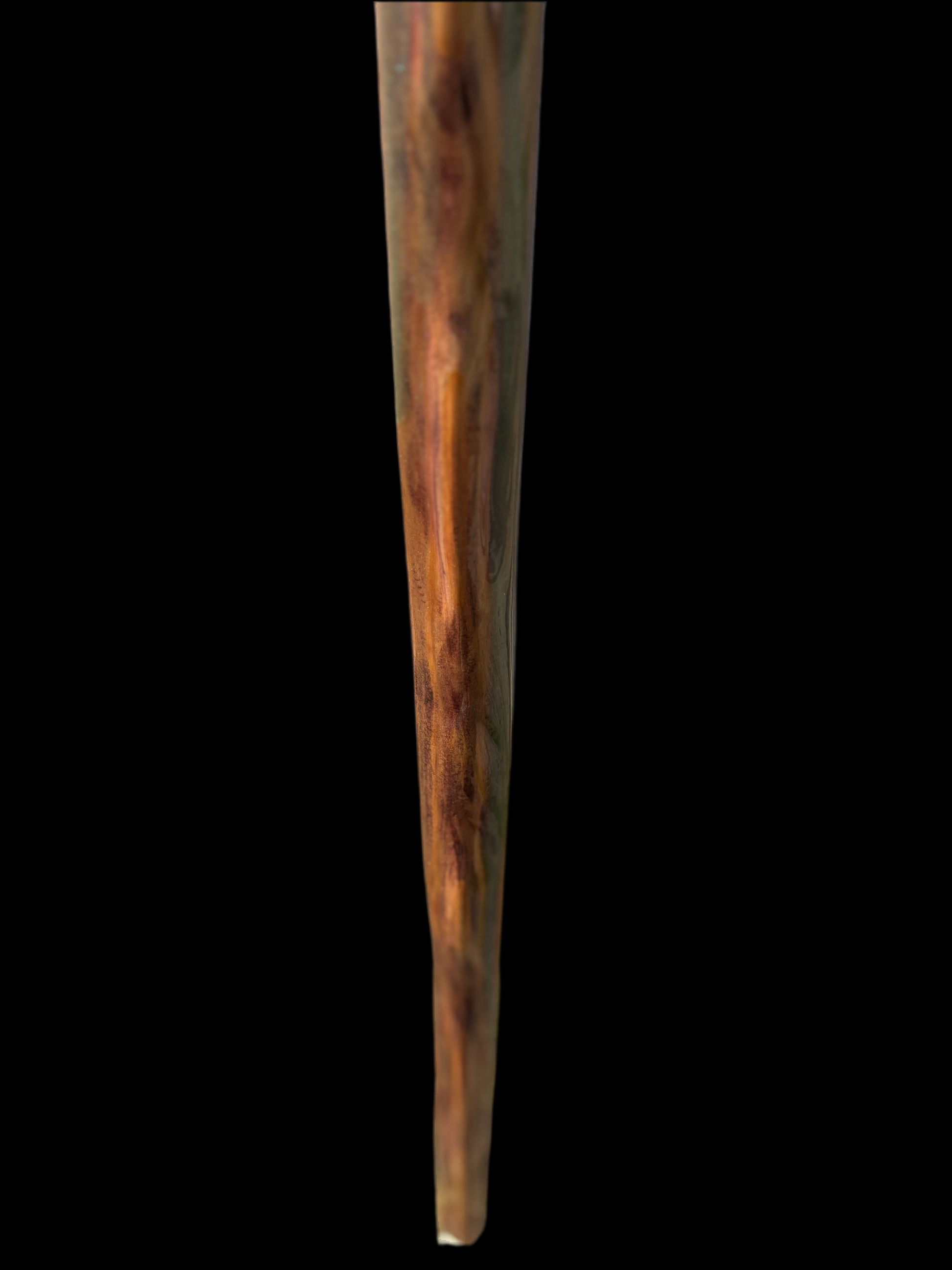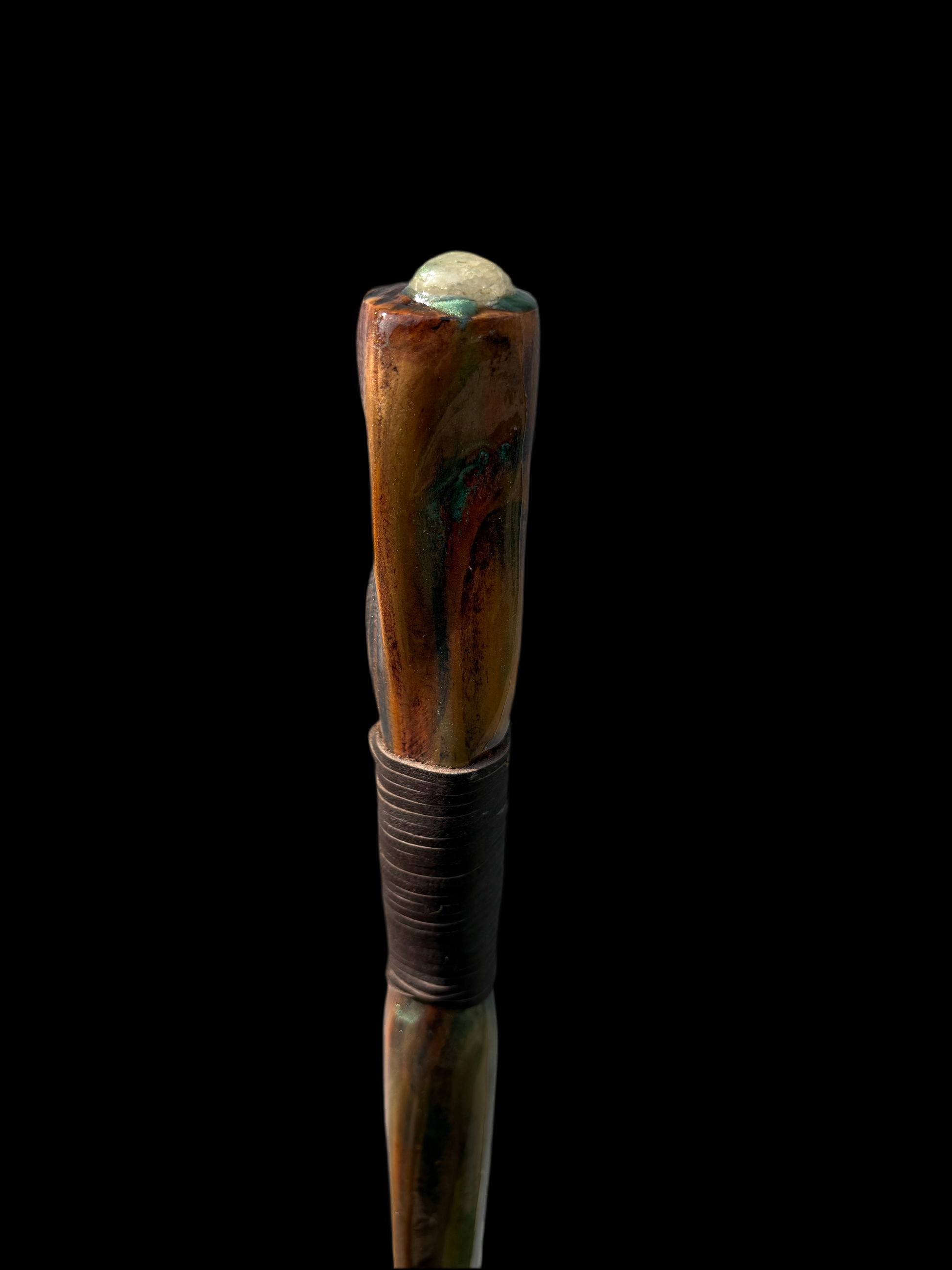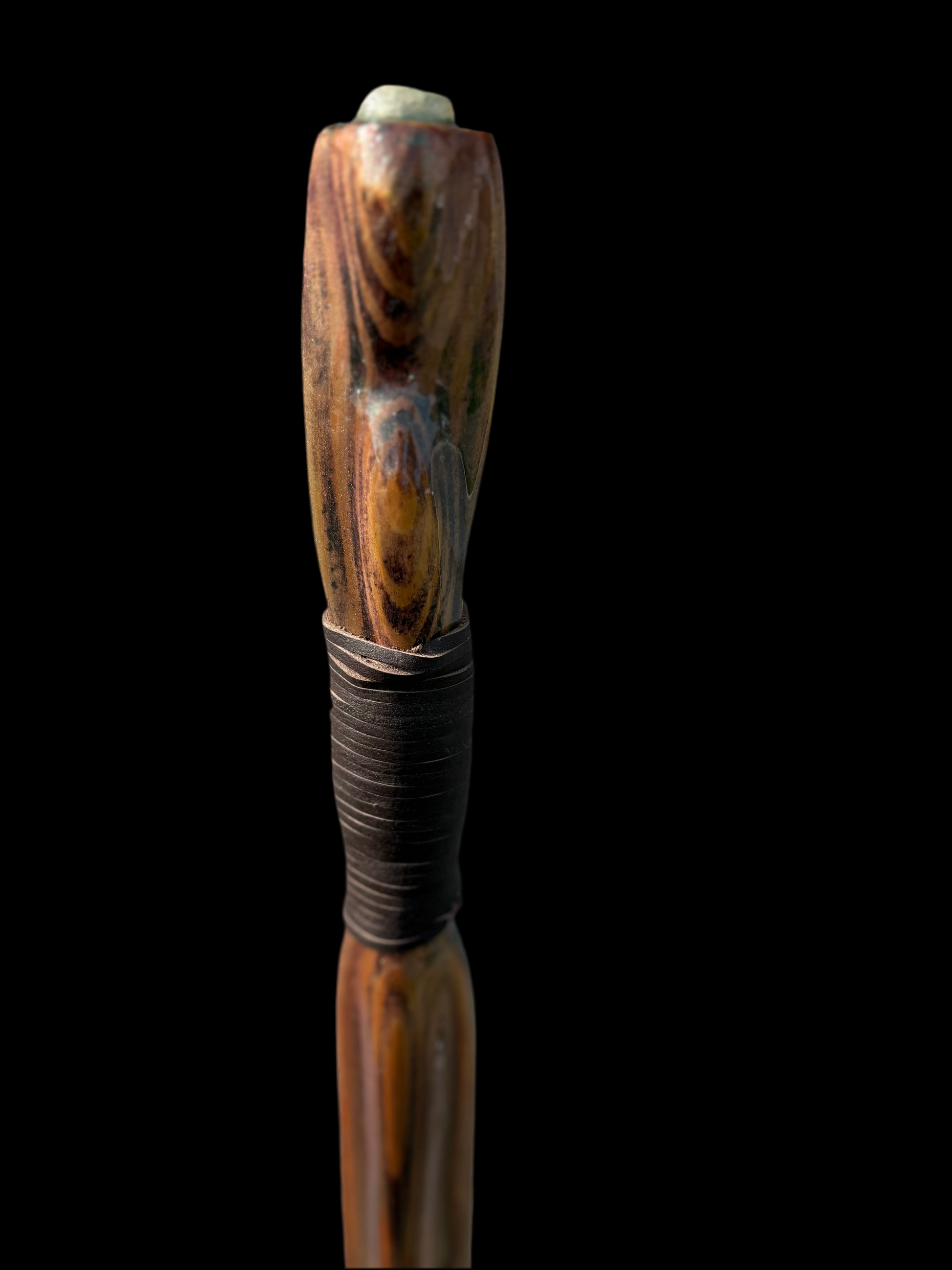 Enerald whisperer- quiet power flows through this hand crafted staff that features a smooth wood grain and translucent green epoxy that glows like forest light, and caped with with a smooth quartz stone.emerald whisperer grows to 51 1/2 inches tall and is 1 1/4 by 1 1/4 inches wide.