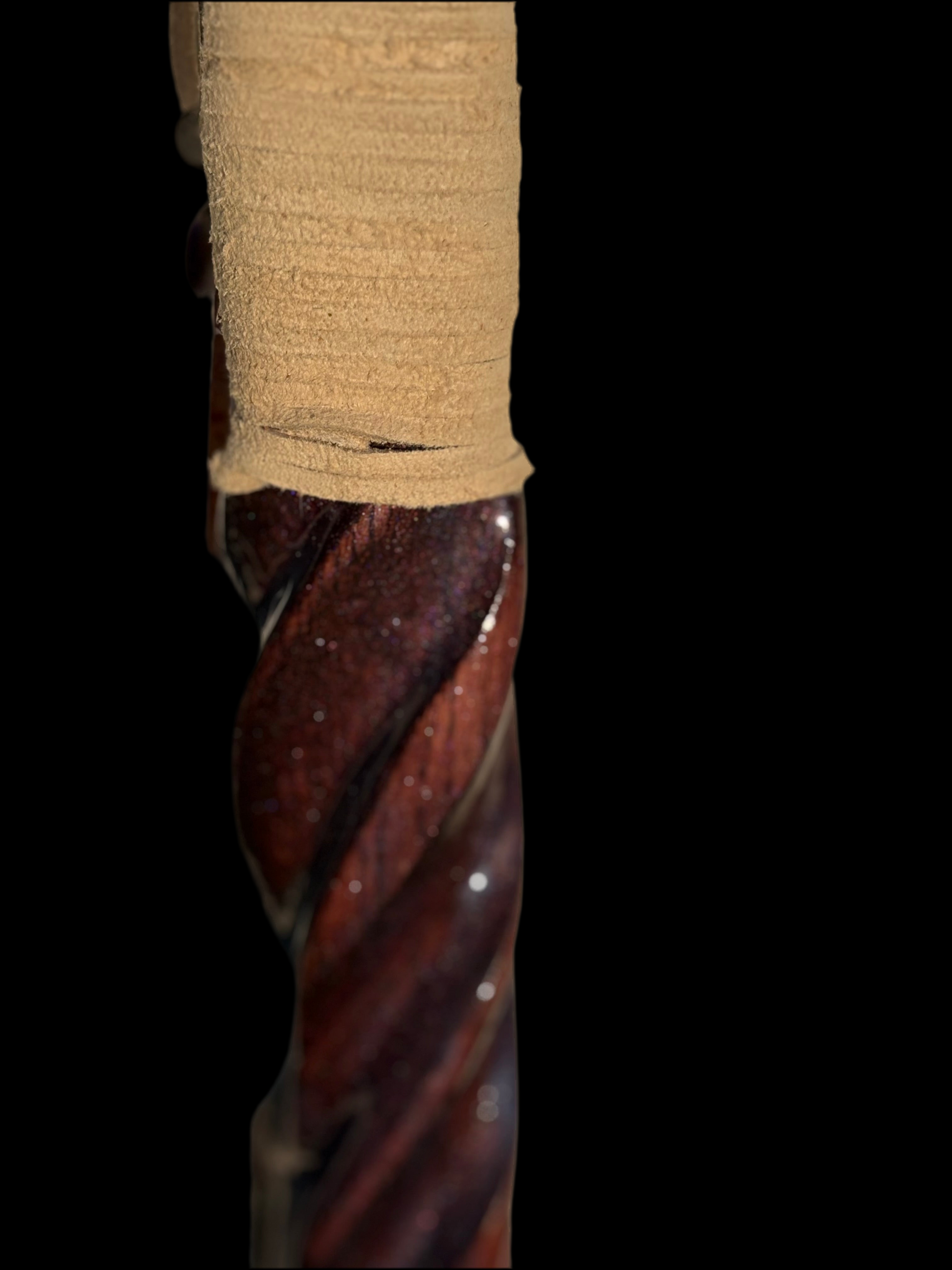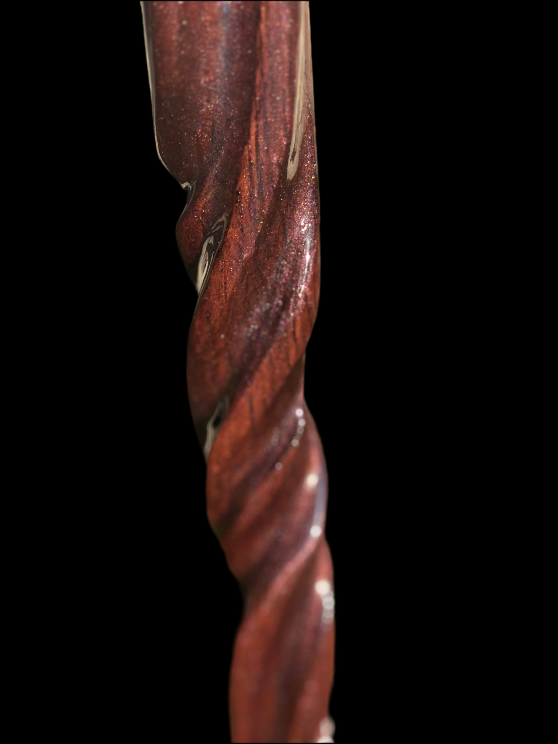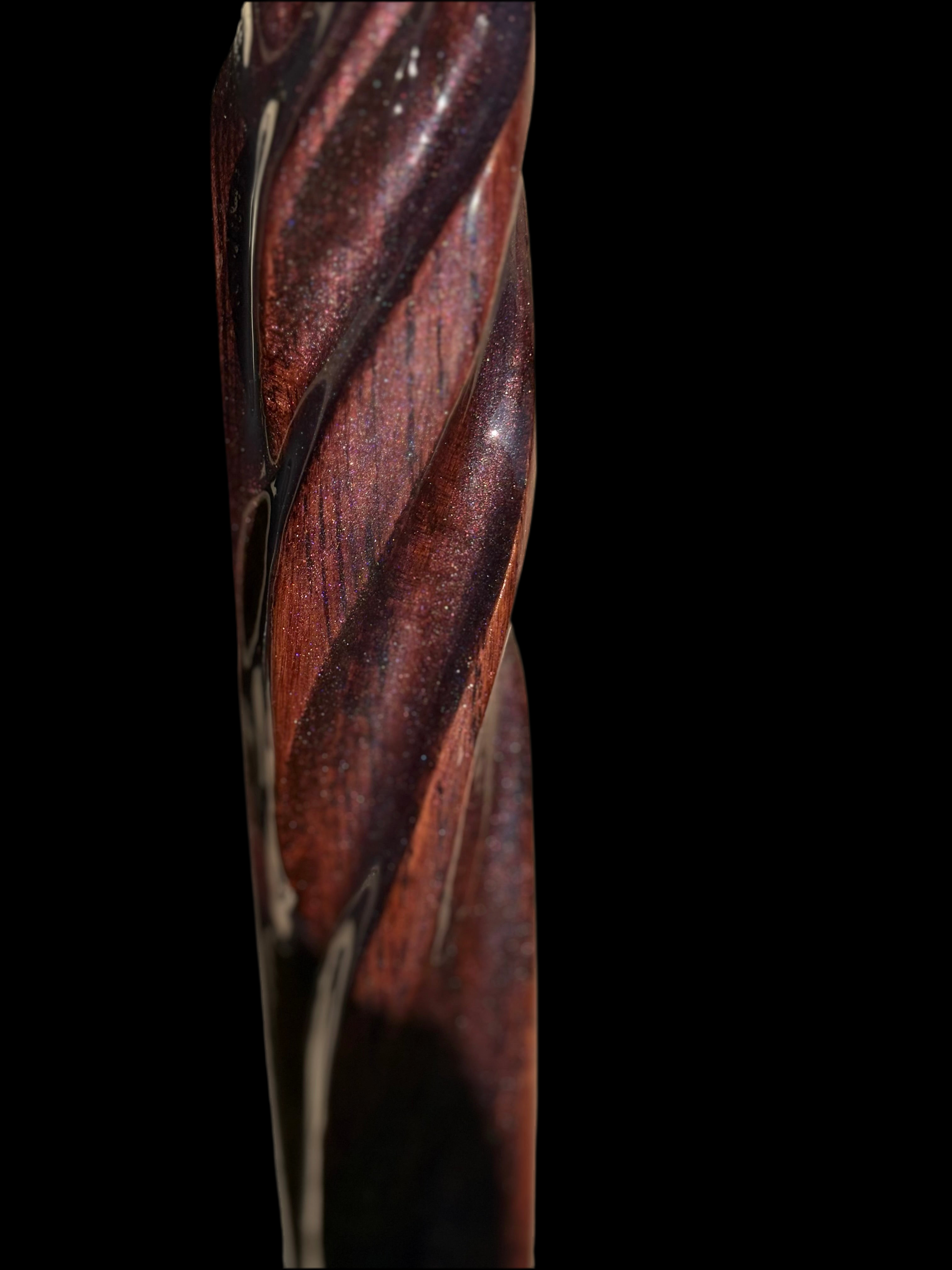 Luna cast- crafted from red oak and stained in black cherry, this twisted staff gleams with a clear epoxy coat and subtle specks of purple glitter.sleek , mystic, and moon kissed- made for night walkers and dreamers.Luna reaches to the moon at 47 inches tall and is 1 1/2 by 1 inches wide.