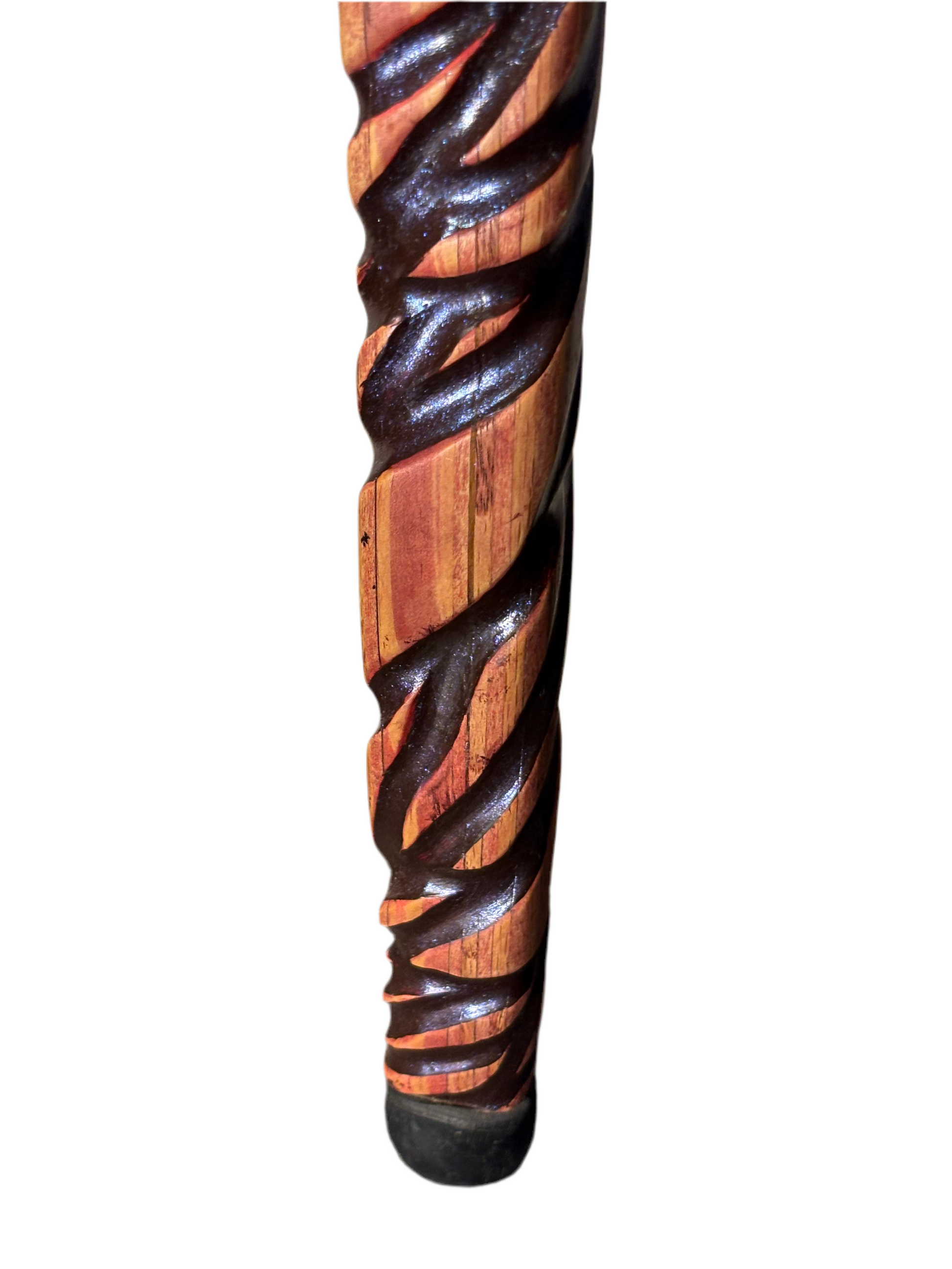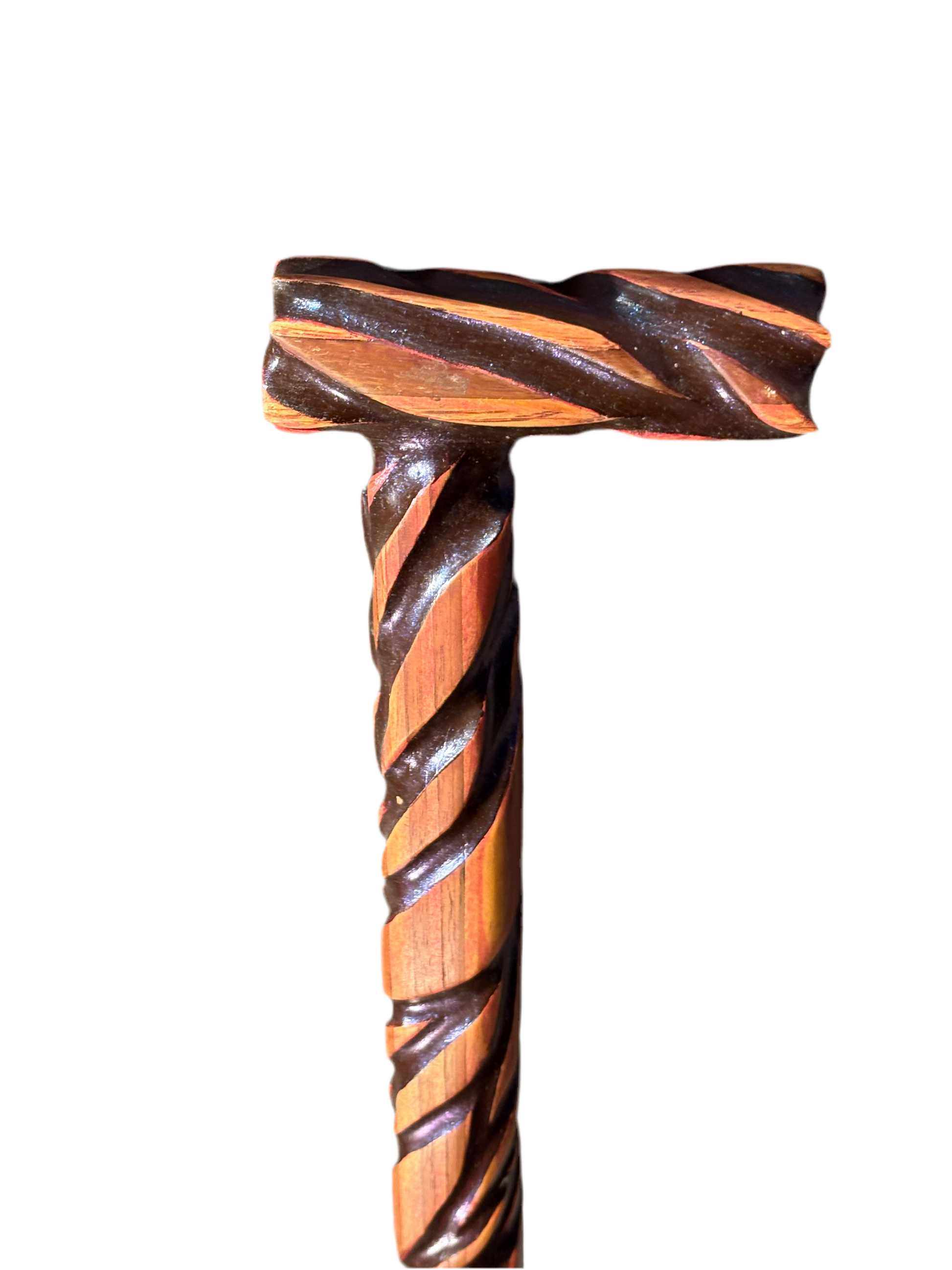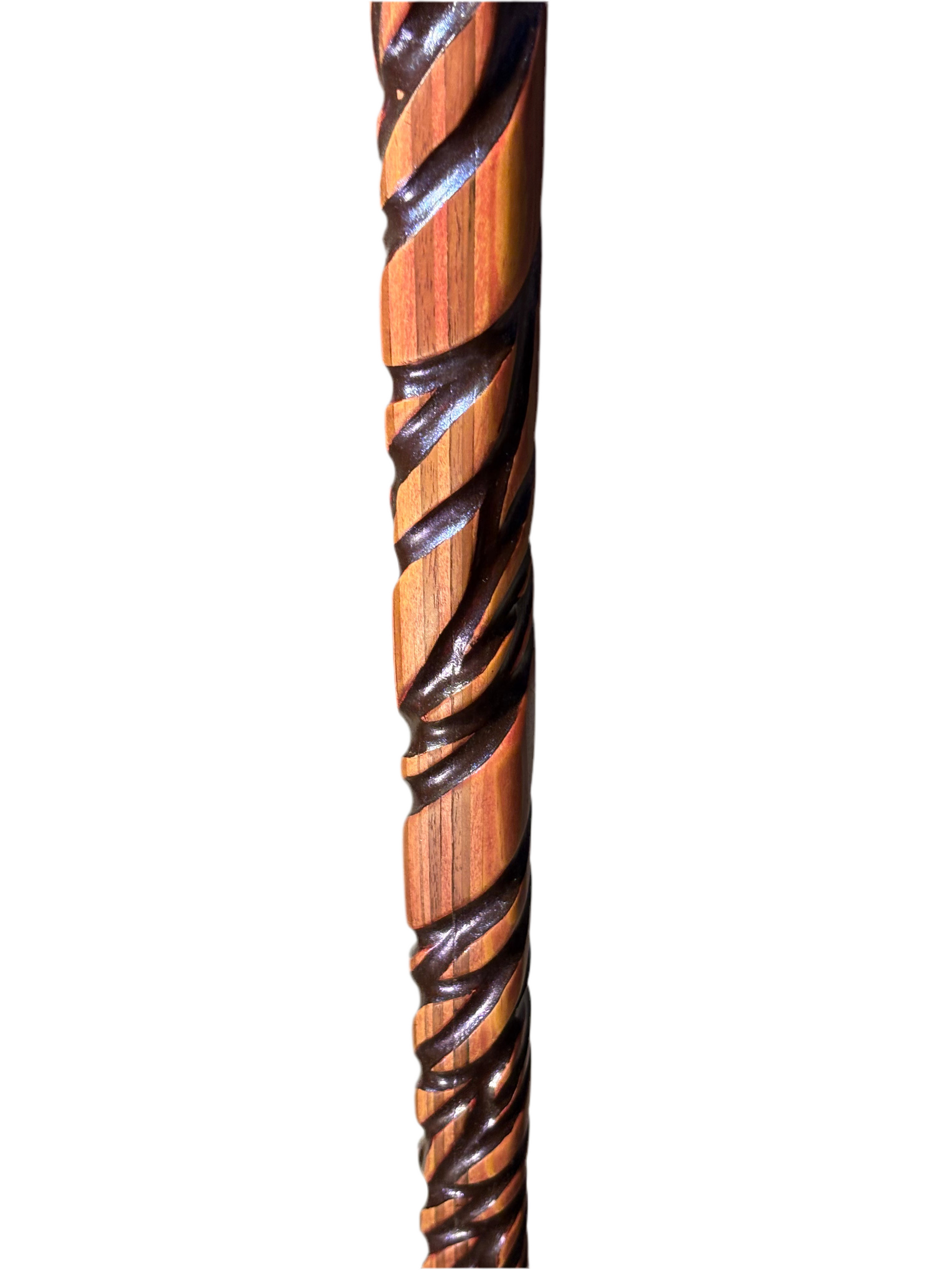 Mirabelle- a delicate dance of light and shadow, this twisted cane weaves grace into every curve. With its rich contrast and flowing form, she is a quiet beauty, refined, resilient, and full of charm. Mirabelle is 31 inch’s tall and is 1 1/2 by 1 1/4 wide. Mirabelle is made from several species of wood glued together.