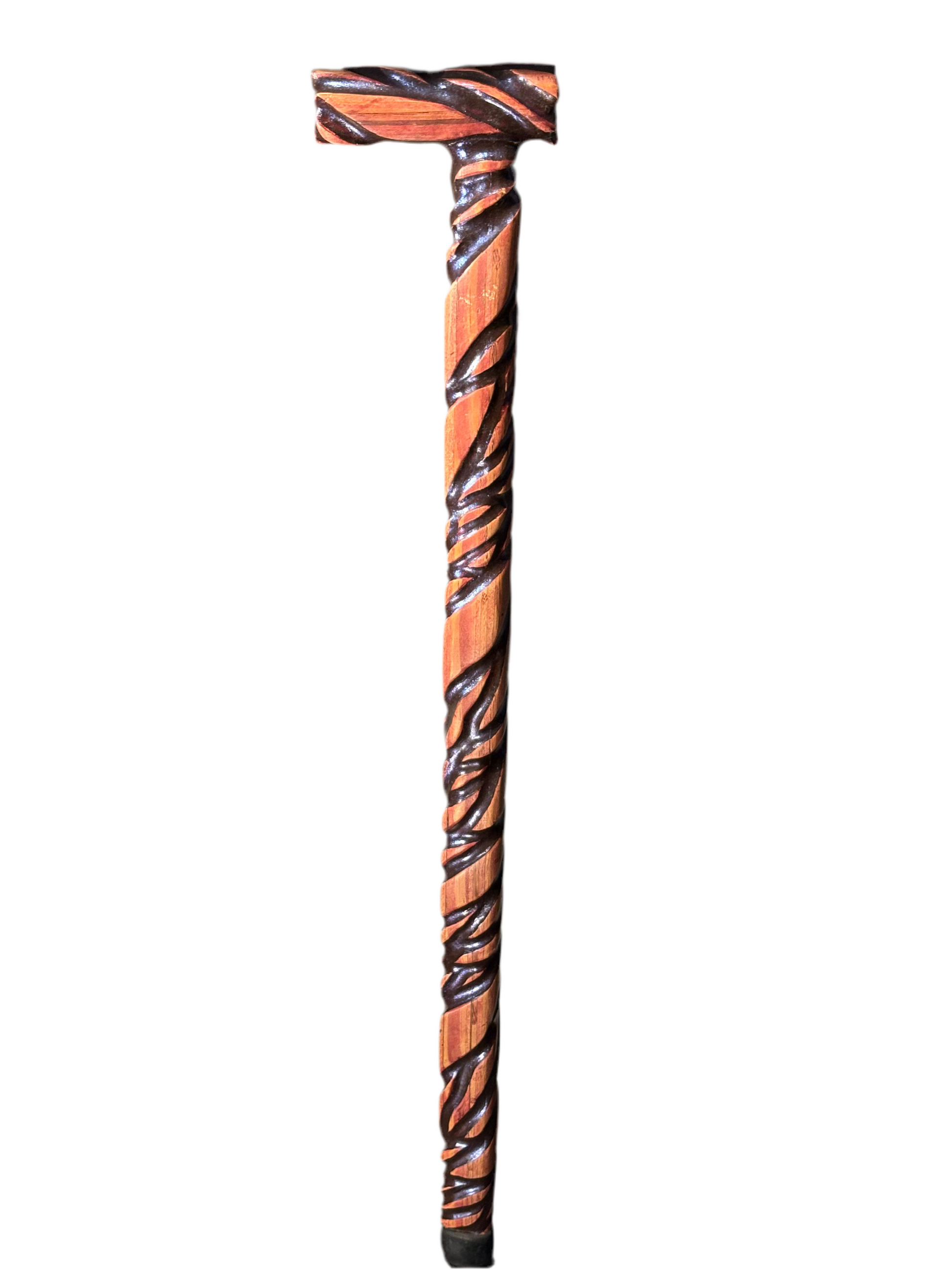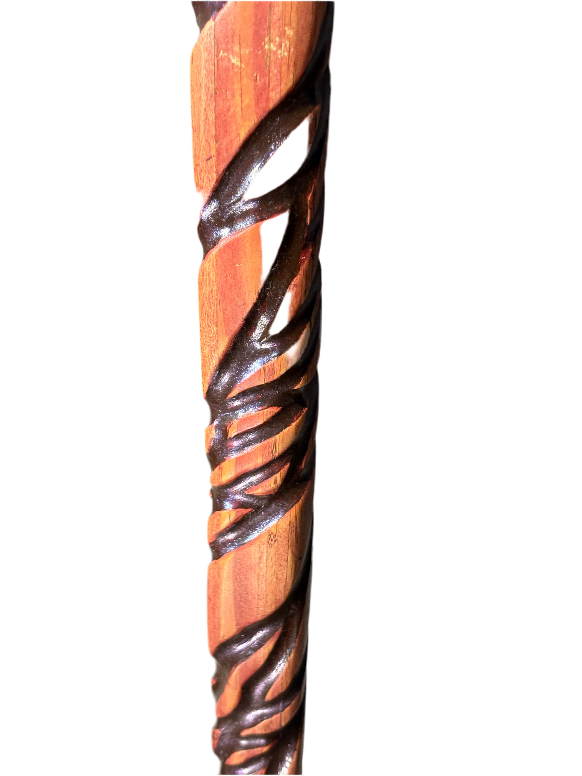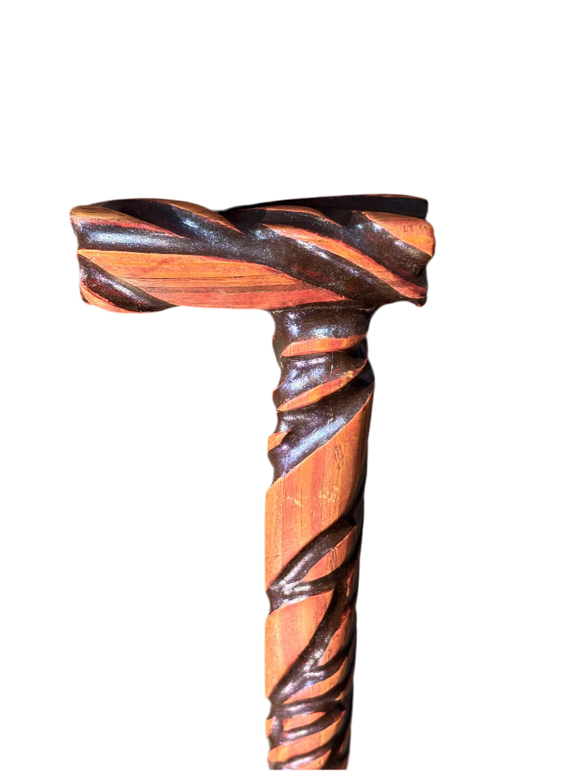 Mirabelle- a delicate dance of light and shadow, this twisted cane weaves grace into every curve. With its rich contrast and flowing form, she is a quiet beauty, refined, resilient, and full of charm. Mirabelle is 31 inch’s tall and is 1 1/2 by 1 1/4 wide. Mirabelle is made from several species of wood glued together.