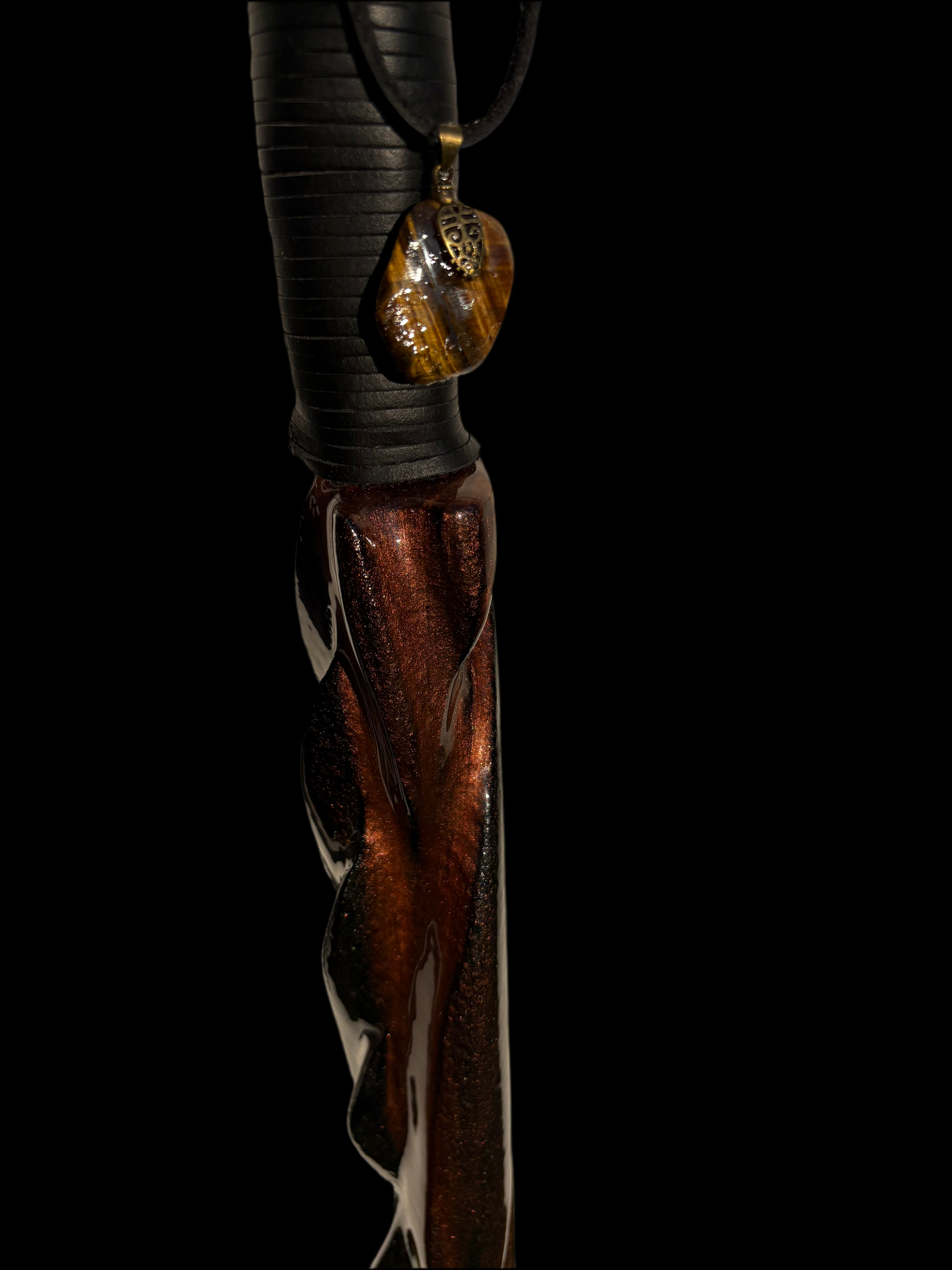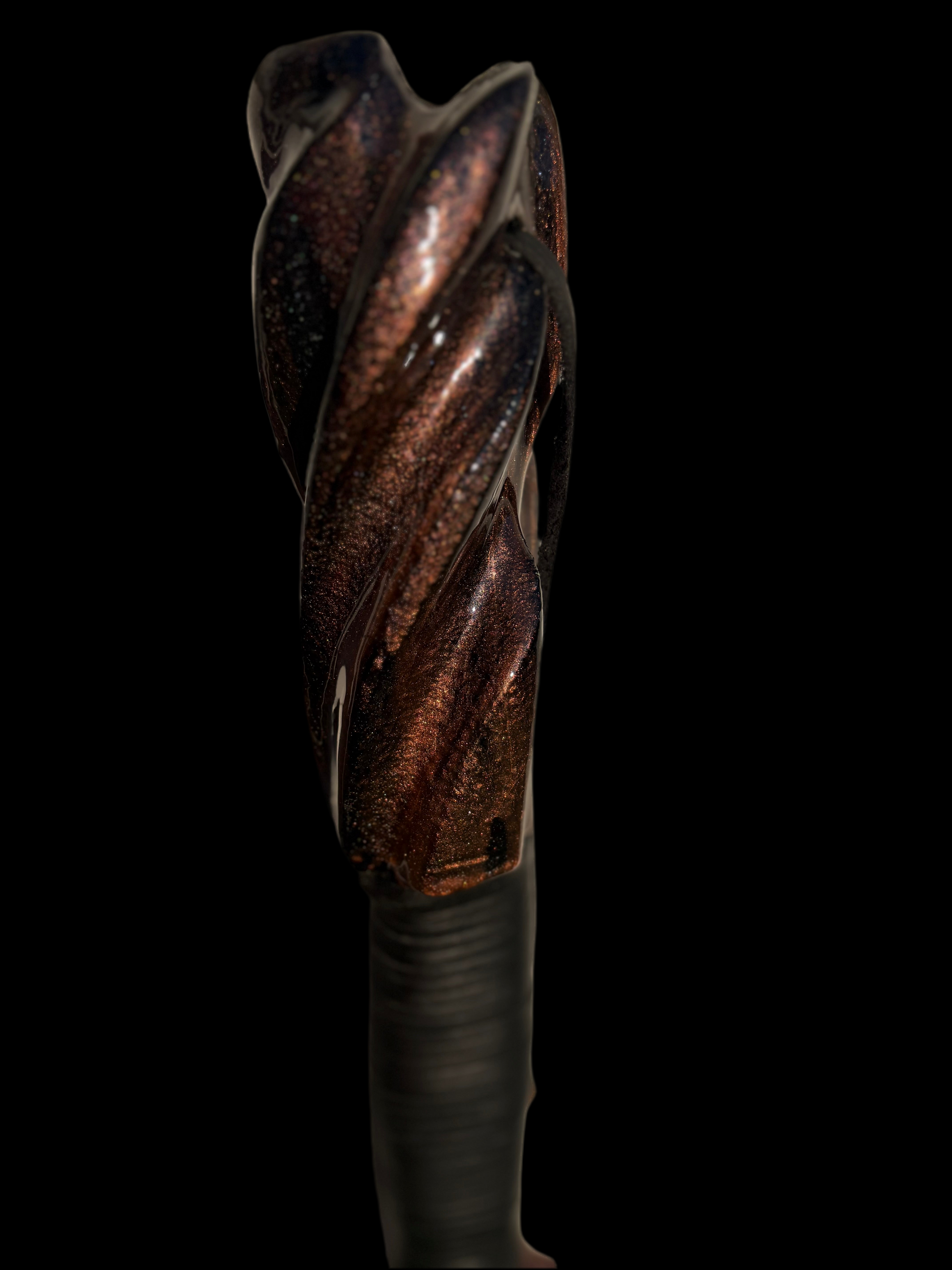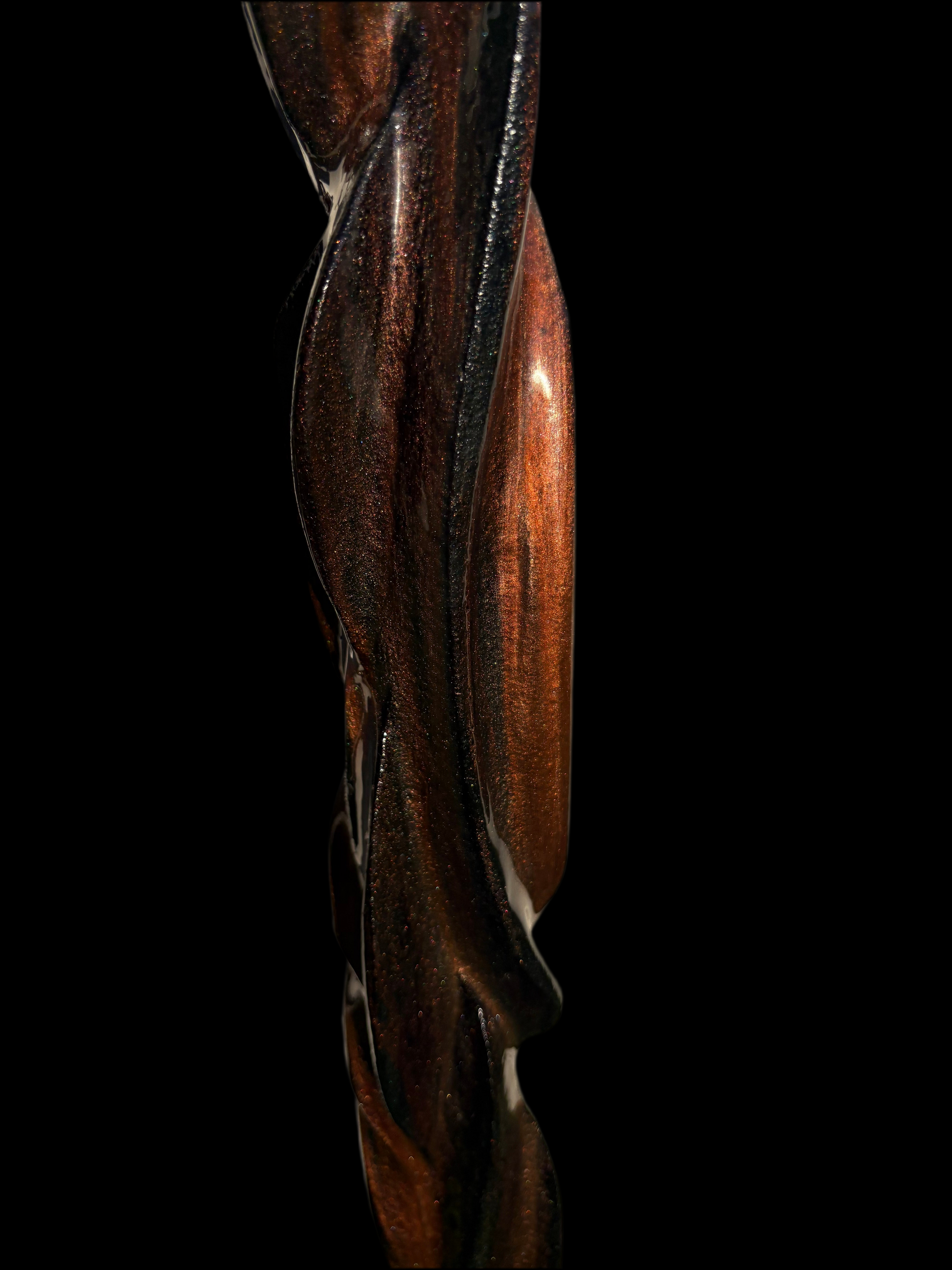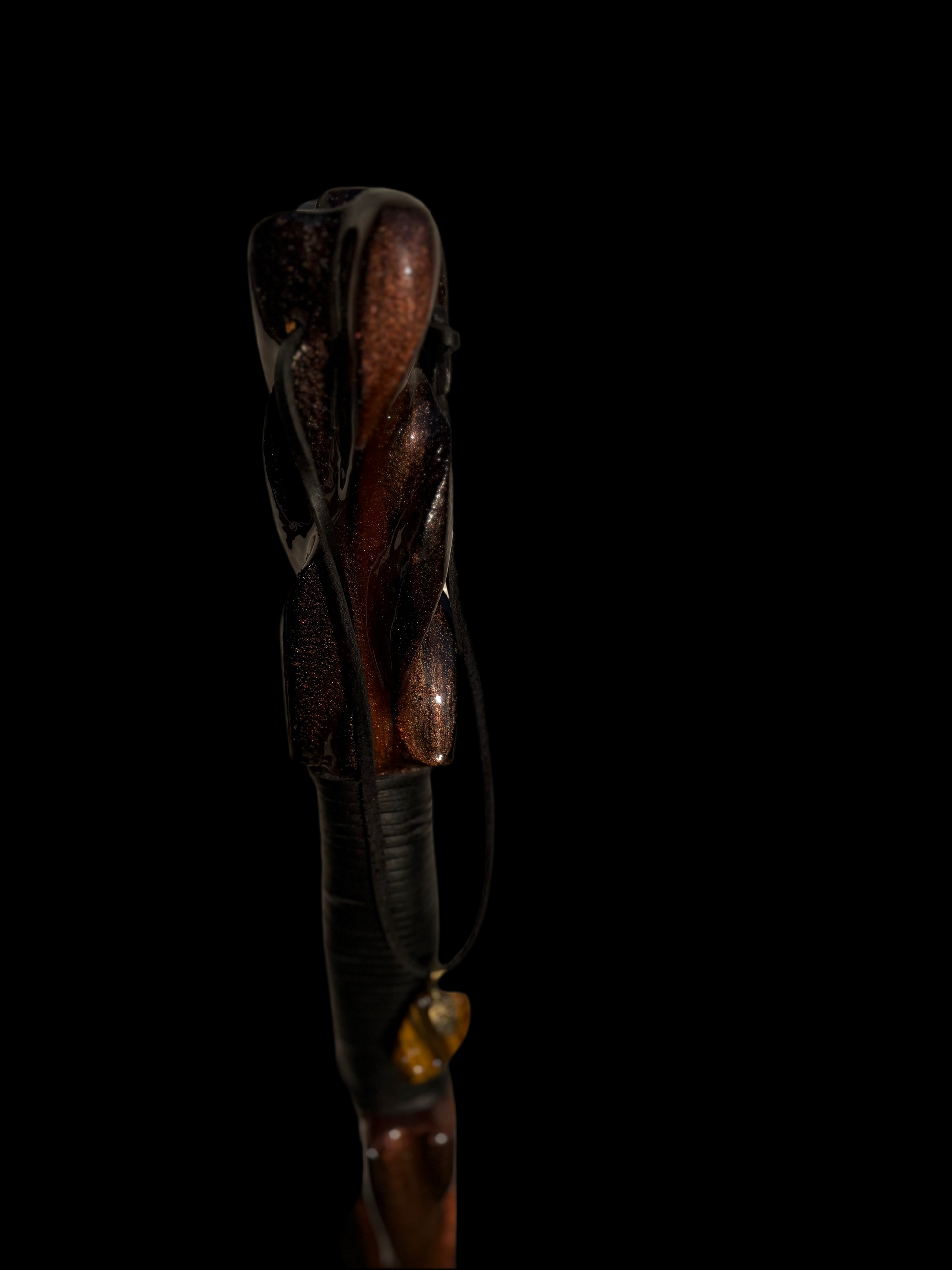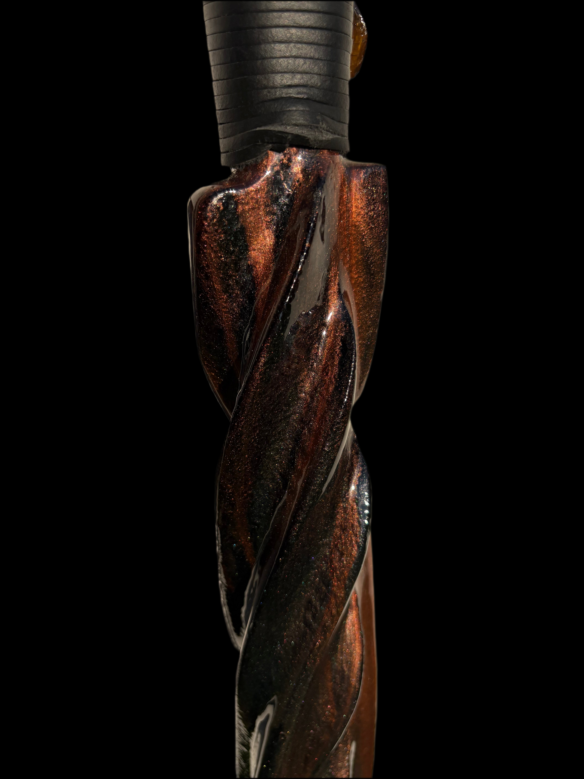 Molton shadow - a swirling fusion of jet black and metallic orange epoxy, this staff evokes the heart of a dying star-elegant, elemental , and unpredictable. Finished with a high gloss polish, it gleams like volcanic glass.striking in hand unforgettable on display. Molton shadow stands at 50 1/2 inches tall and is 2 by 1 1/2 wide.