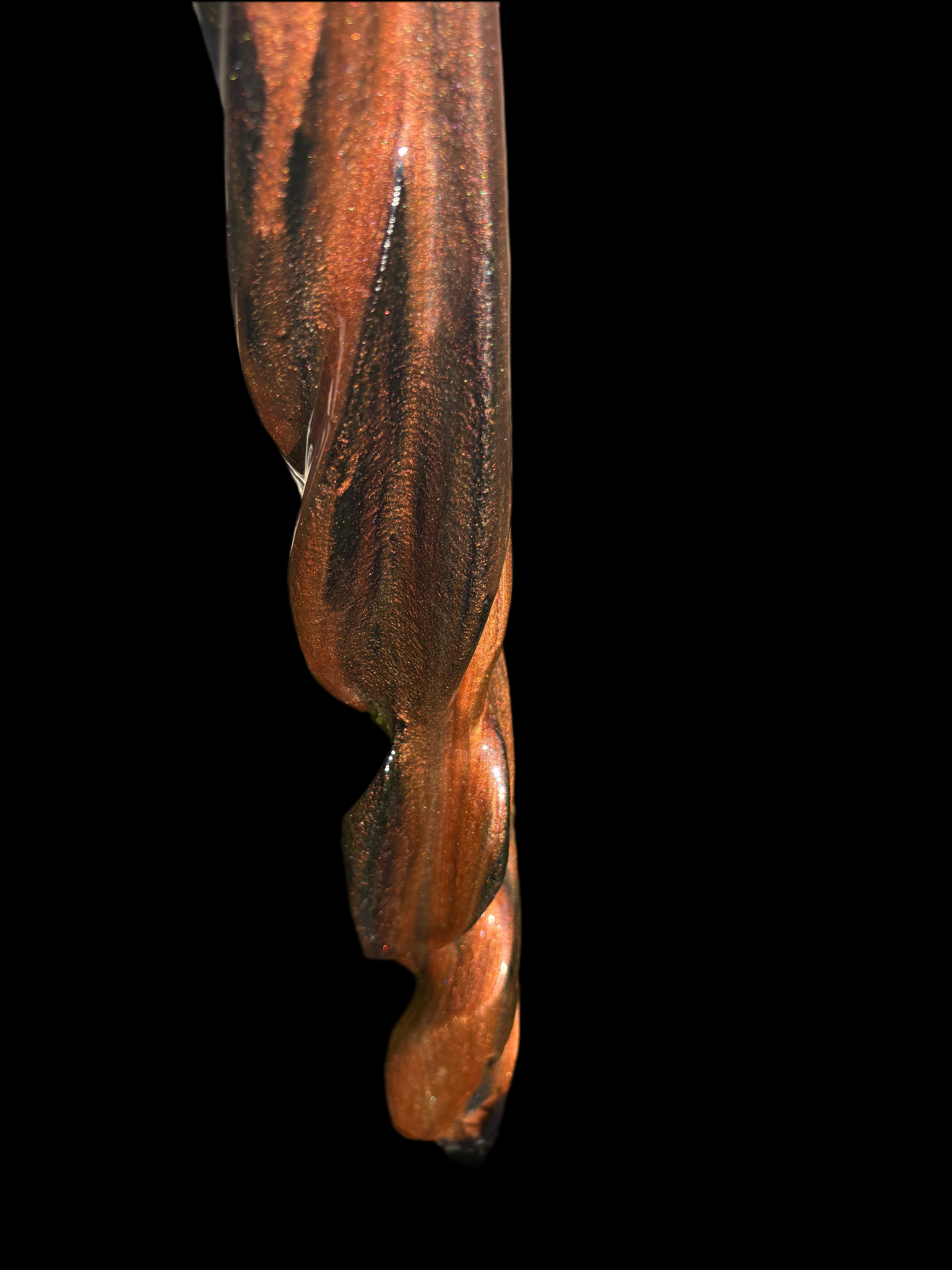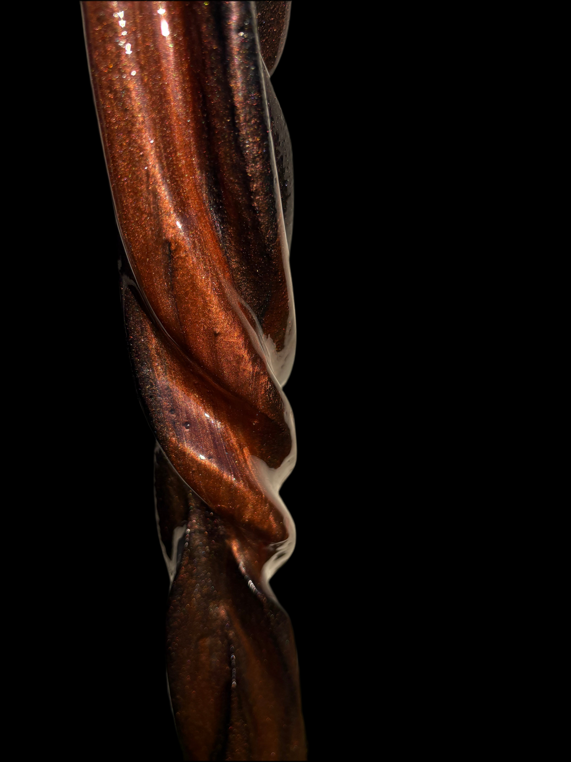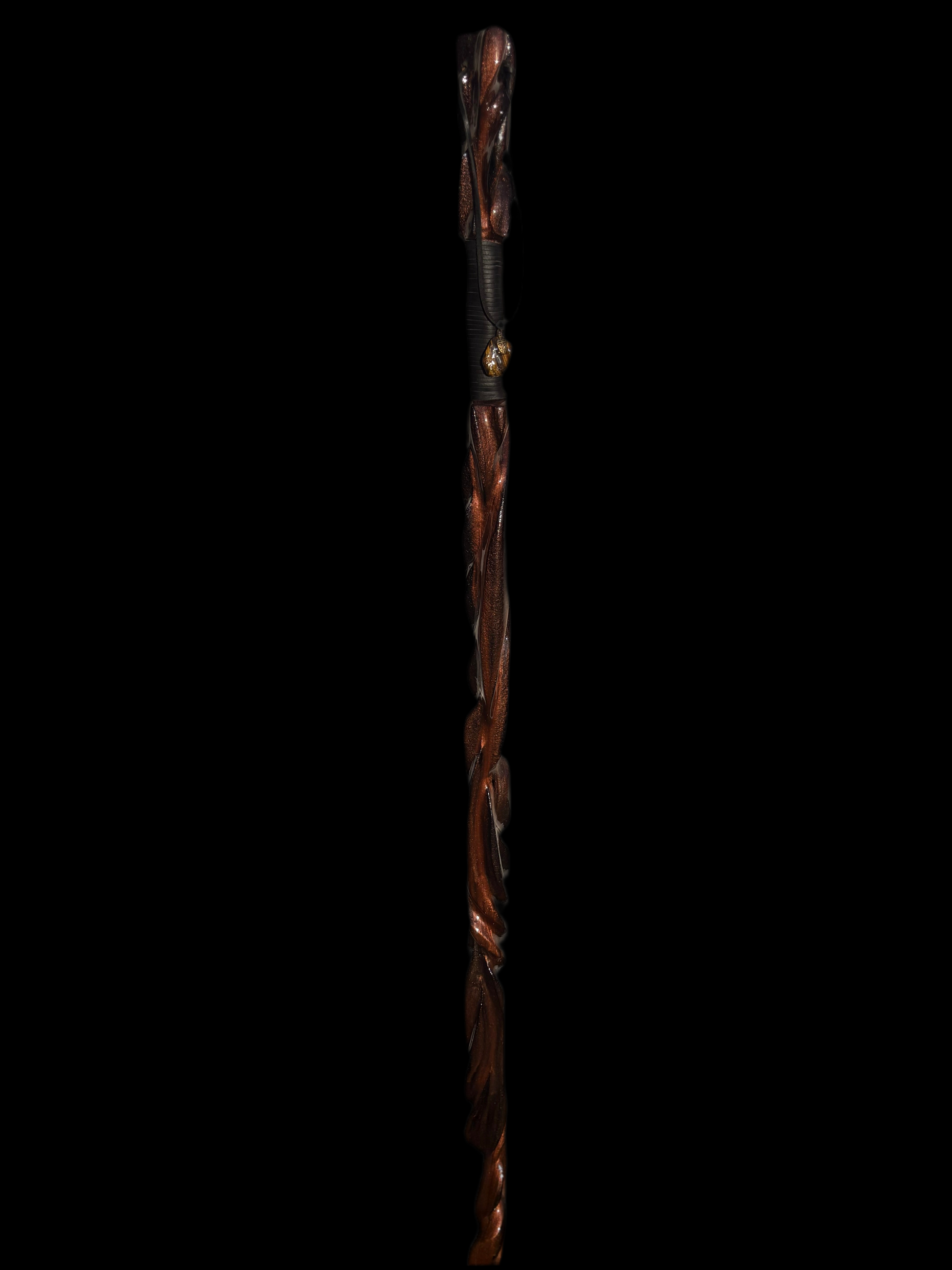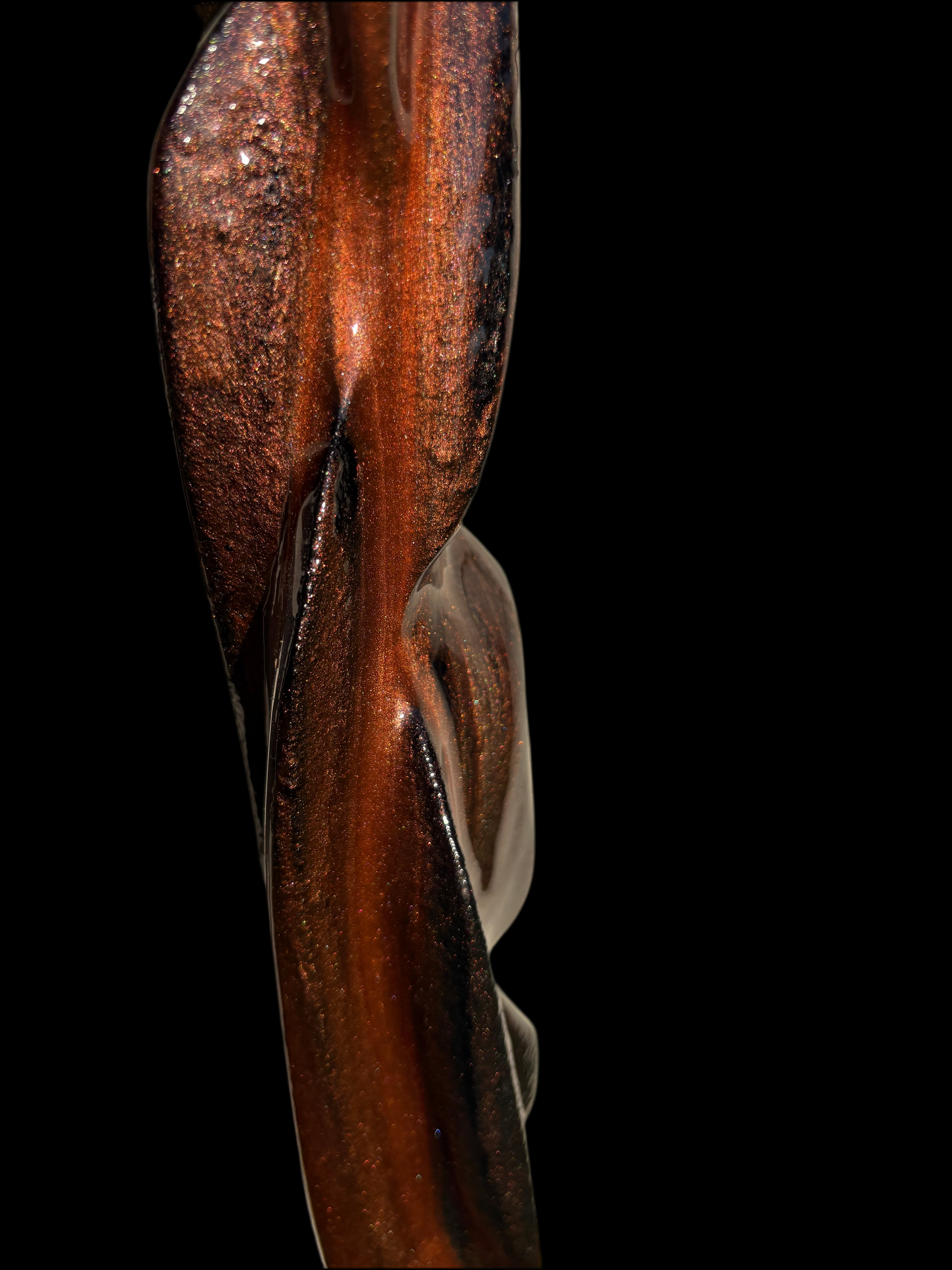 Molton shadow - a swirling fusion of jet black and metallic orange epoxy, this staff evokes the heart of a dying star-elegant, elemental , and unpredictable. Finished with a high gloss polish, it gleams like volcanic glass.striking in hand unforgettable on display. Molton shadow stands at 50 1/2 inches tall and is 2 by 1 1/2 wide.