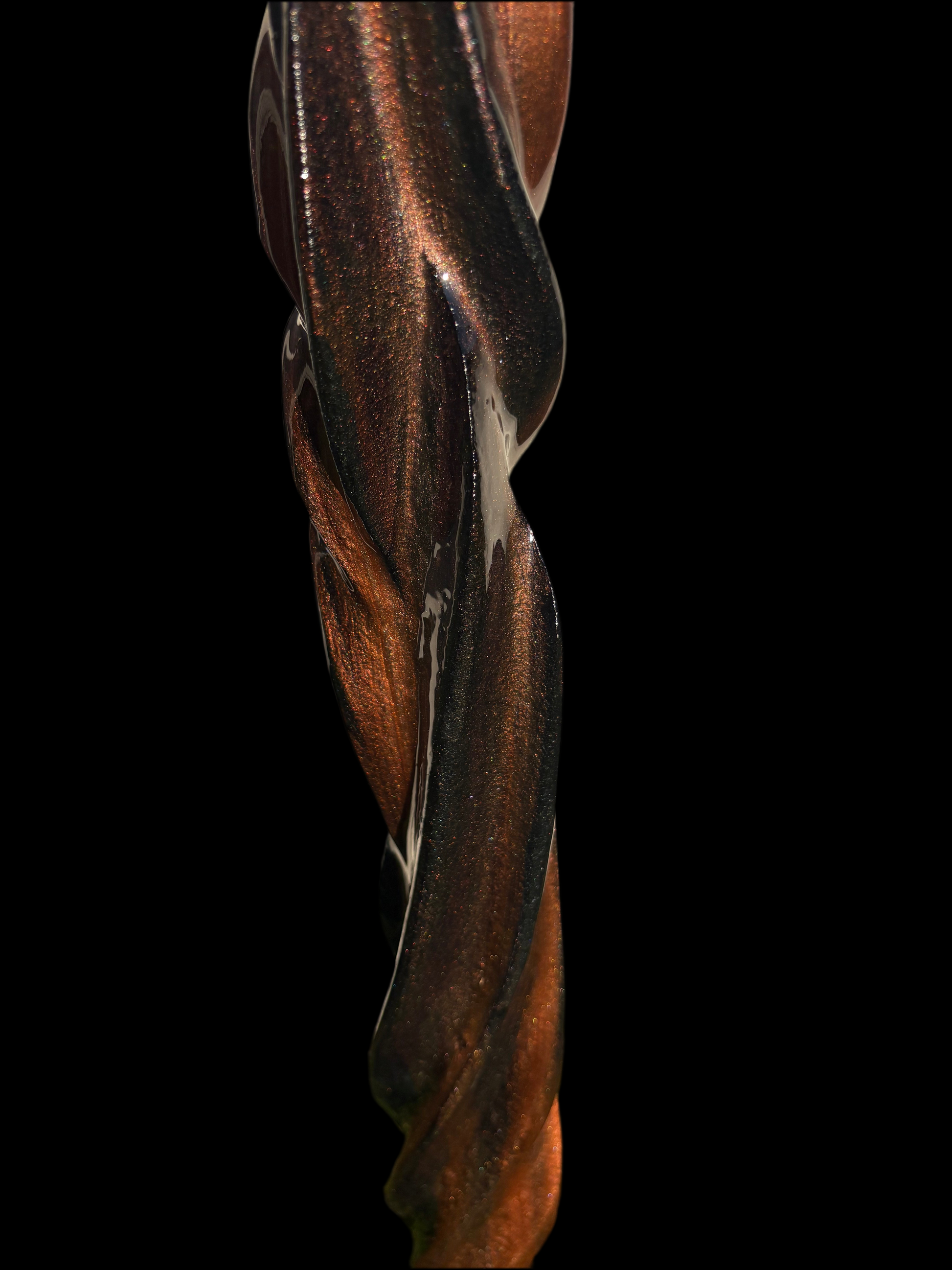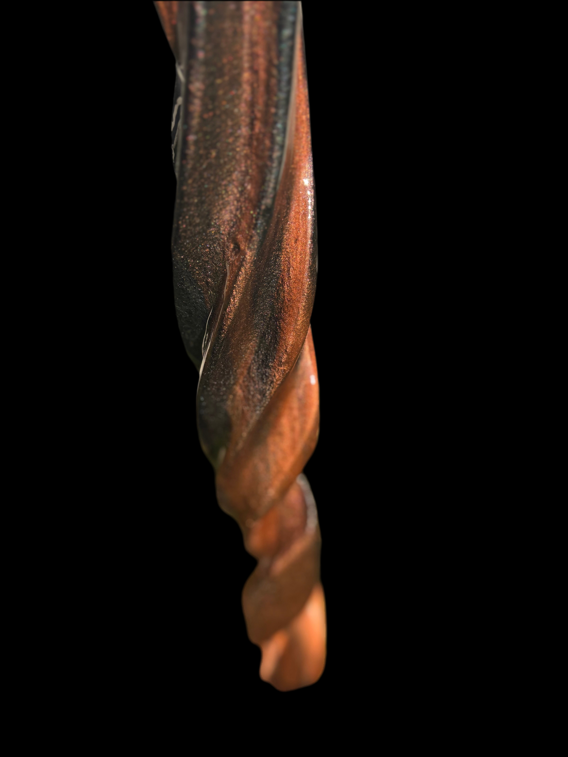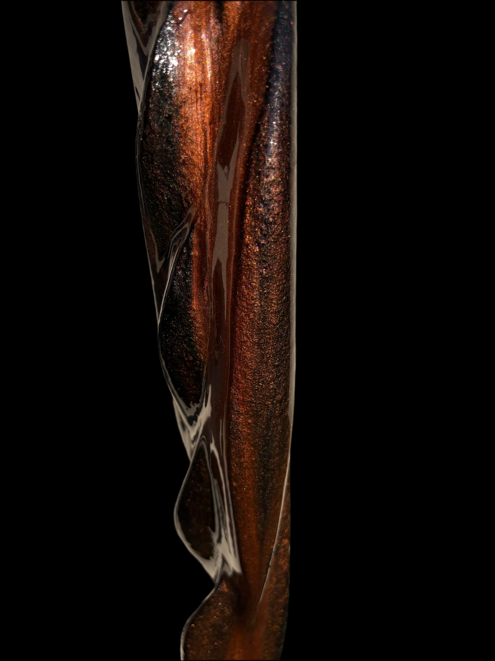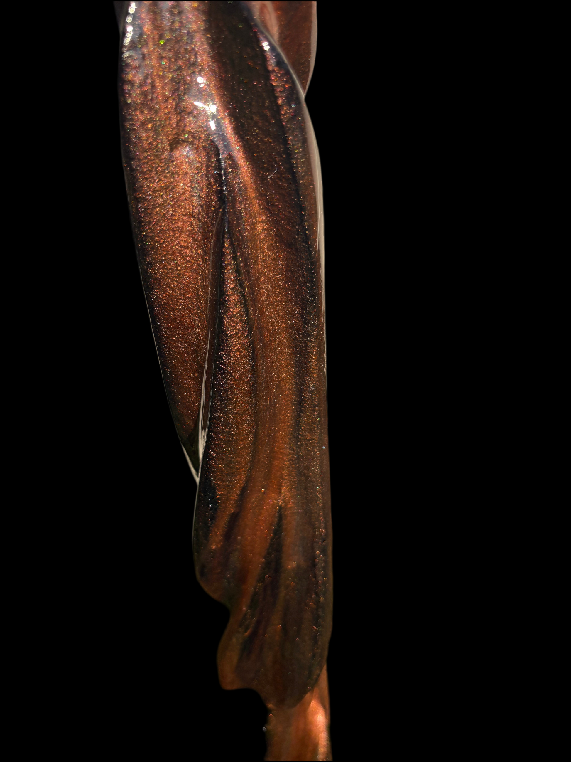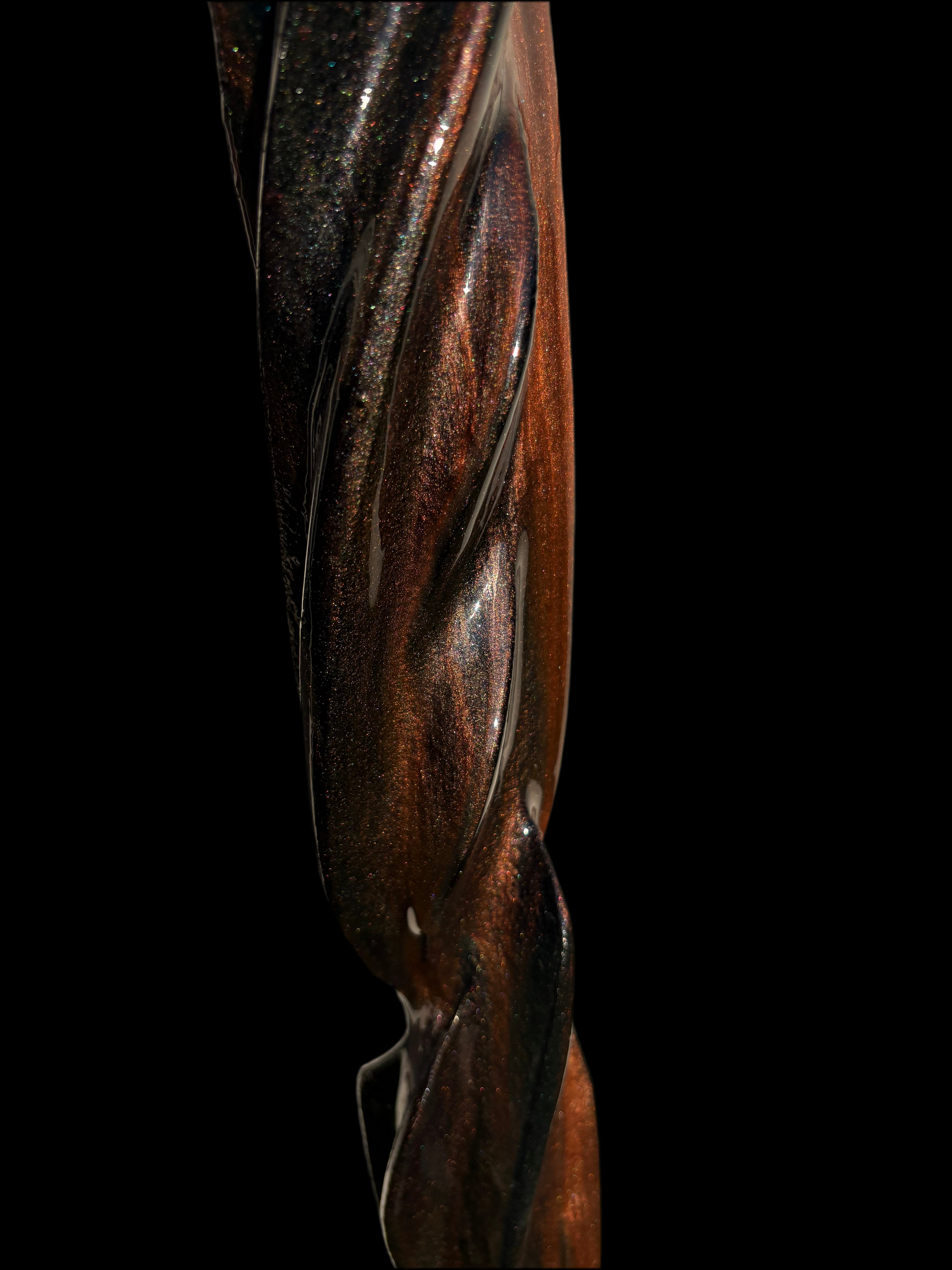Molton shadow - a swirling fusion of jet black and metallic orange epoxy, this staff evokes the heart of a dying star-elegant, elemental , and unpredictable. Finished with a high gloss polish, it gleams like volcanic glass.striking in hand unforgettable on display. Molton shadow stands at 50 1/2 inches tall and is 2 by 1 1/2 wide.