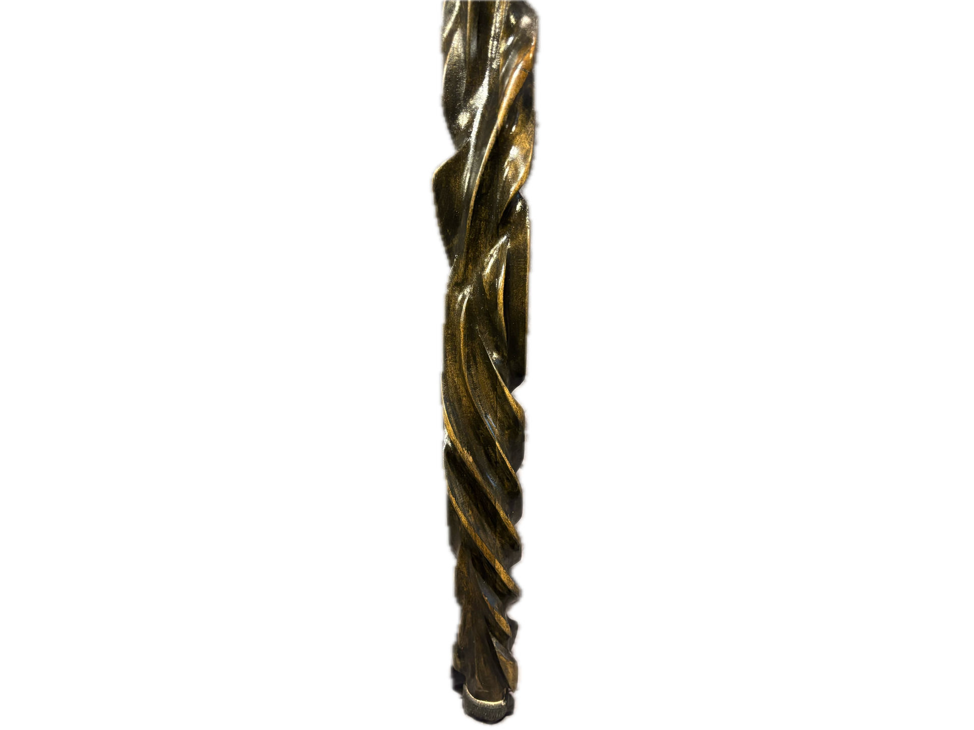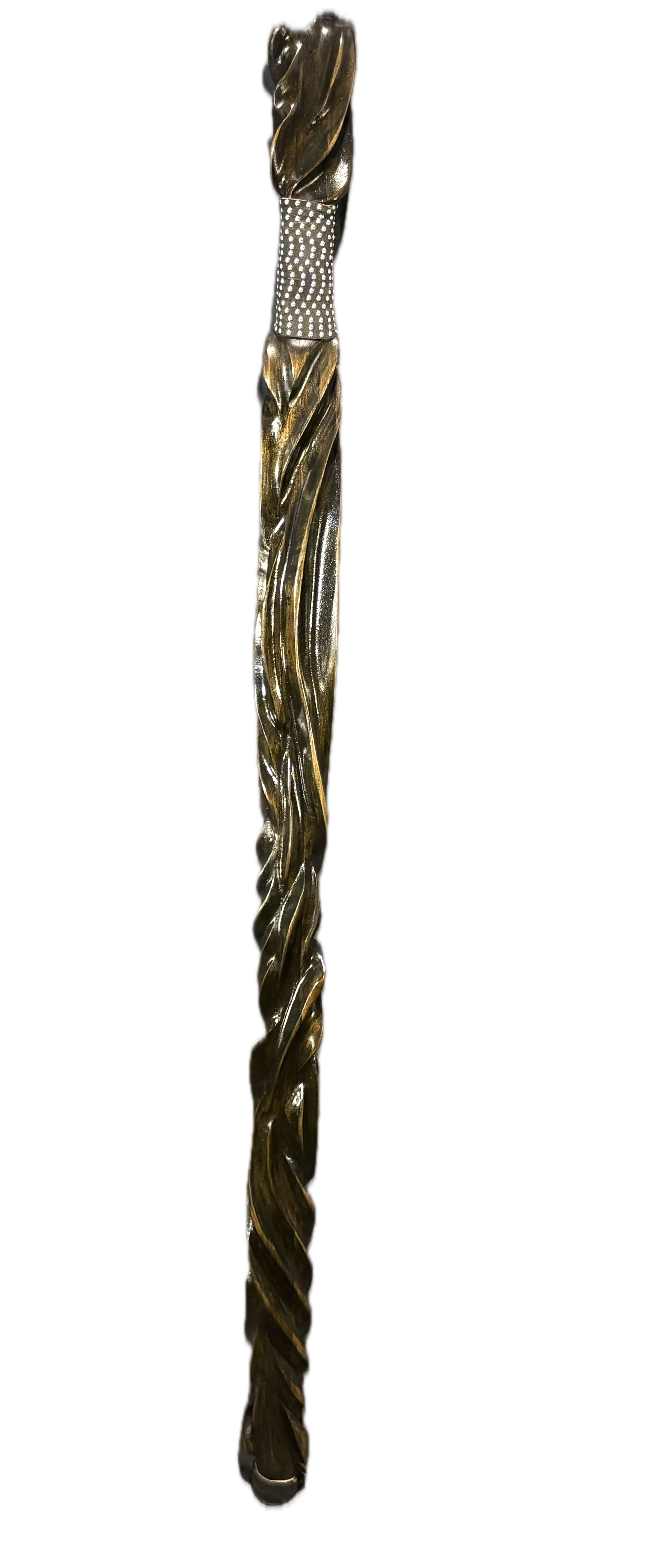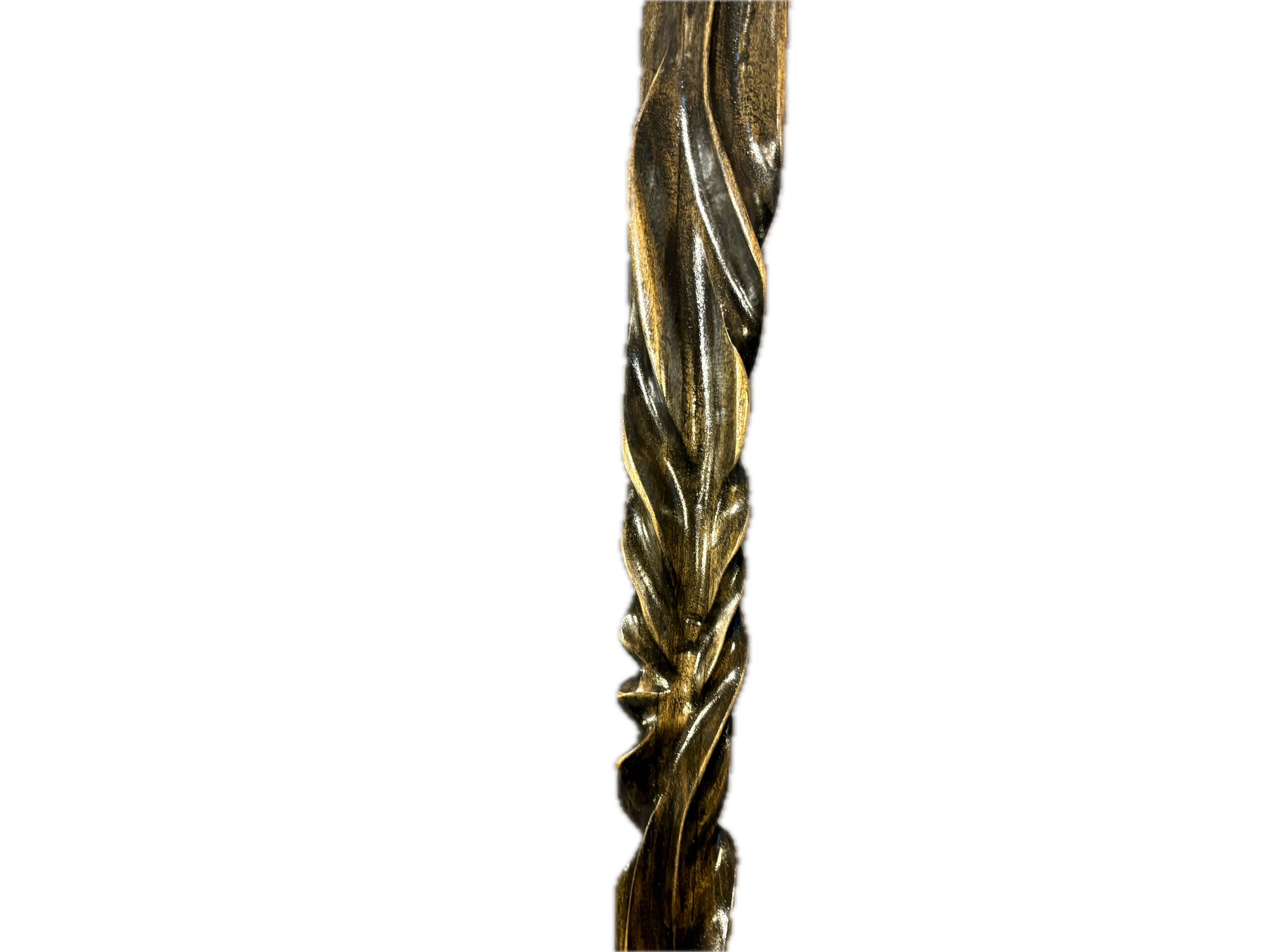 Nightshade a meticulous handcrafted black staff , exudes an aura of enigmatic elegance. Its intricate twist carvings embody both artistry and mystery, making it a captivating addition to your collection. Nightshade is 48 1/2 inches tall , and it is 2 1/2 by 1 1/4 wide.Nightshade was made from poplar.It is very lightweight but a strong wood.