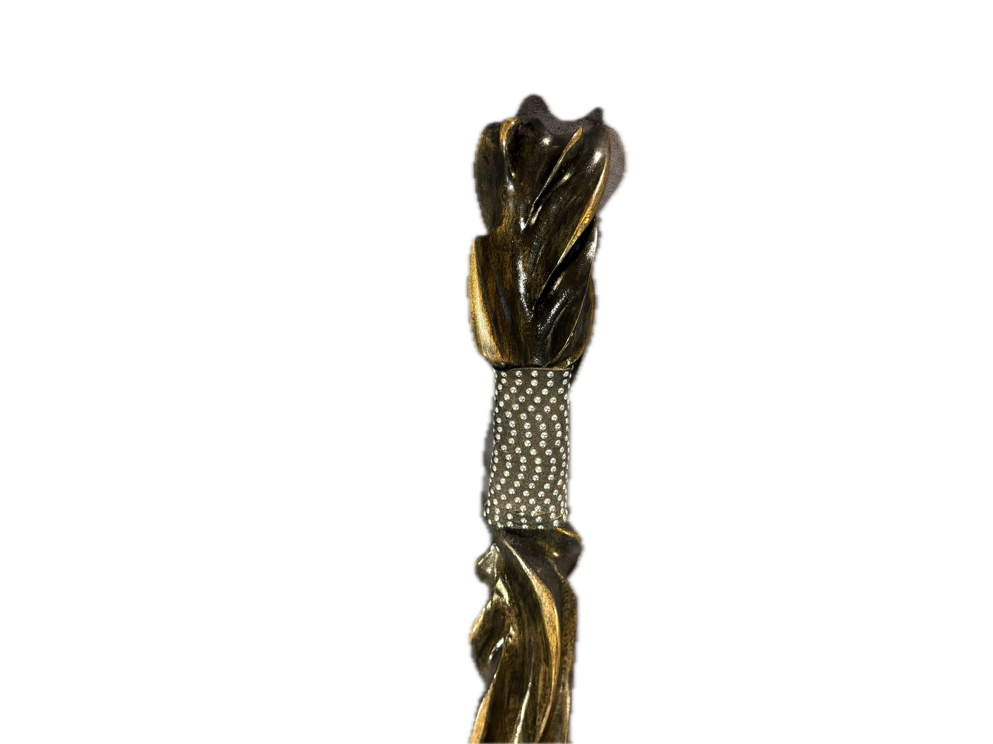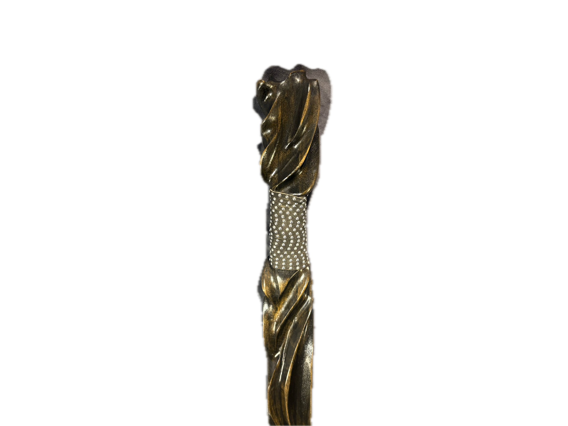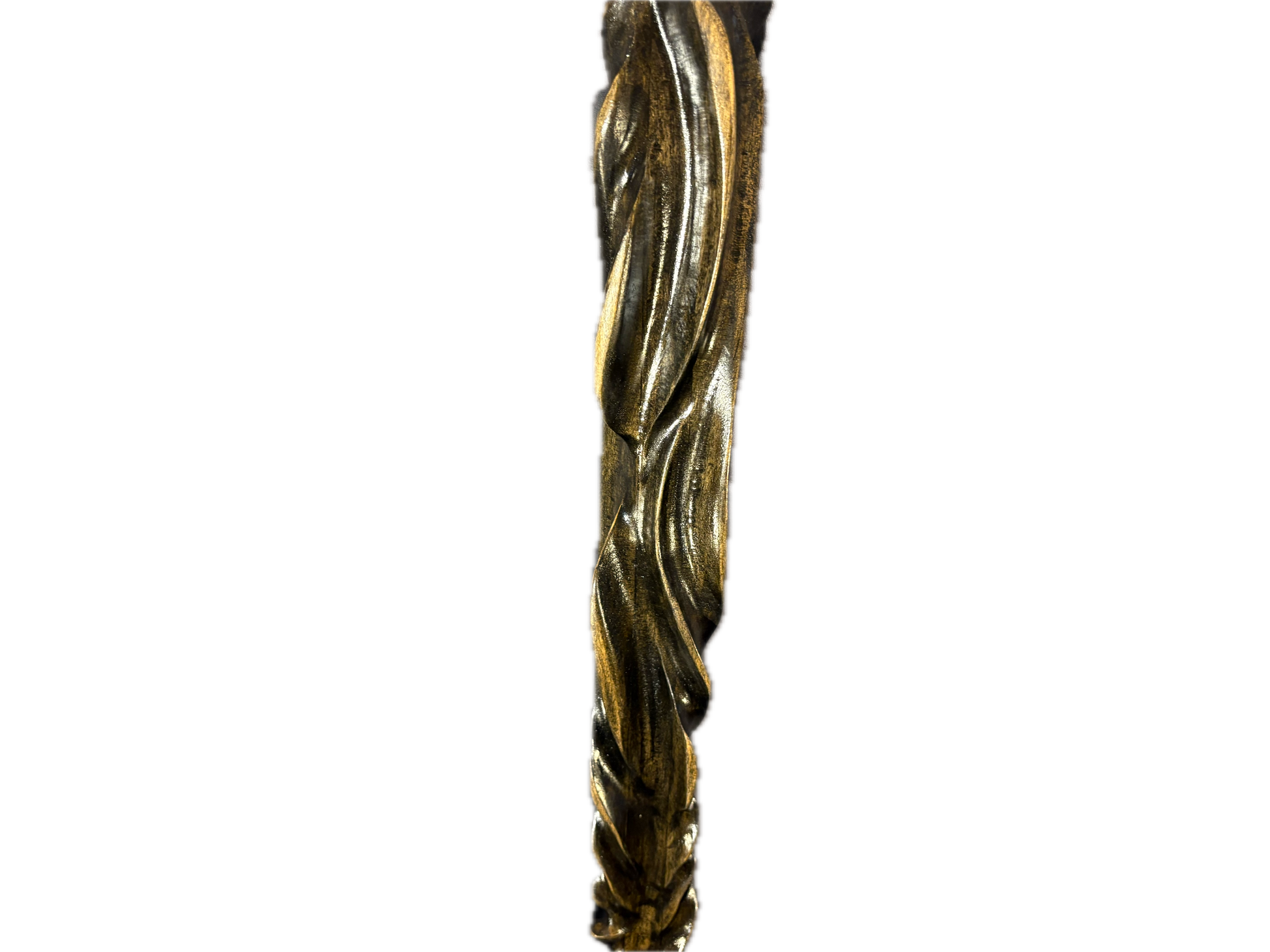 Nightshade a meticulous handcrafted black staff , exudes an aura of enigmatic elegance. Its intricate twist carvings embody both artistry and mystery, making it a captivating addition to your collection. Nightshade is 48 1/2 inches tall , and it is 2 1/2 by 1 1/4 wide.Nightshade was made from poplar.It is very lightweight but a strong wood.