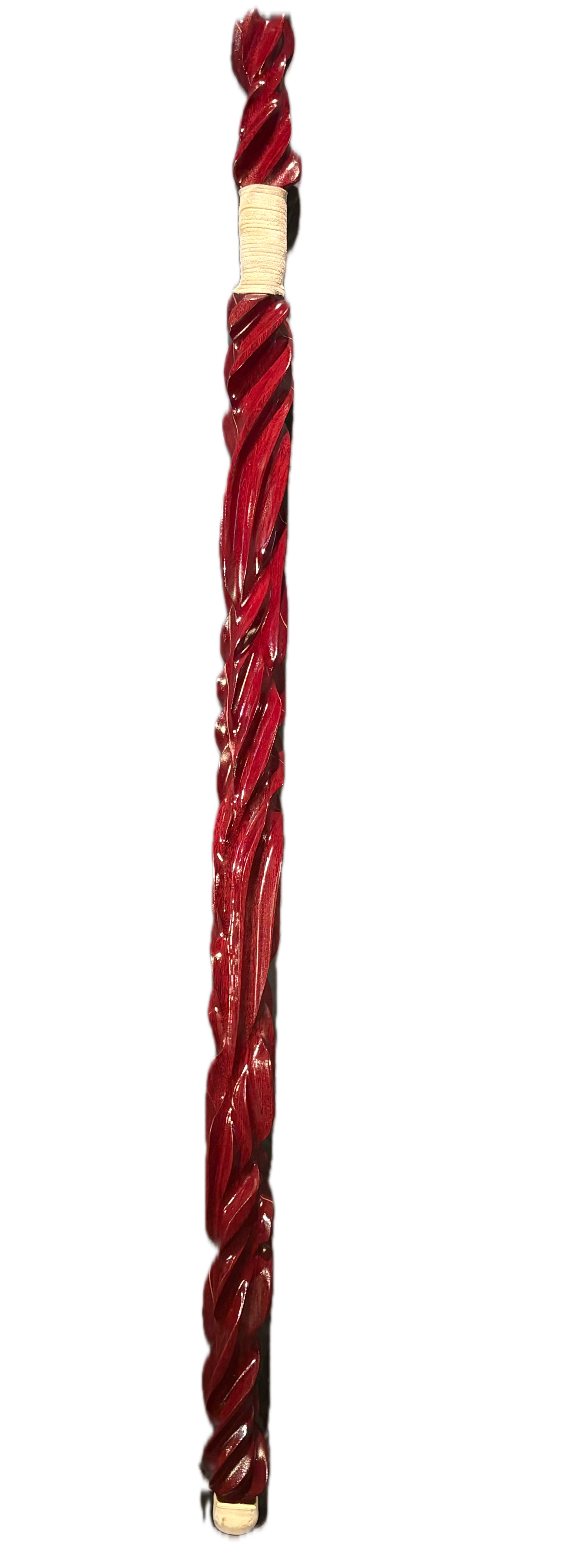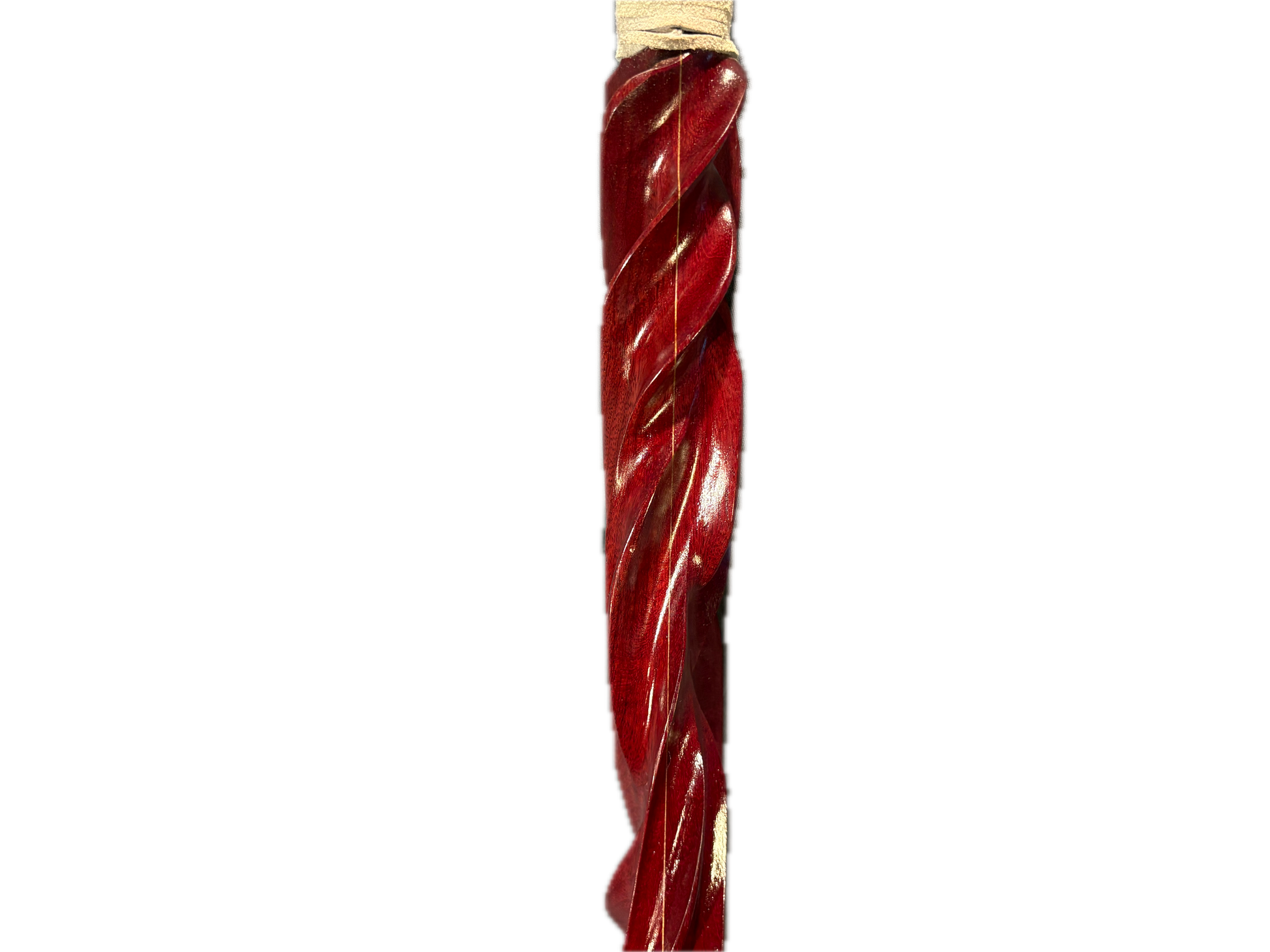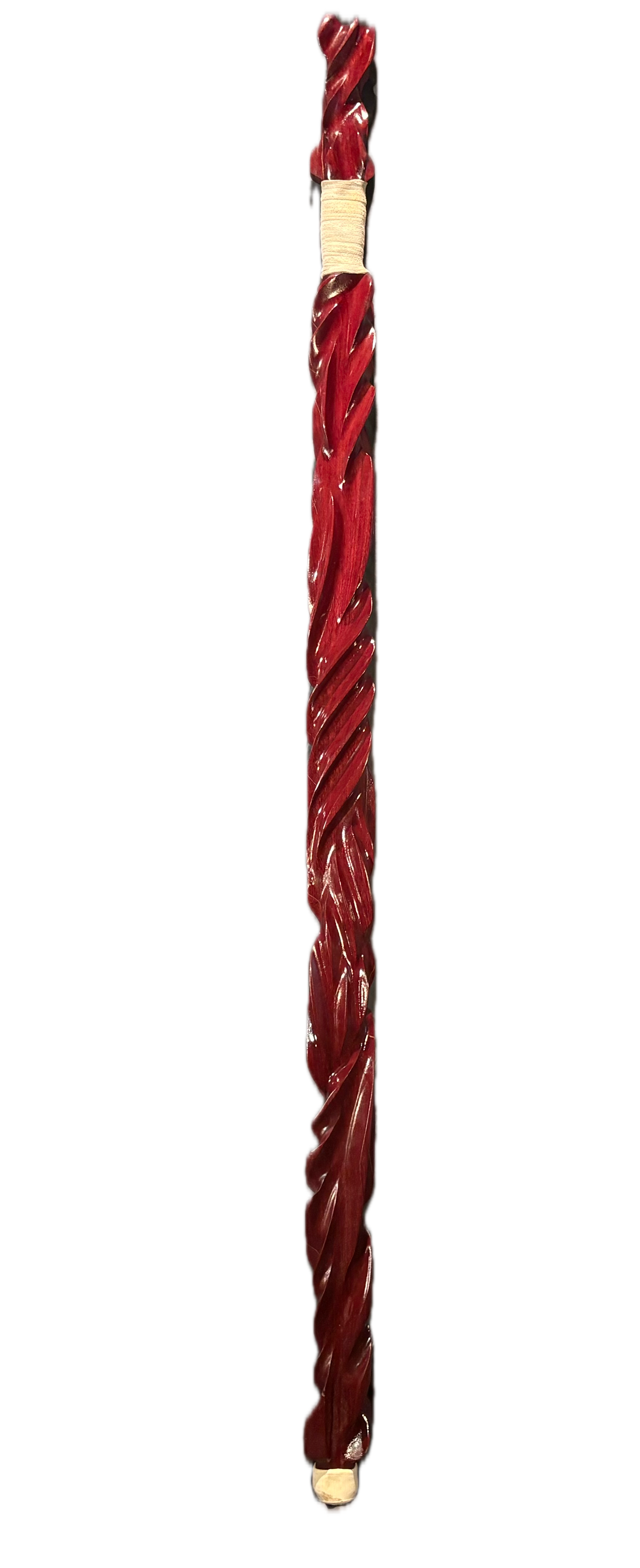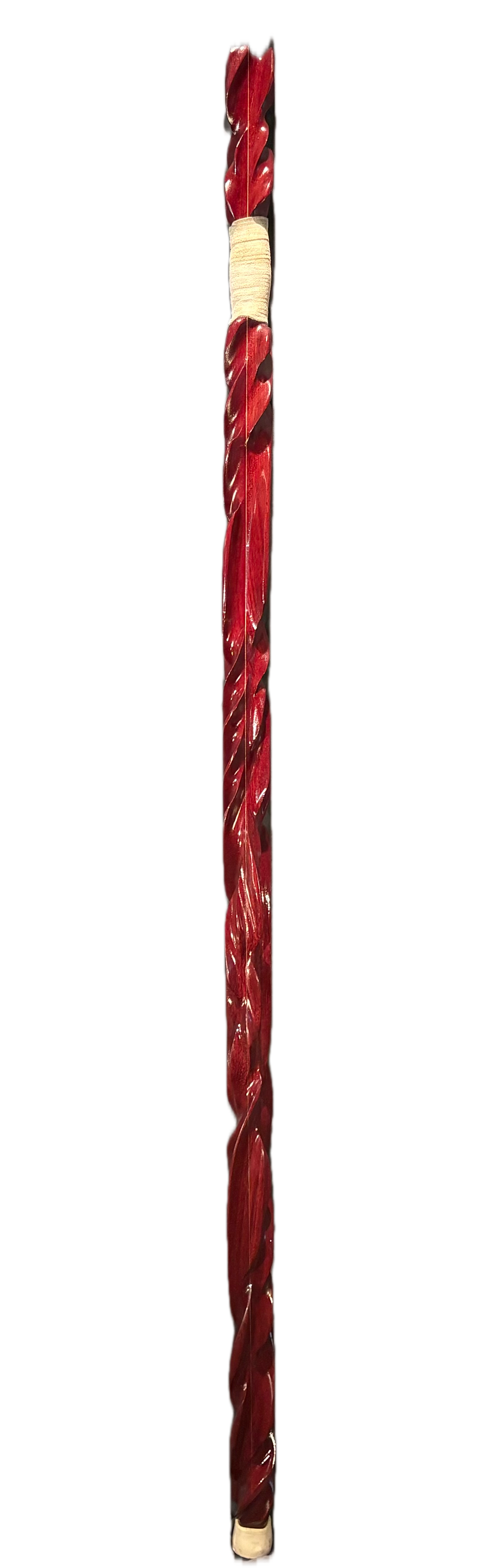 A striking staff crafted from genuine Purple Heart wood , showcasing a deep , vibrant plum hue and a beautiful twisted design. Rich in color and character, it’s finely polished to reveal the natural luster of the grain-bold , refined, and built to leave an impression with anyone that sees you with this peice of art. This Purple Heart staff is 51 inches tall.