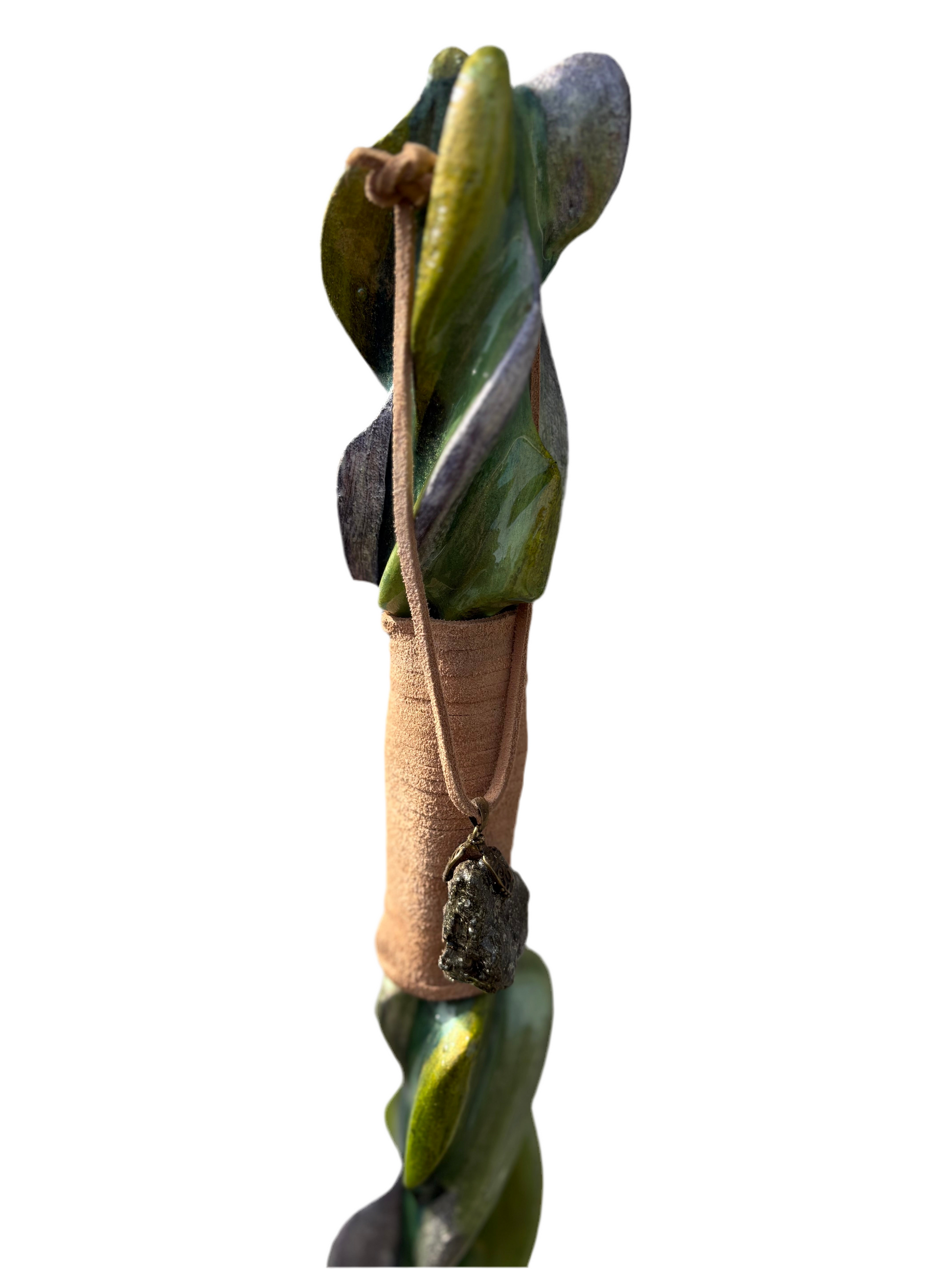 Pyrite thorn- threaded with dusky green and ash-gray tones , this elemental staff channels the deceptive gleam of fools gold. Rugged yet elegant, it evokes a forest relic infused with earthen magic and sly intent. With a sharp visual texture-perfect for welders who walk the line between nature and trickery.pyrite thorn stands at 52 inches tall and is 2 by 2 1/2 inches wide and has a green epoxy finish.