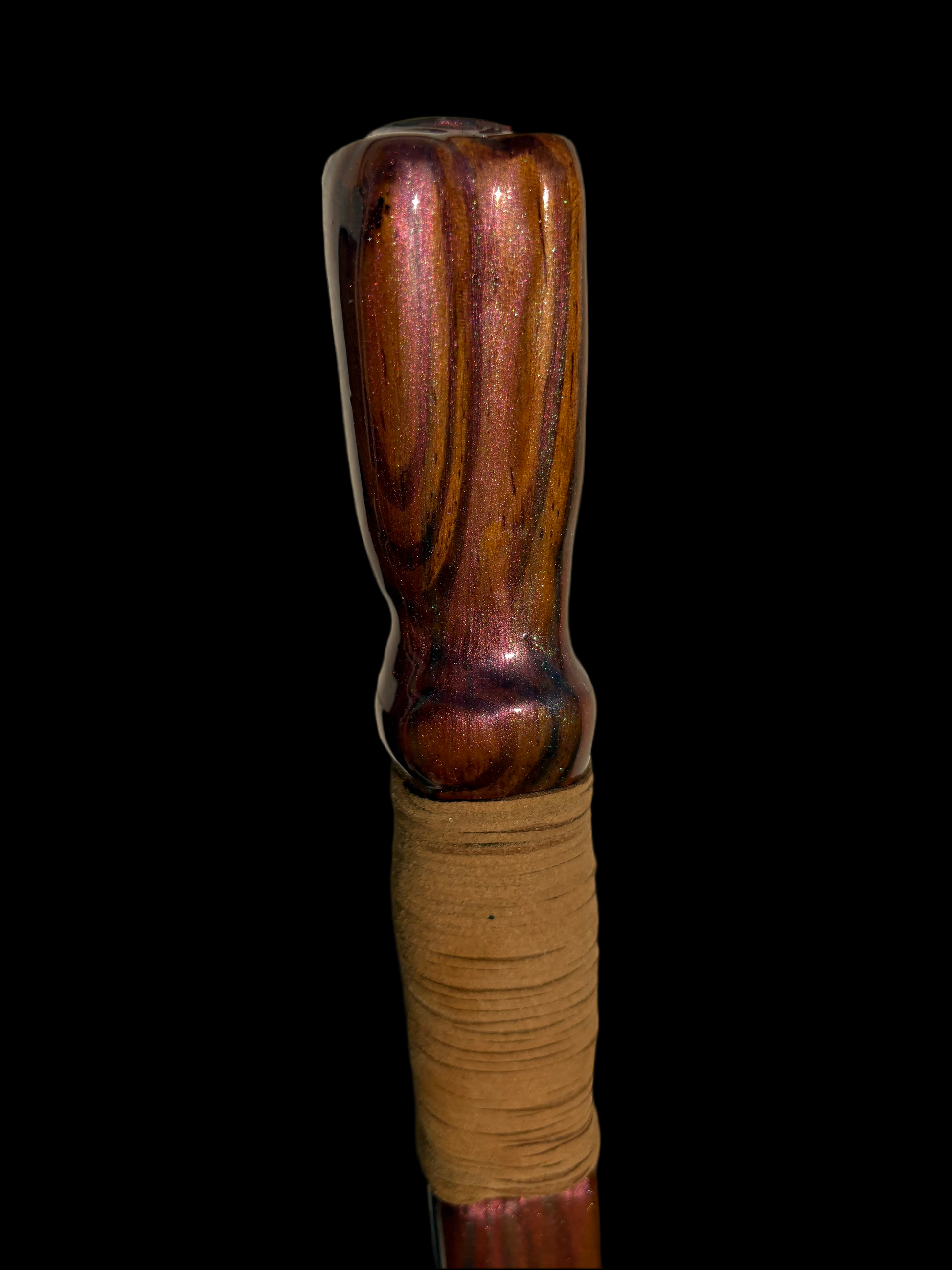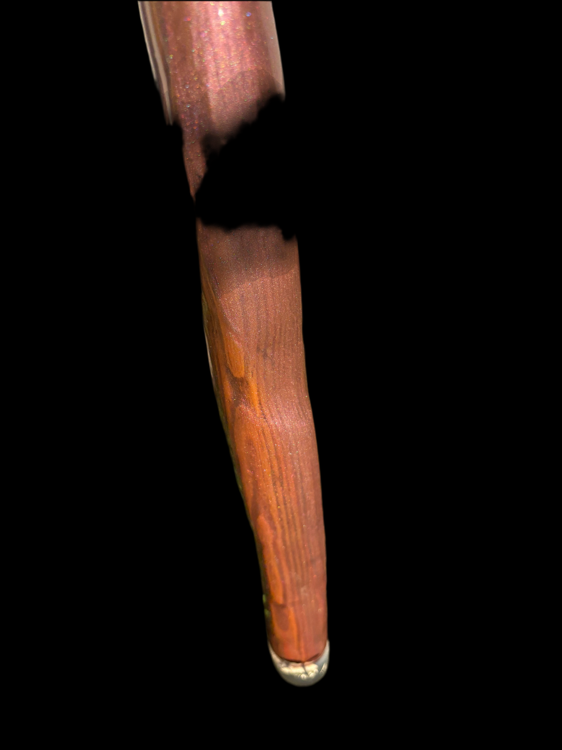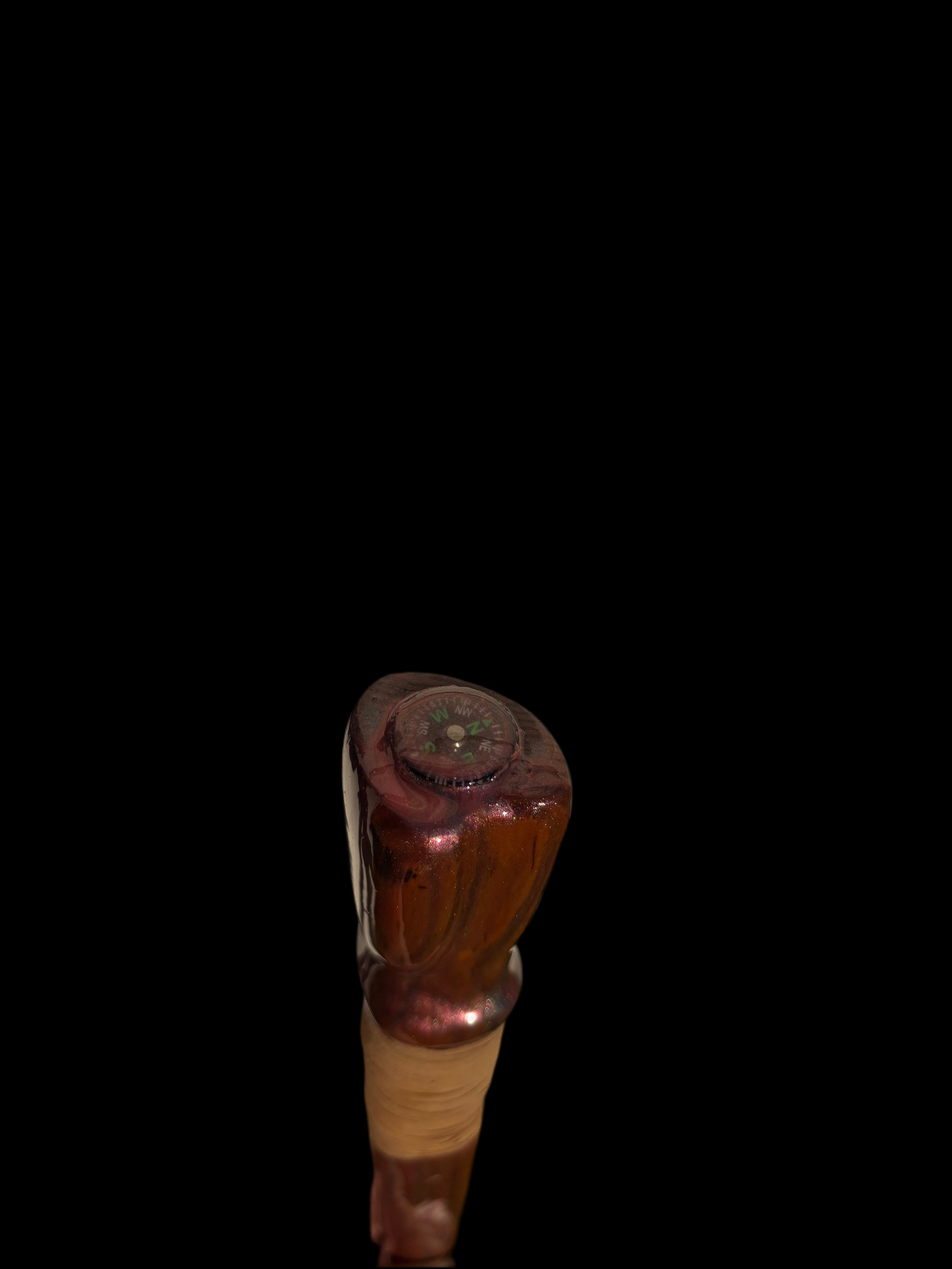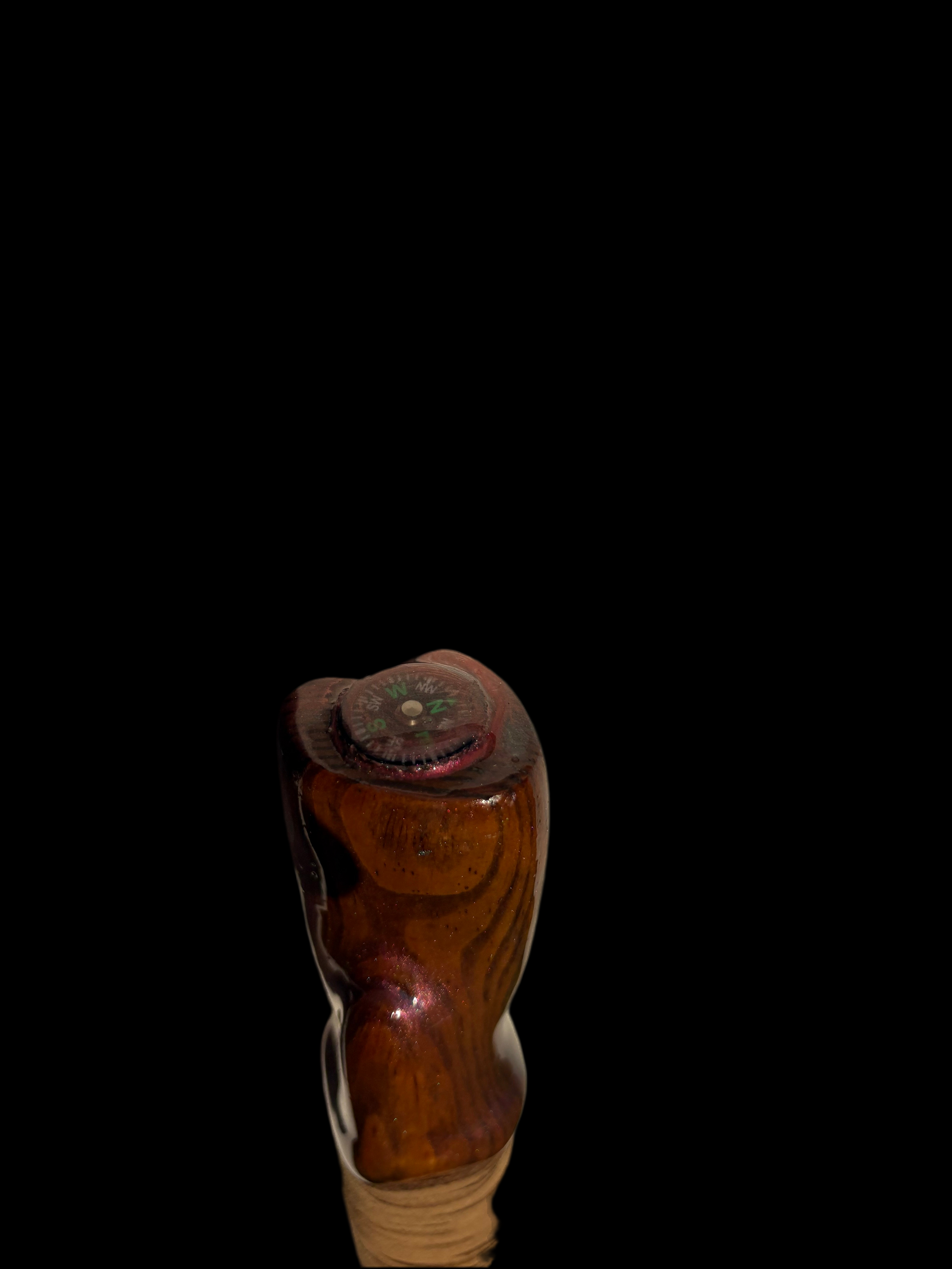Rose trail- glittered compass staff. A luminous blend of elegance and adventure. This handcrafted staff features a transparent pink epoxy finish that shimmers with every step. Rose trail is 44 inches tall and 1 1/4 by 1 1/4 inches wide.