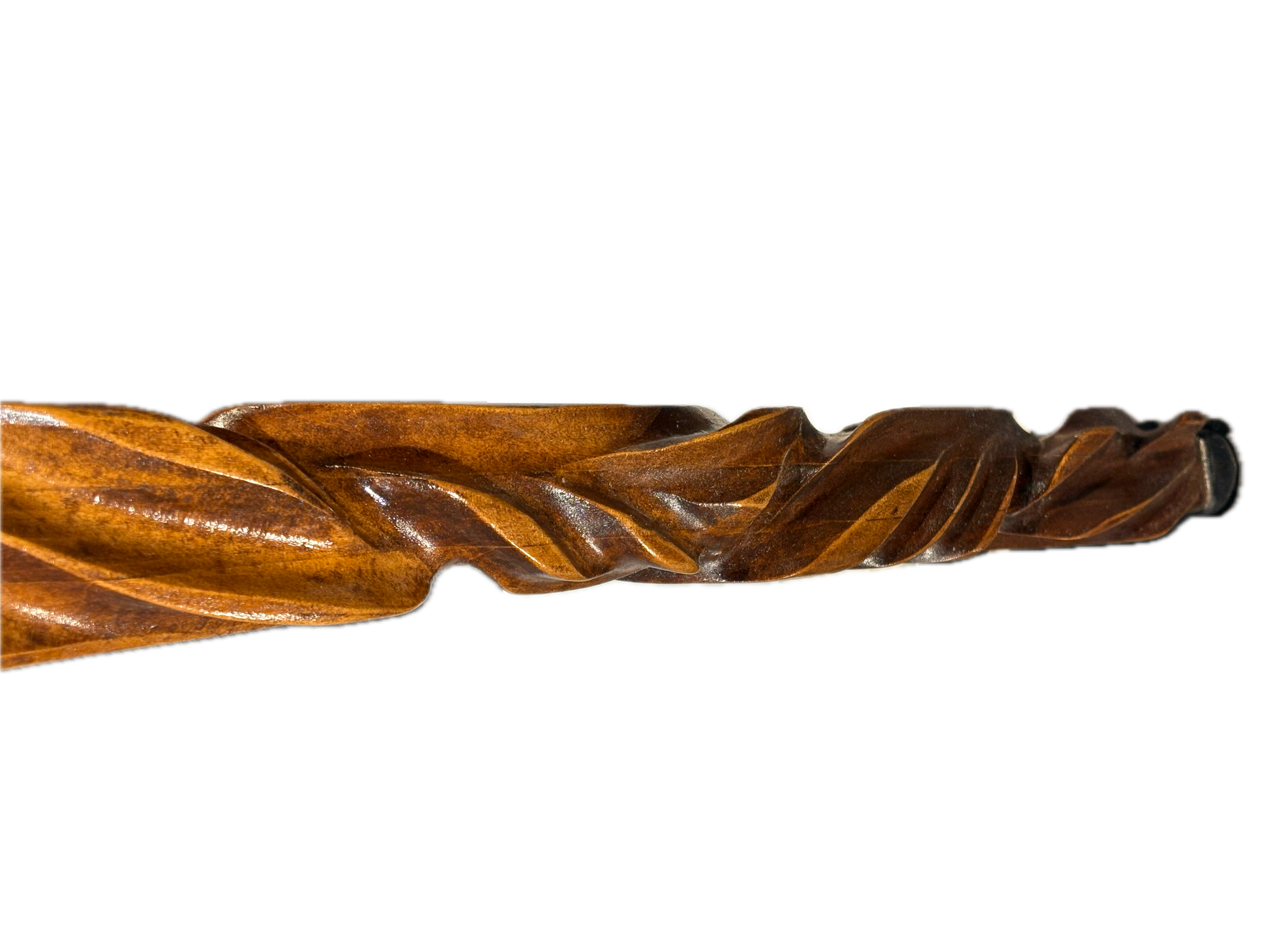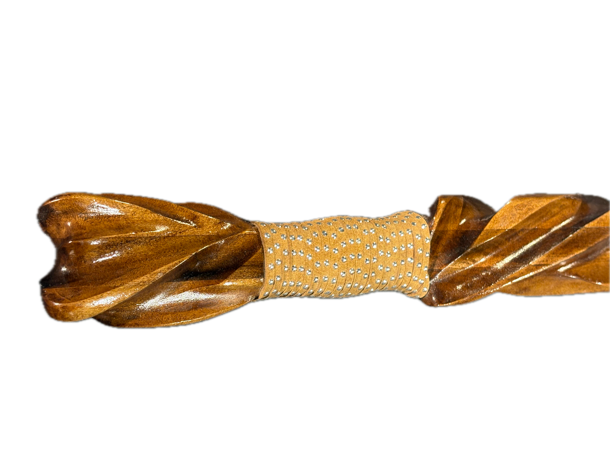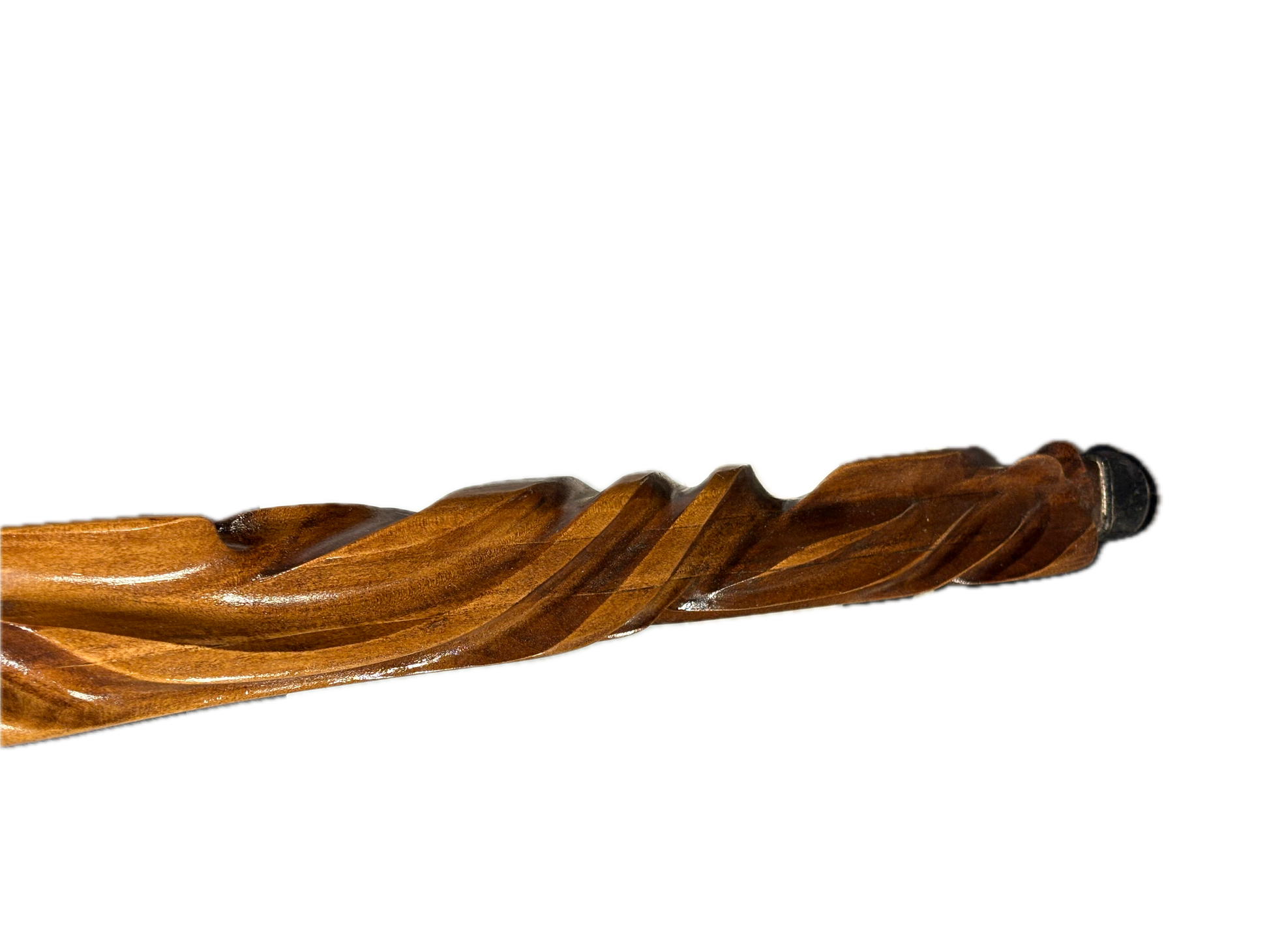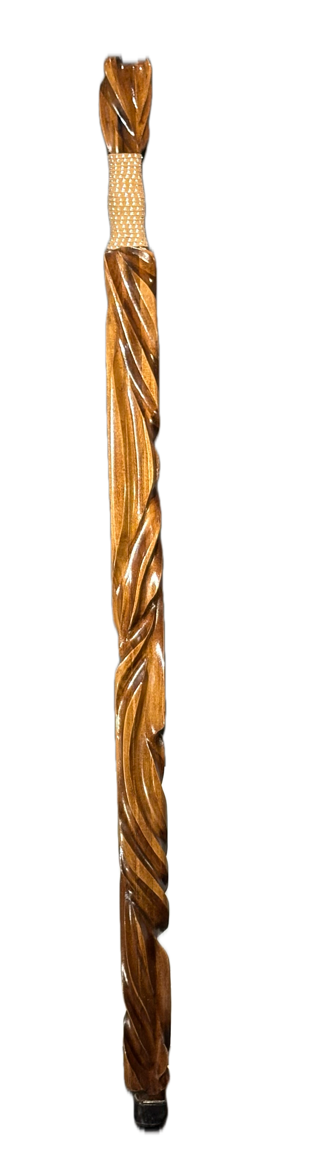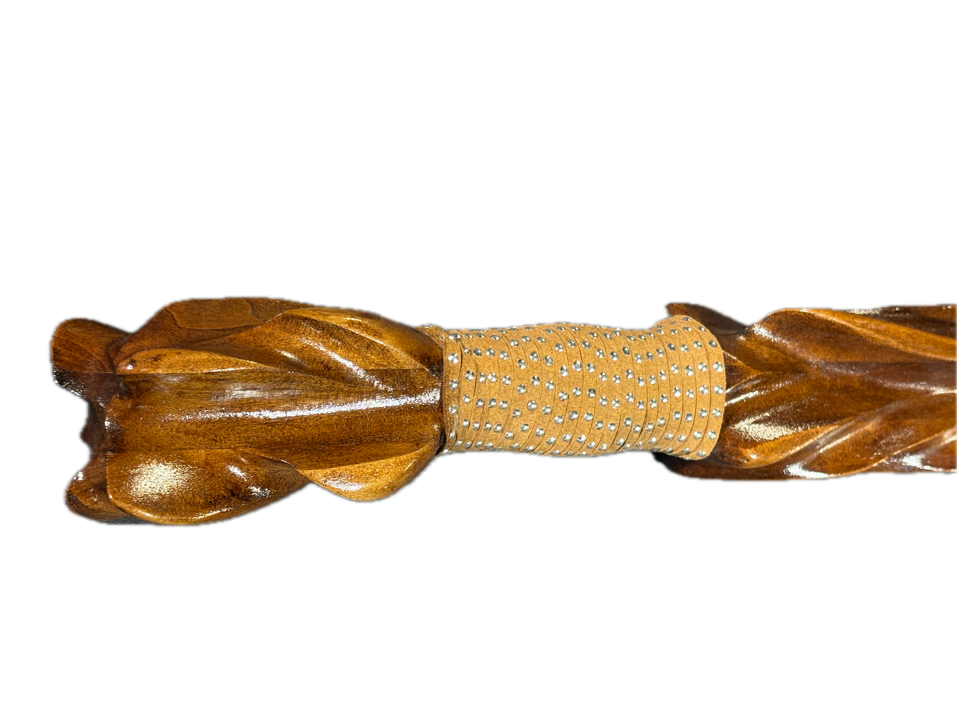 Sentinel- Solid and steady, sentinel features a smooth brown shaft crowned with a grip wrapped in a silver-bead accents. The handle adds a modern glint to its rustic roots , turning a simple walking stick into a statement of quiet strength and subtle style. Sentinel stands at 48 inches tall and is 2 by 1 1/2 inches wide.