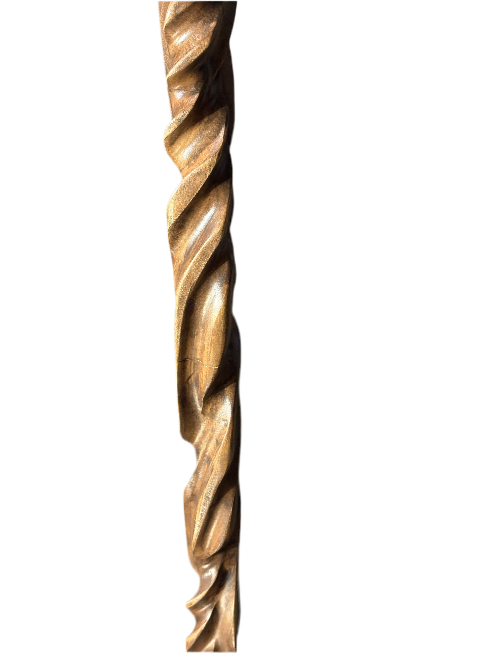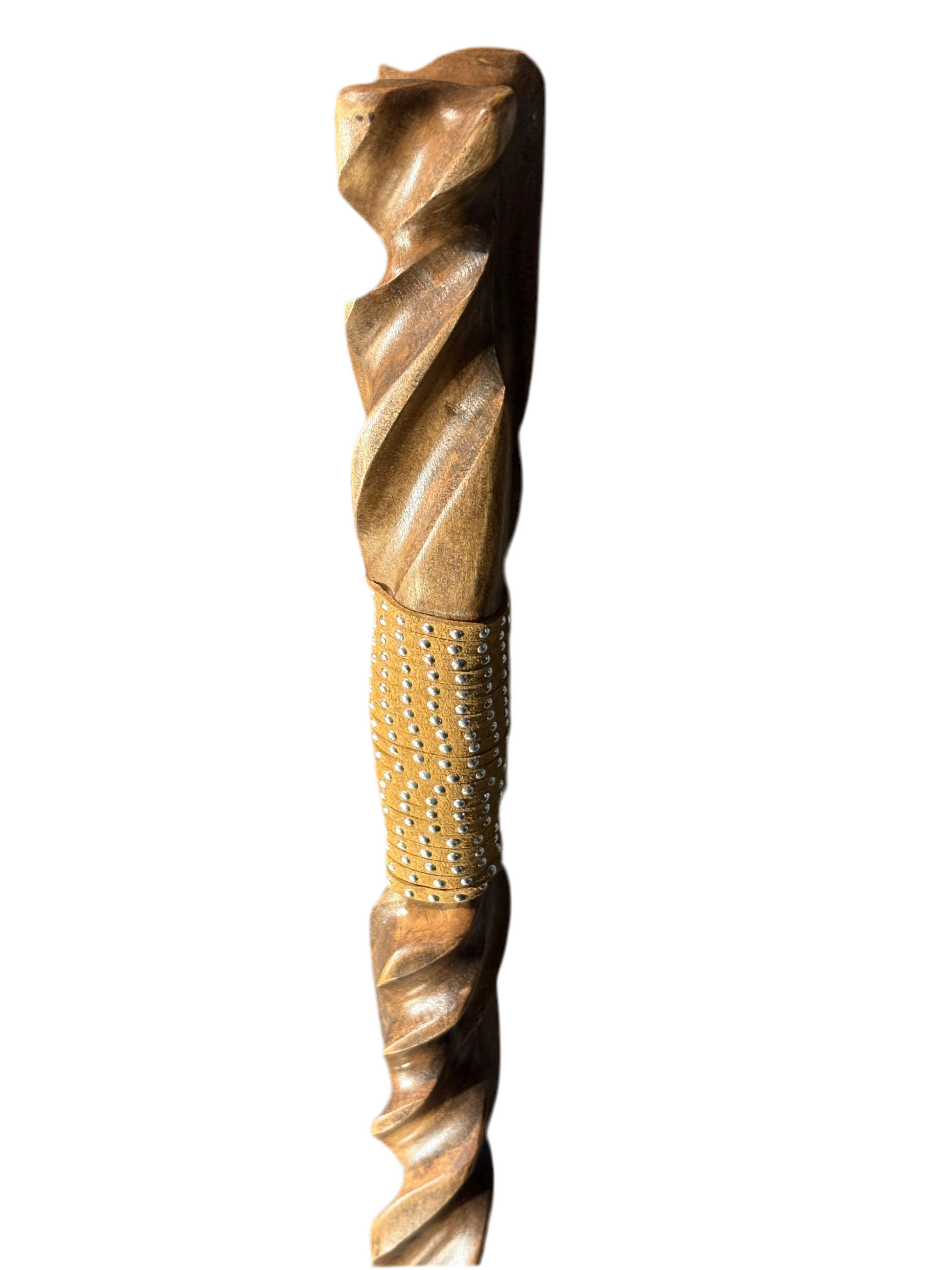 Silver root- A grounded walking stick with a twist of elegance. Its rich brown grain flows naturally, anchored by a handle absorbed with gleaming silver beads. Balanced and bold, it’s quiet statement piece for those who walk with purpose. Silver root stands at 52 inch’s tall and is 1 1/2 by 1 1/2 inch’s wide.