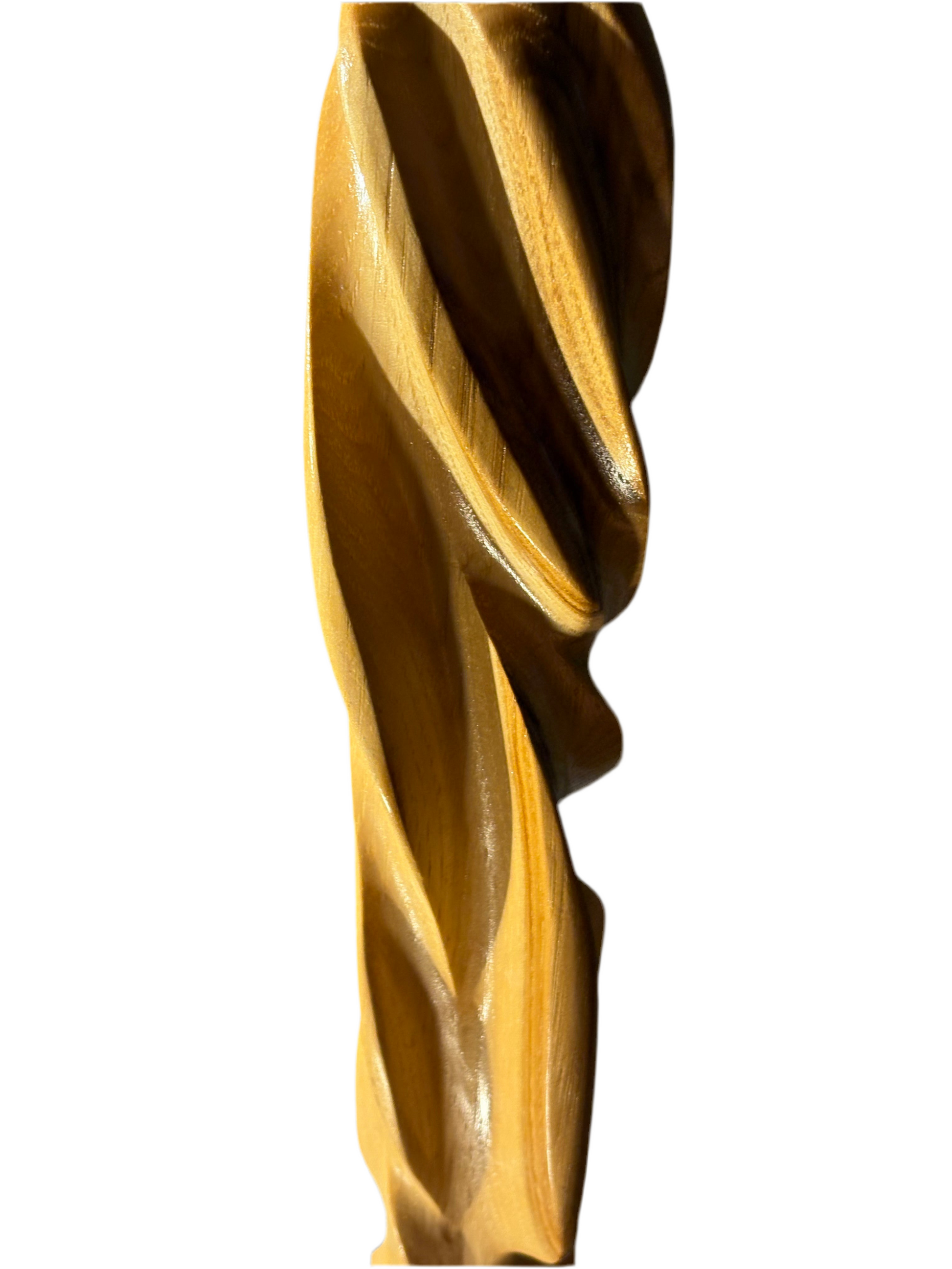 Sly Hickory- hand carved from resilient hickory, this twisted staff blends rugged charm with clever craftsmanship. Tough, sly, and built to last. Sly Hickory stands at 37 inch’s tall and is 2 by 2 1/2 inch’s wide and the ball handle is 2 by 1 1/2 inch’s wide.