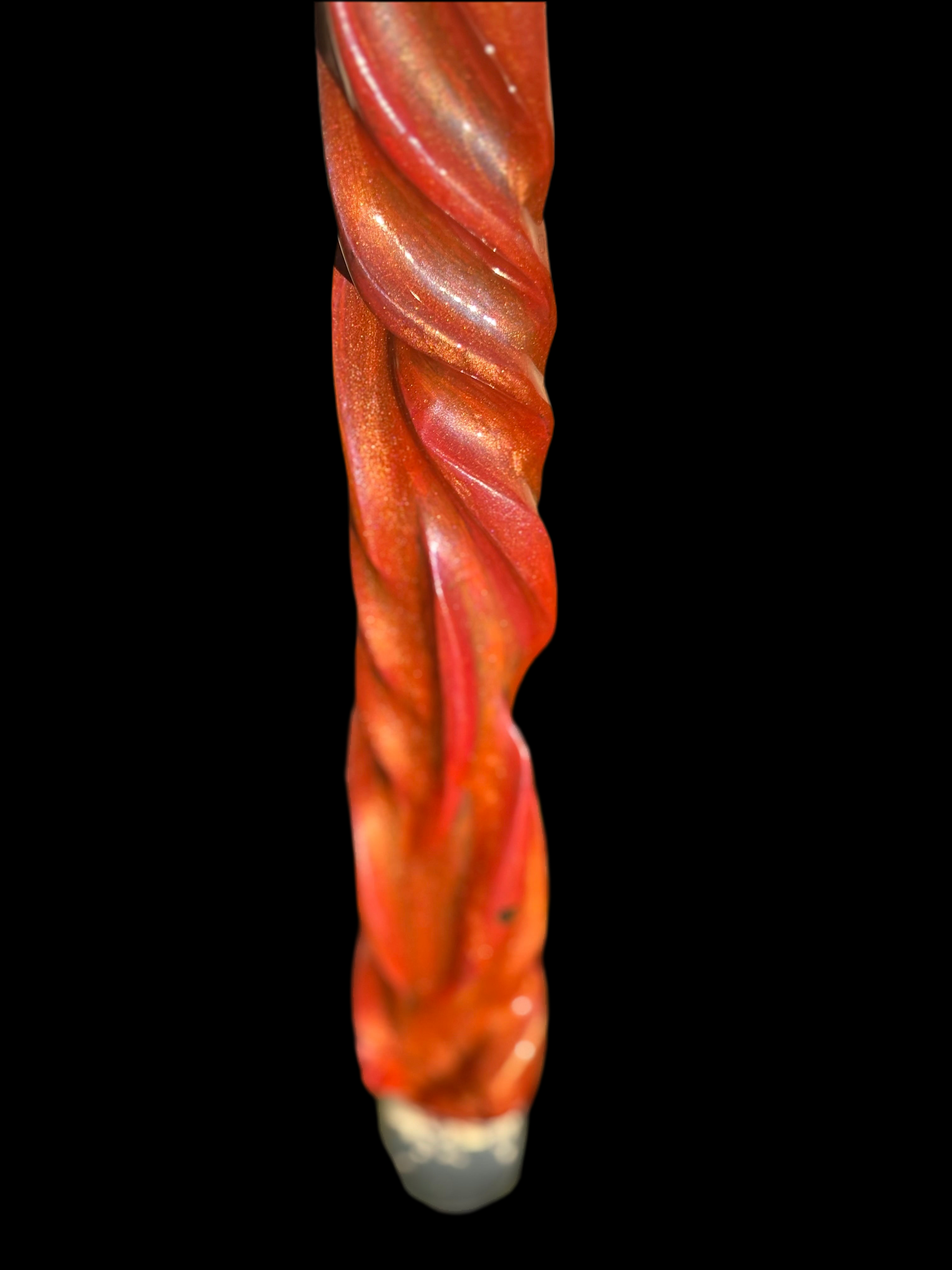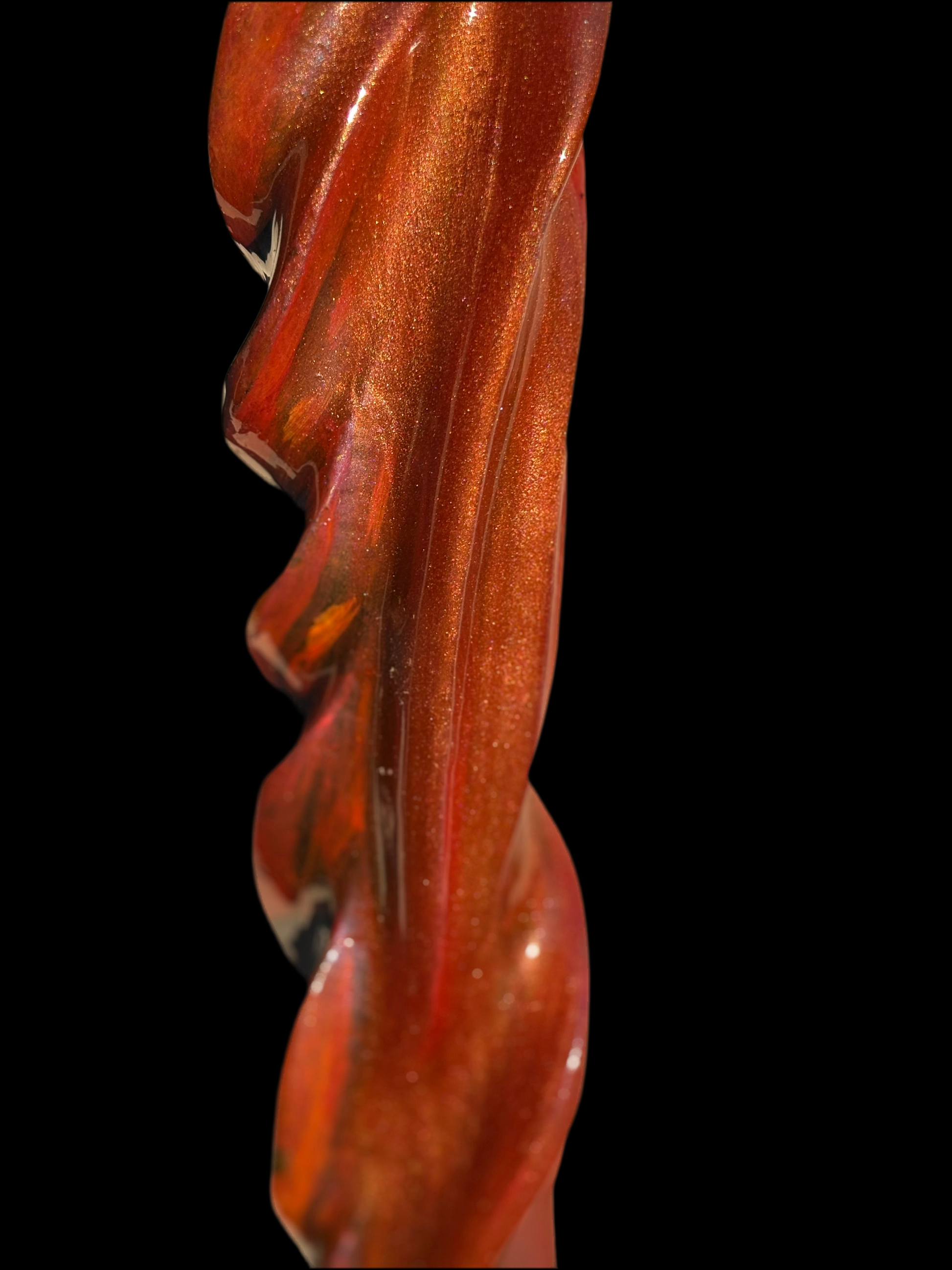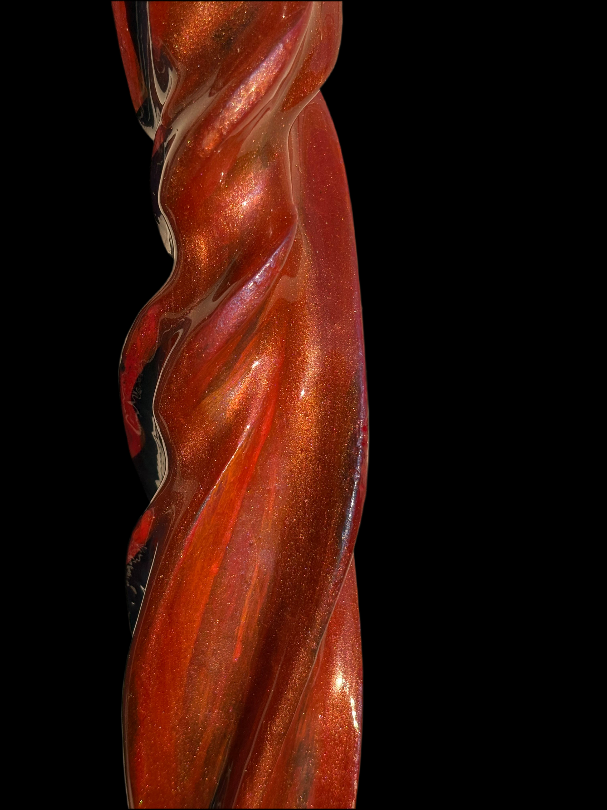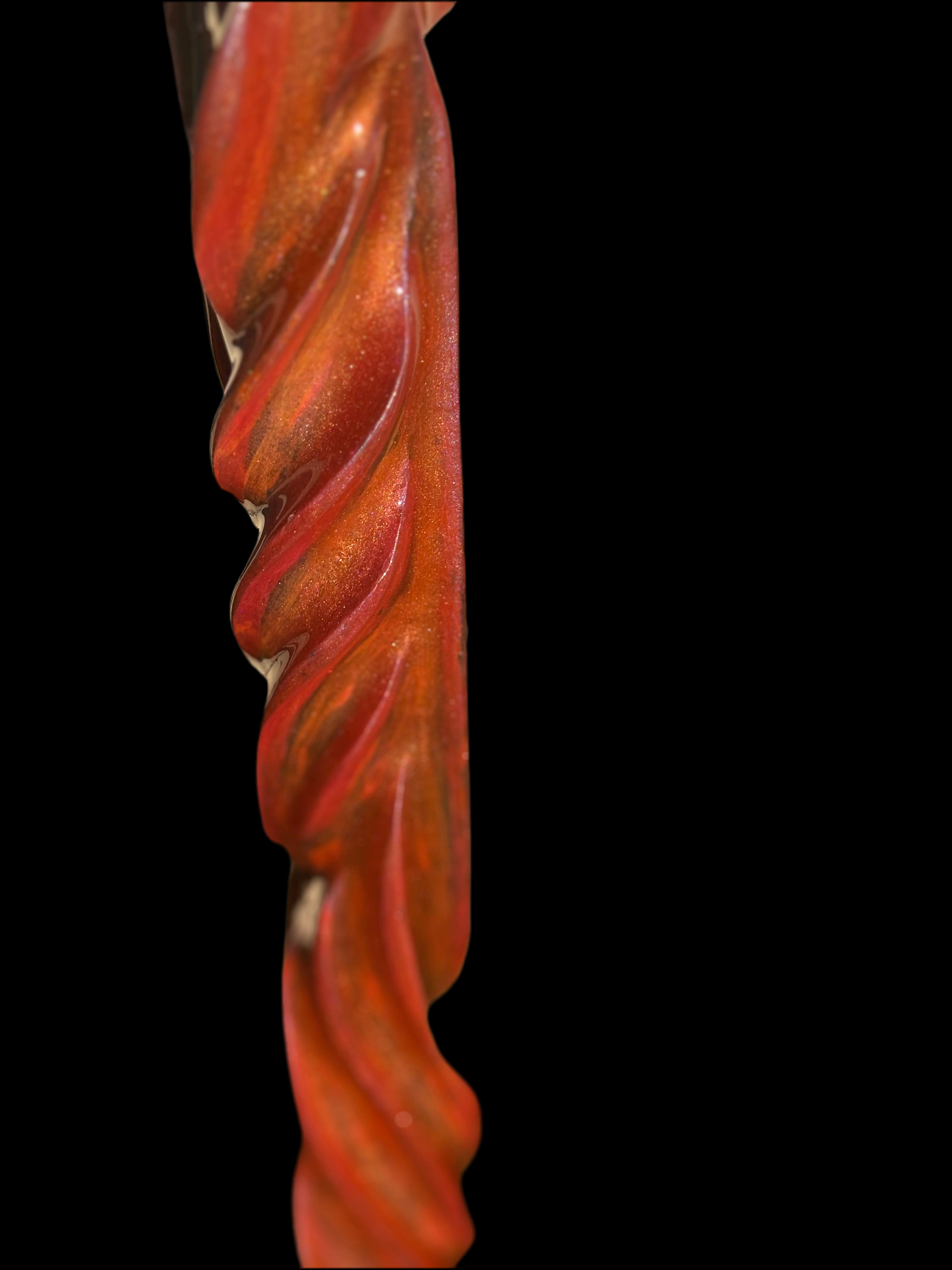 Solar burst- Twisted red staff with orange epoxy finish. Ignite your collection with solar burst. This handcrafted staff blazes in red paint and a Molten orange epoxy finish. It’s twisted shaft catching light like a flame and topped with a spherical accent and cord wrap. Solar burst soars to 54 1/2 inches tall and is 2 1/4 by 2 inches wide.