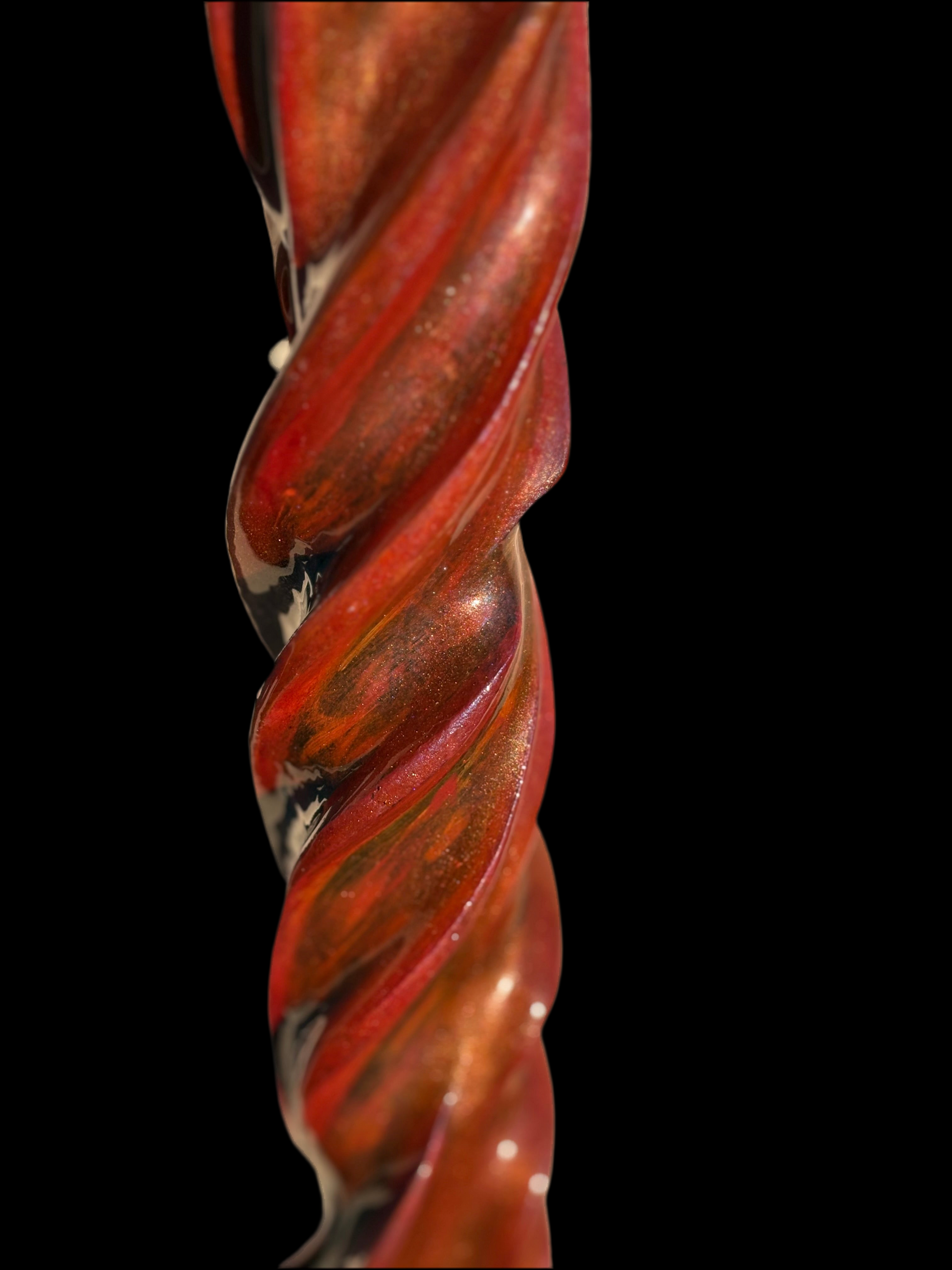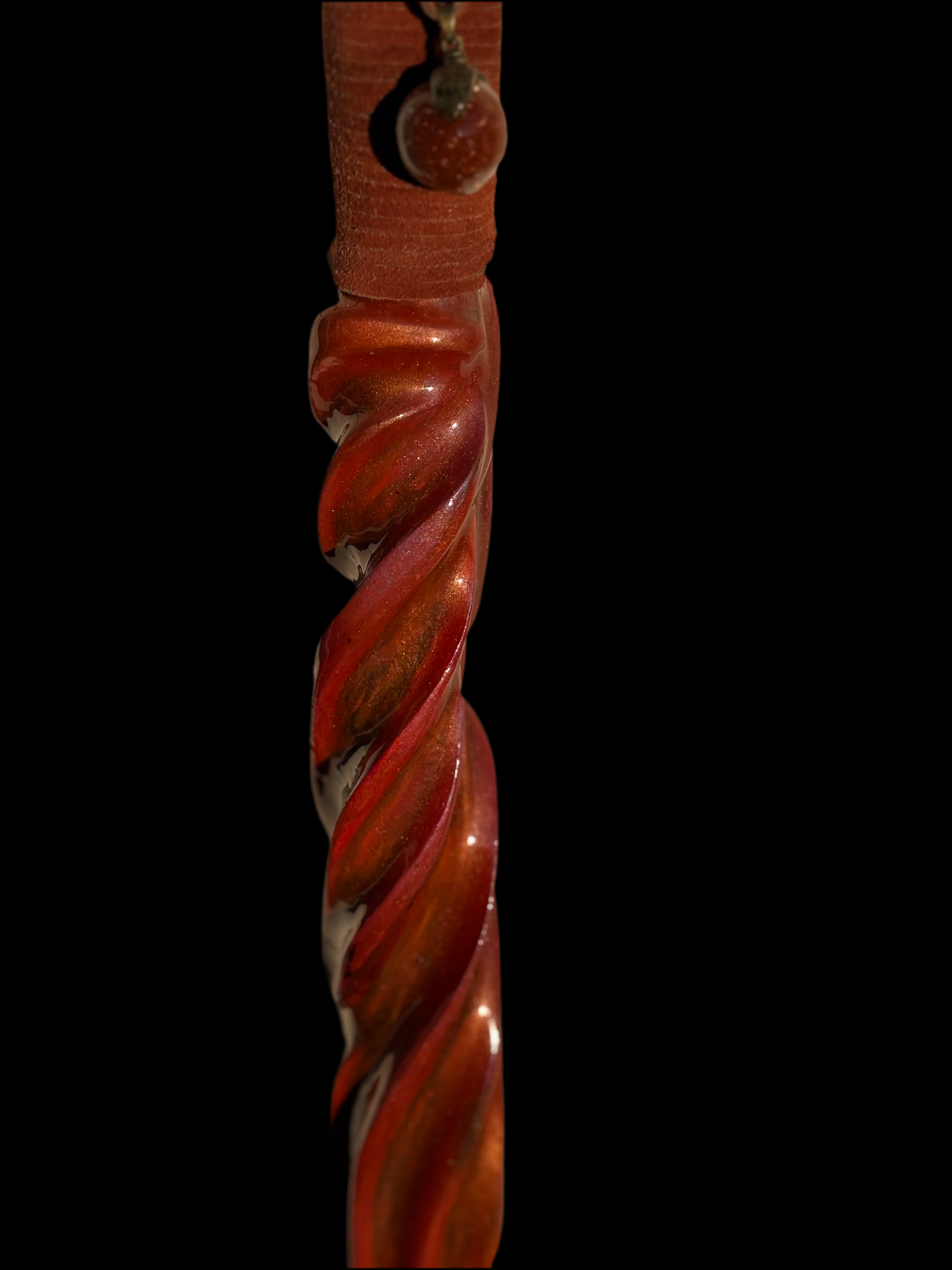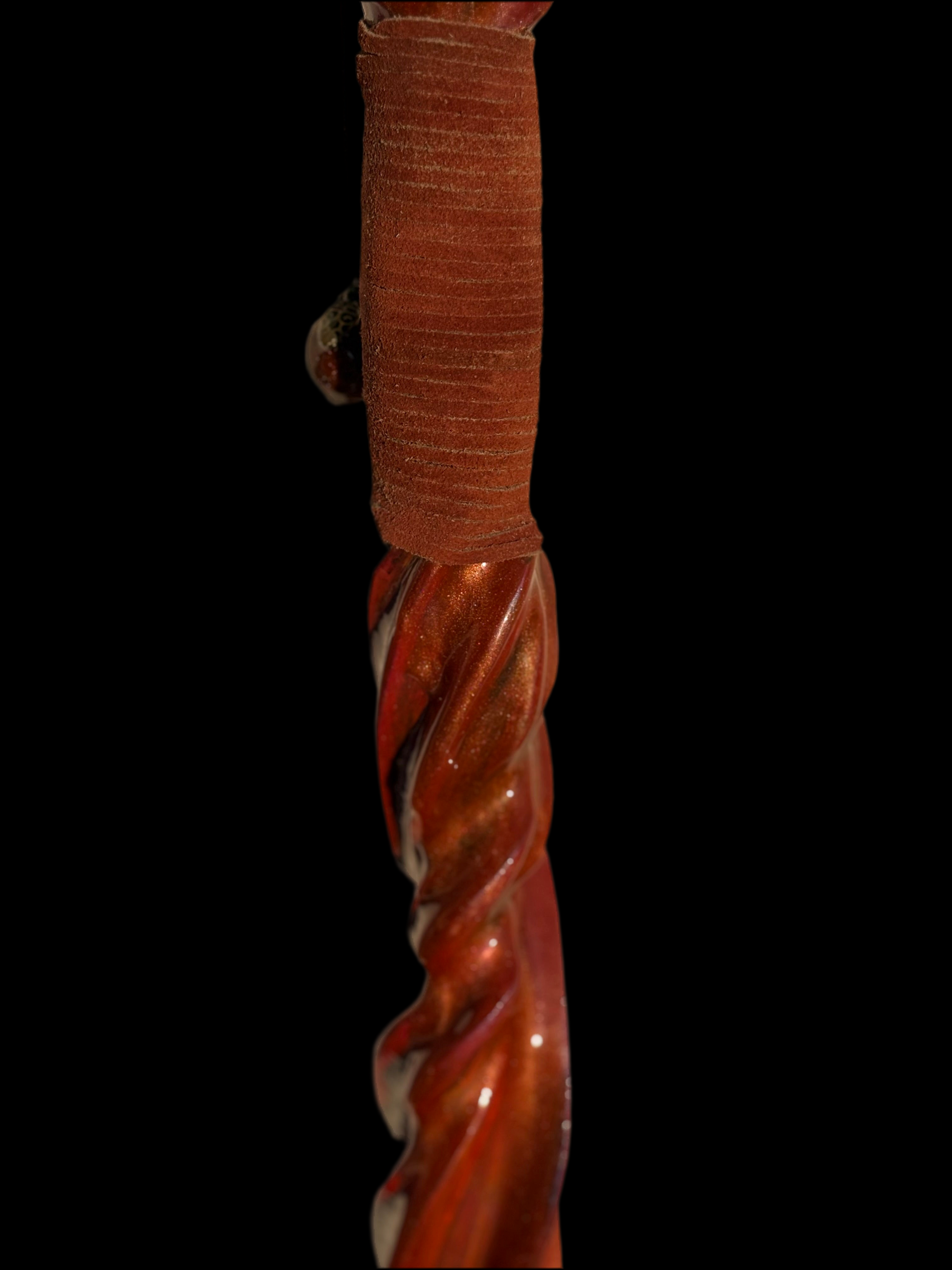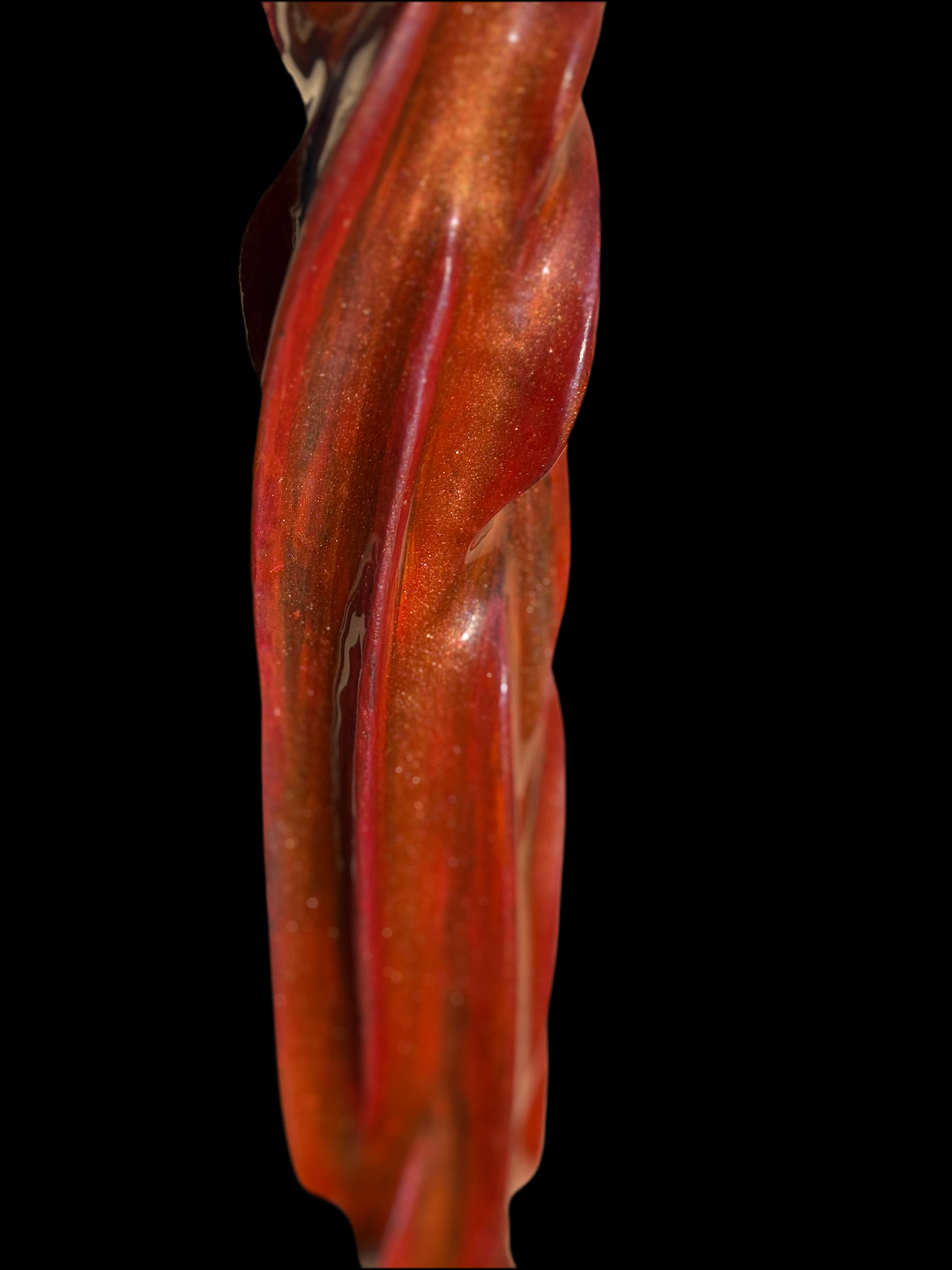 Solar burst- Twisted red staff with orange epoxy finish. Ignite your collection with solar burst. This handcrafted staff blazes in red paint and a Molten orange epoxy finish. It’s twisted shaft catching light like a flame and topped with a spherical accent and cord wrap. Solar burst soars to 54 1/2 inches tall and is 2 1/4 by 2 inches wide.