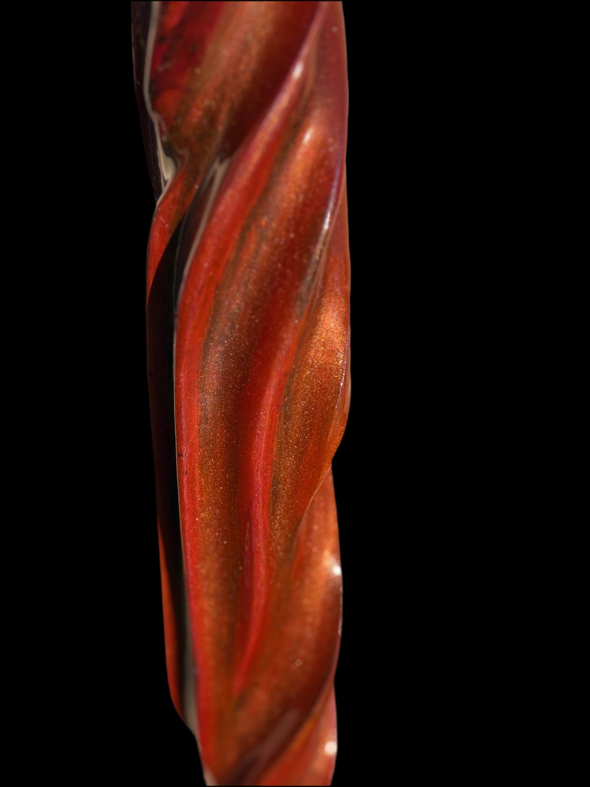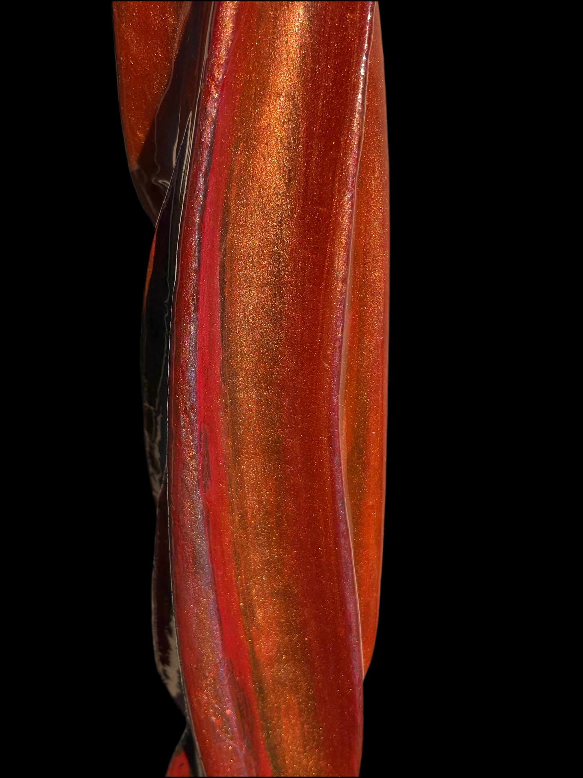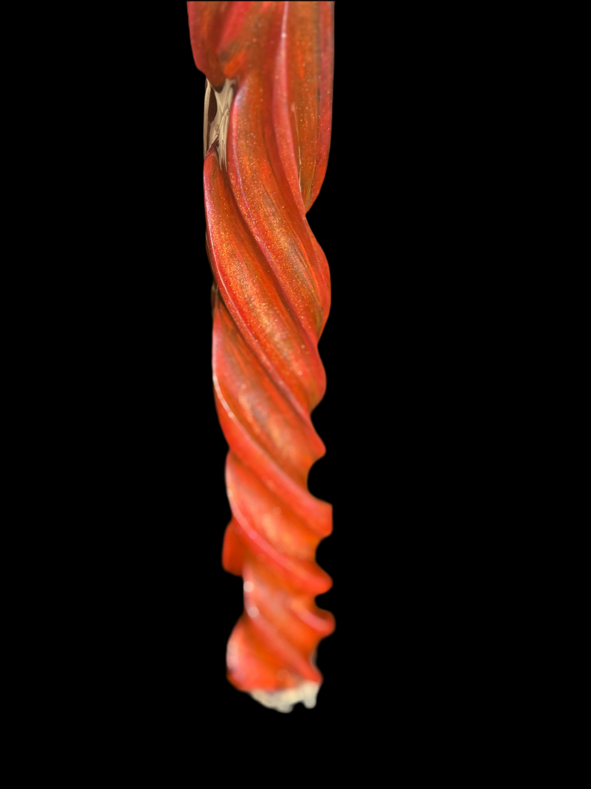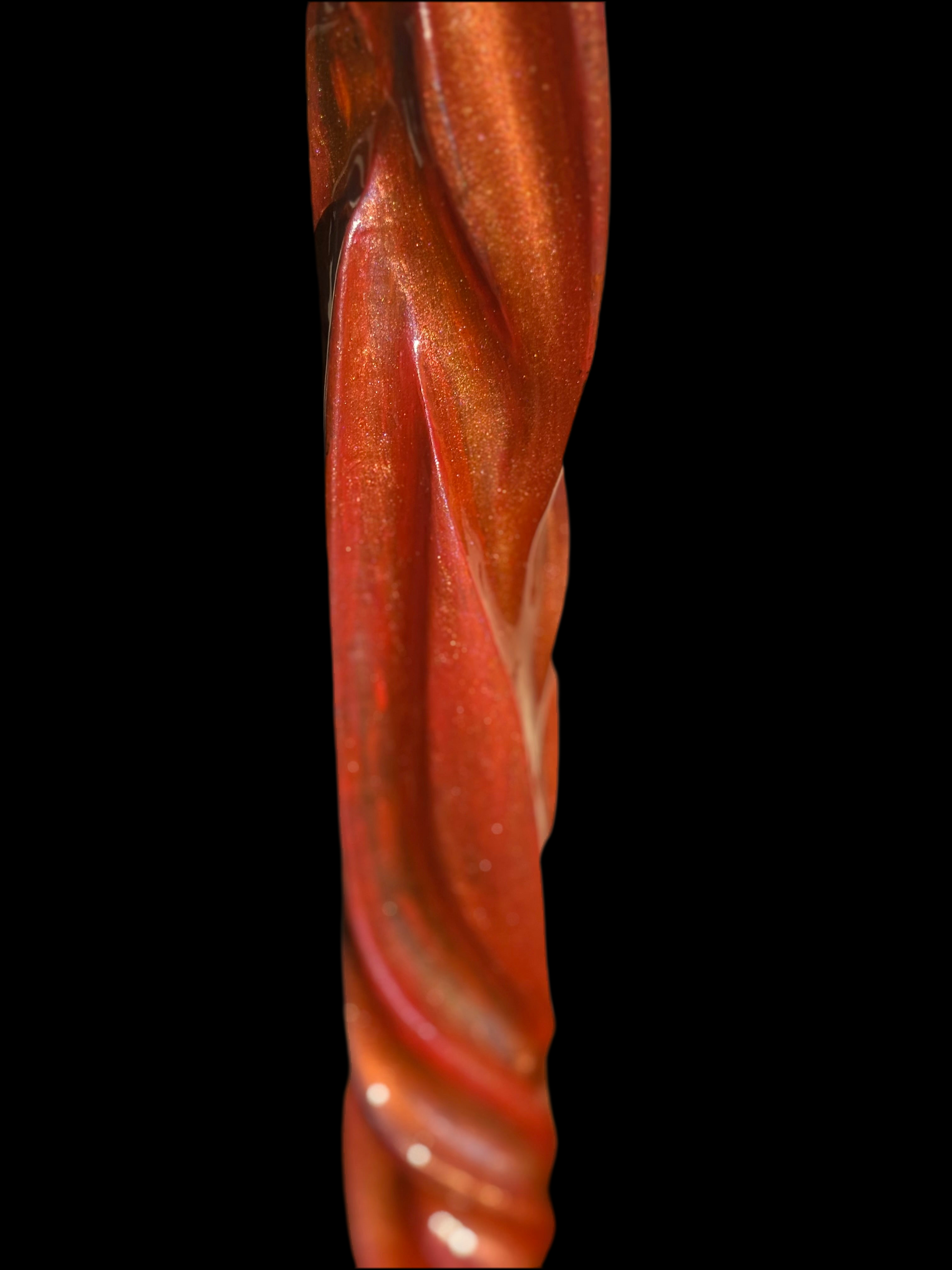 Solar burst- Twisted red staff with orange epoxy finish. Ignite your collection with solar burst. This handcrafted staff blazes in red paint and a Molten orange epoxy finish. It’s twisted shaft catching light like a flame and topped with a spherical accent and cord wrap. Solar burst soars to 54 1/2 inches tall and is 2 1/4 by 2 inches wide.