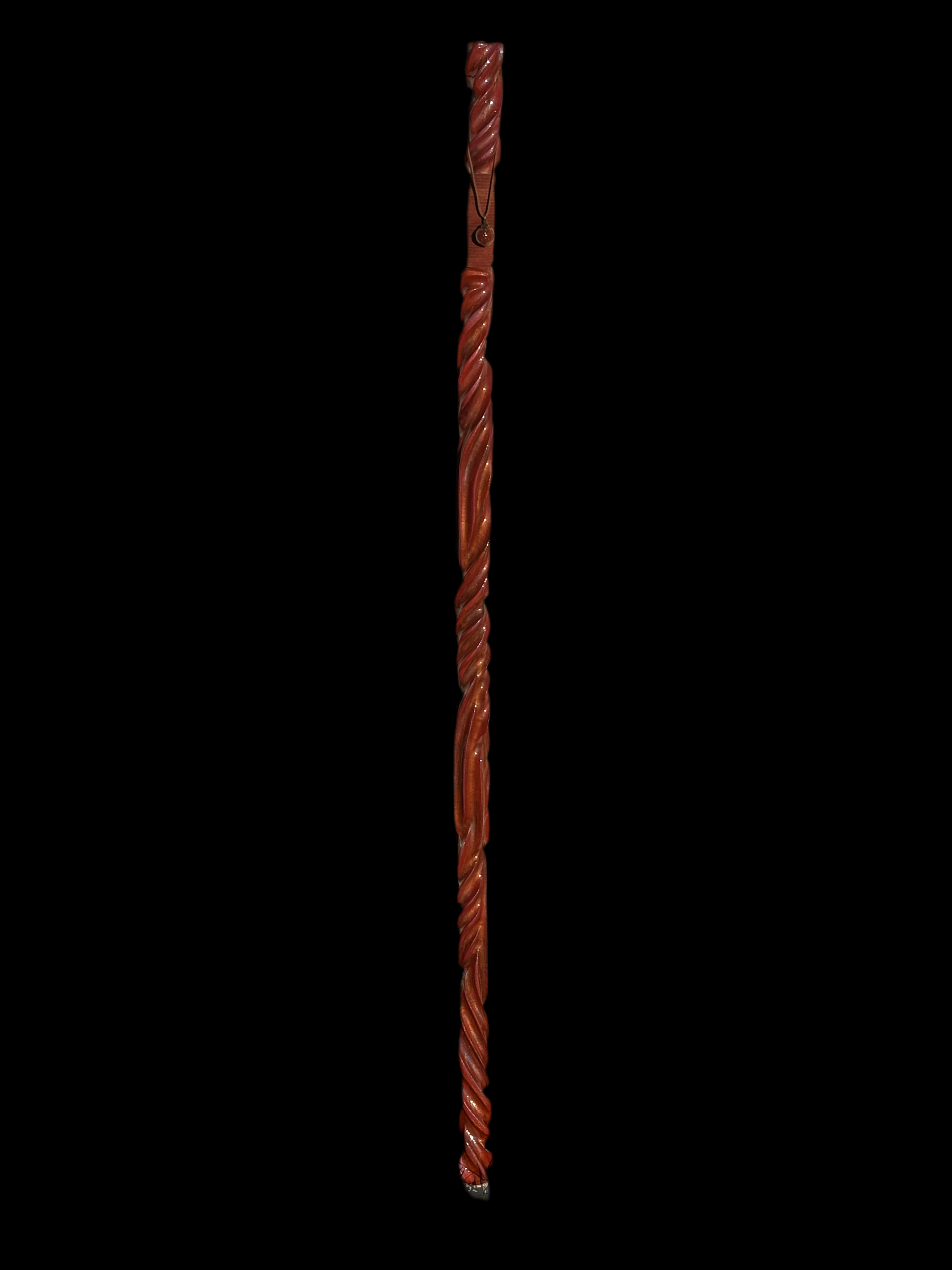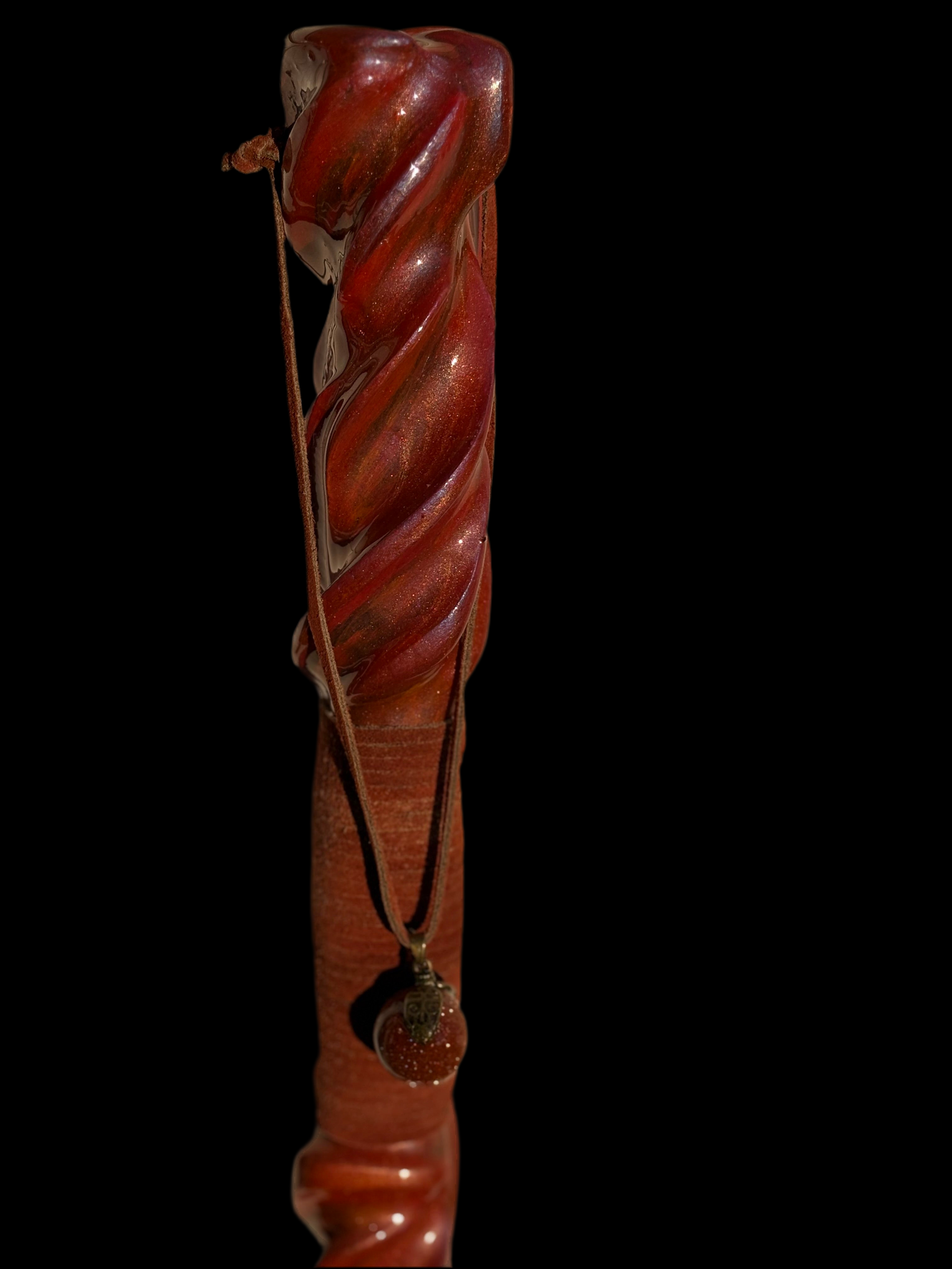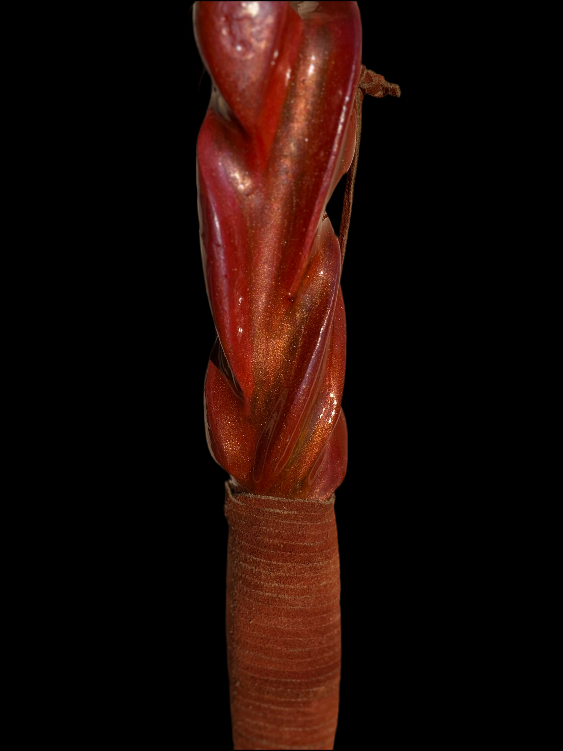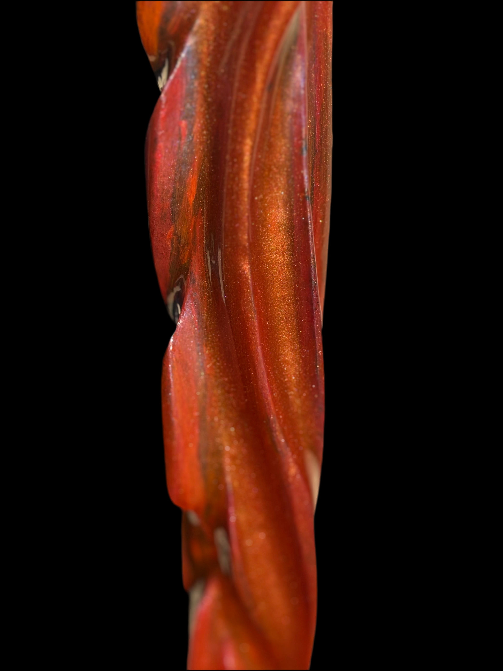 Solar burst- Twisted red staff with orange epoxy finish. Ignite your collection with solar burst. This handcrafted staff blazes in red paint and a Molten orange epoxy finish. It’s twisted shaft catching light like a flame and topped with a spherical accent and cord wrap. Solar burst soars to 54 1/2 inches tall and is 2 1/4 by 2 inches wide.