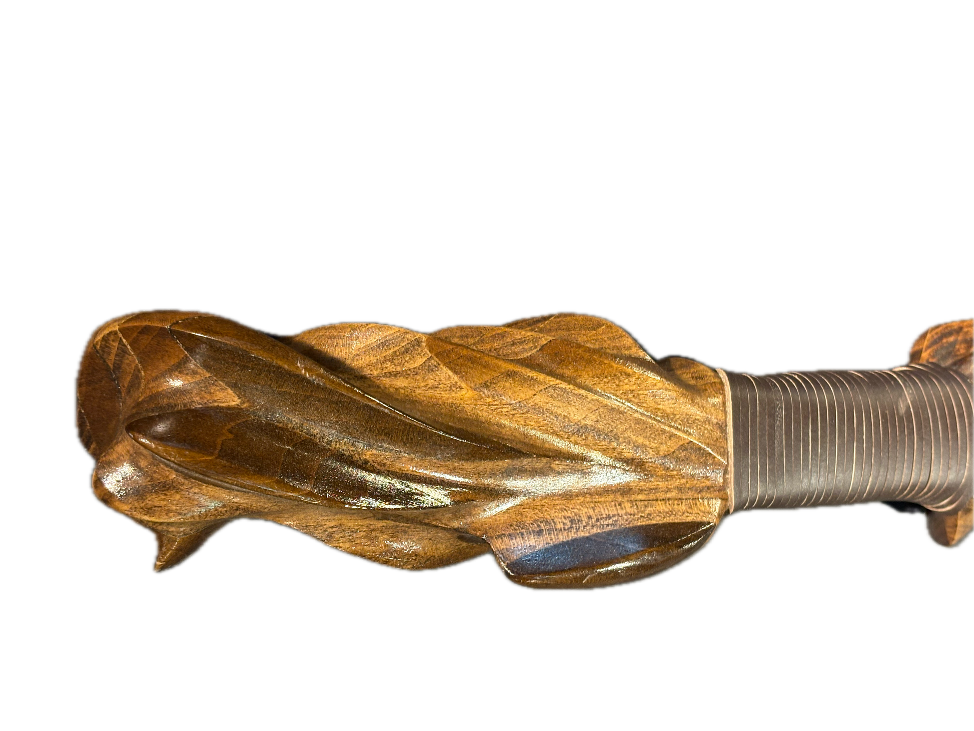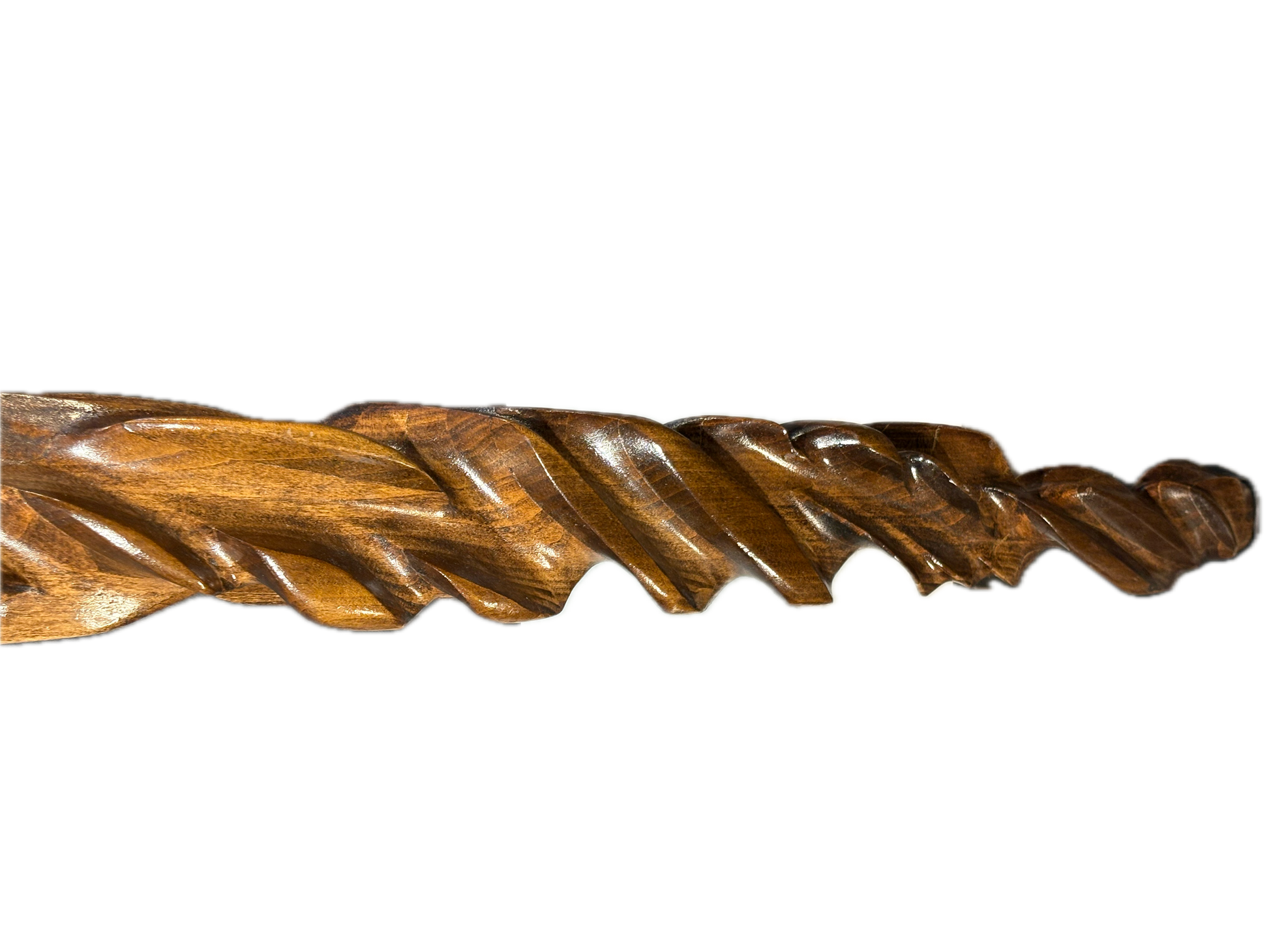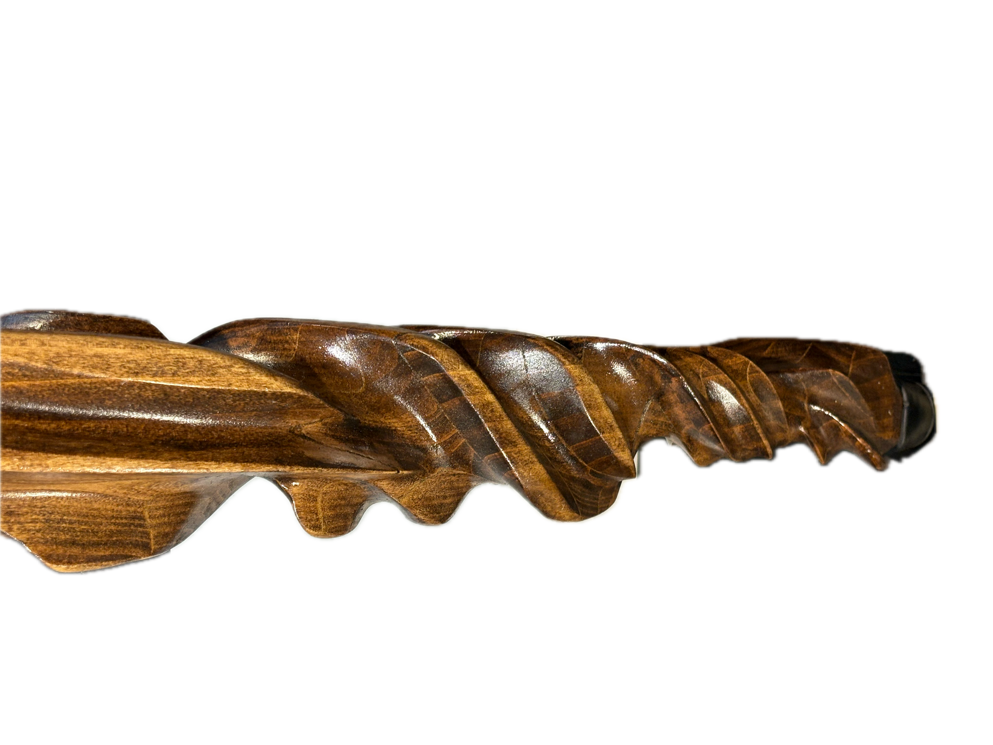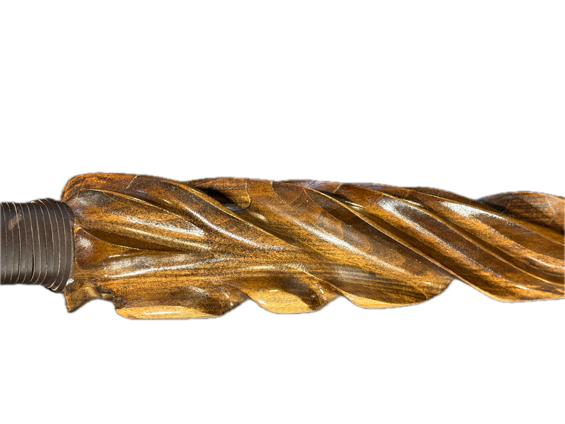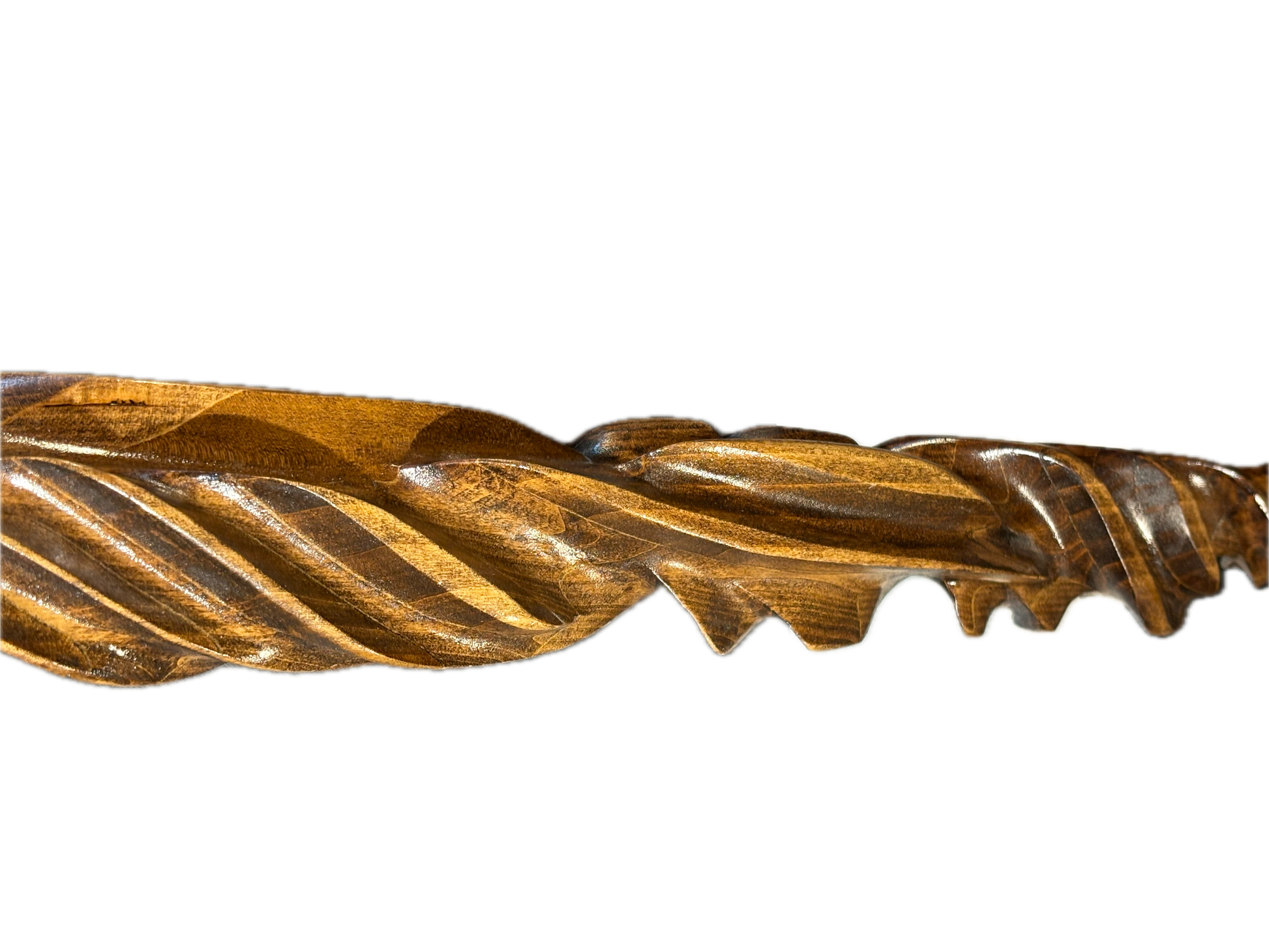 Spirit Spiral is a polished brown wooden walking stick with a beautifully carved spiral twist pattern running along its length. Its has a rich, elegant appearance showcasing fine craftsmanship. This staff is 54 1/2 inches tall and 3-1/4 x 2-1/4 wide . It is made of poplar wood.