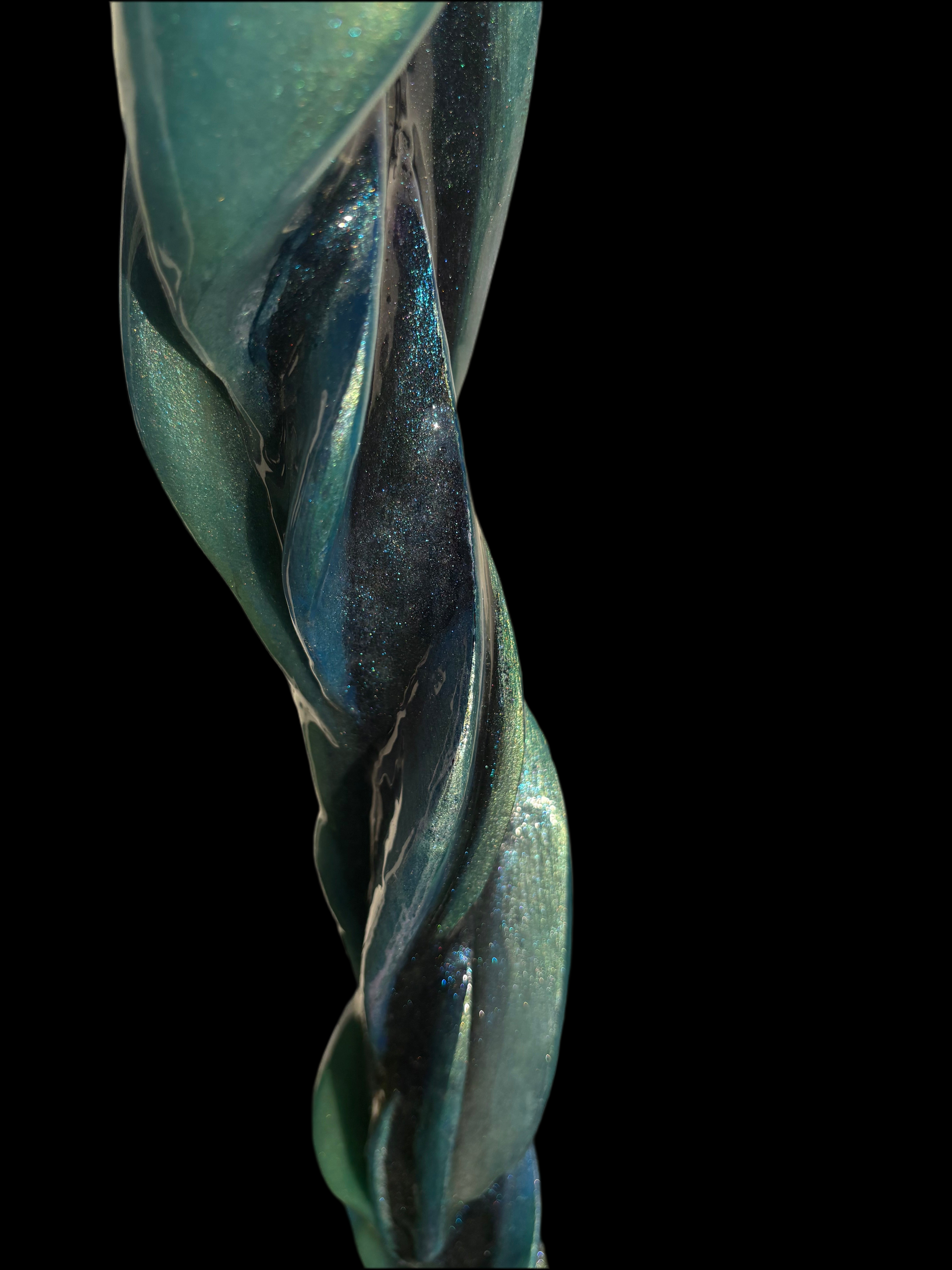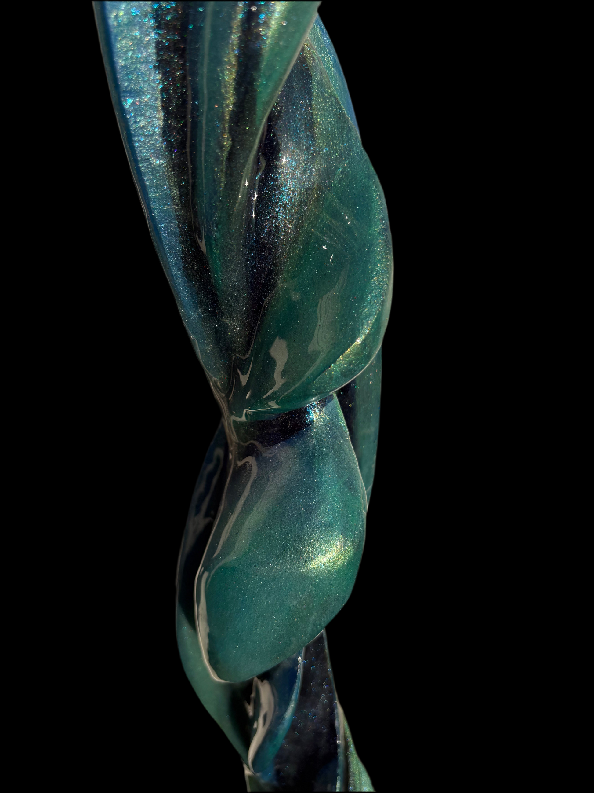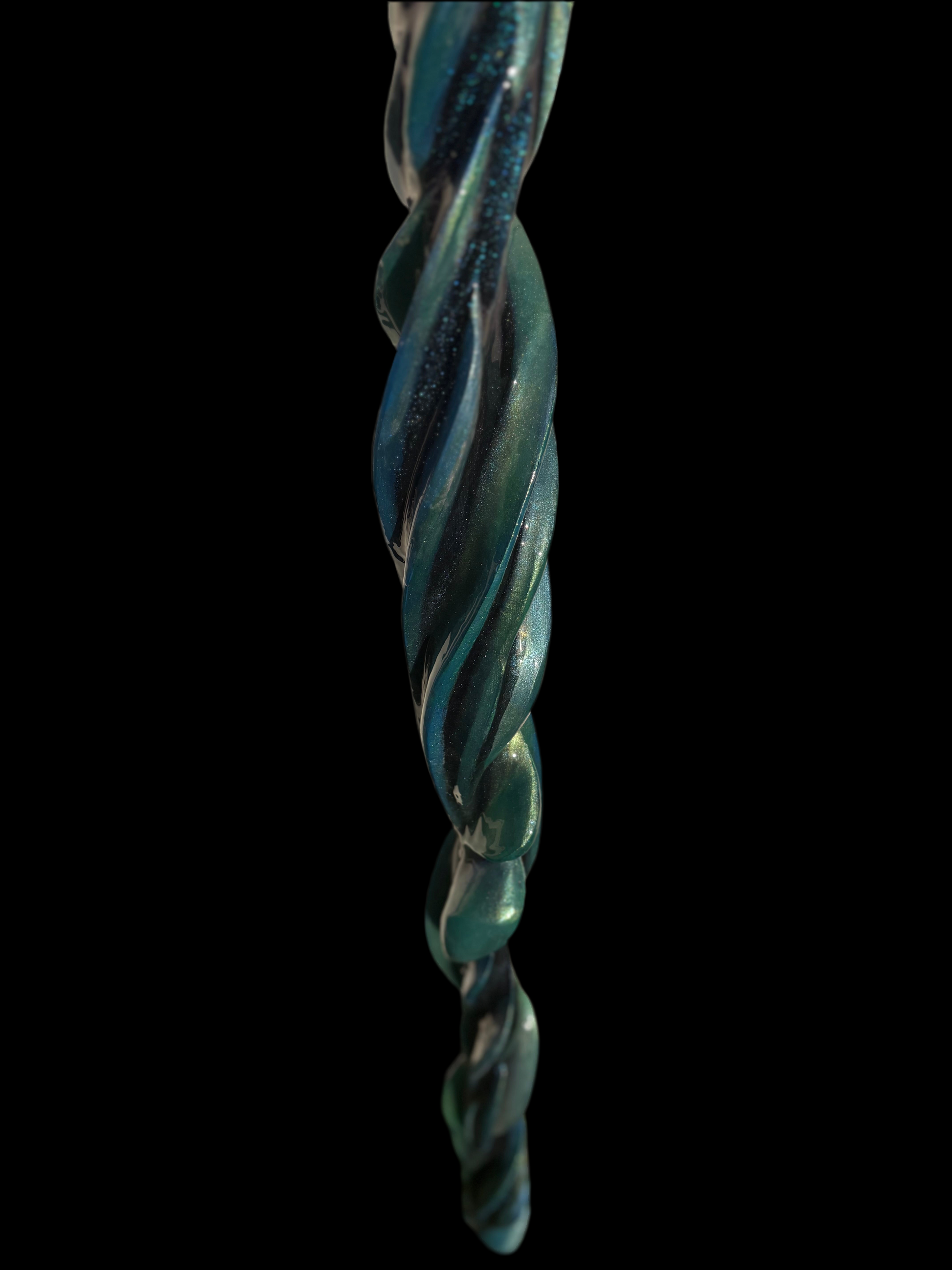 Tide piercer- a shimmering epoxy swirl of deep blue and kelp green,tide piercer feels like a shard broken from the oceans will. Its twisting form catches light like sunlit surf- fluid, fierce, and precise. Crafted for those who stride between waves and storm.Tide piercer stands at 53 3/4 tall and is 3 1/4 by 2 3/4 inches wide.