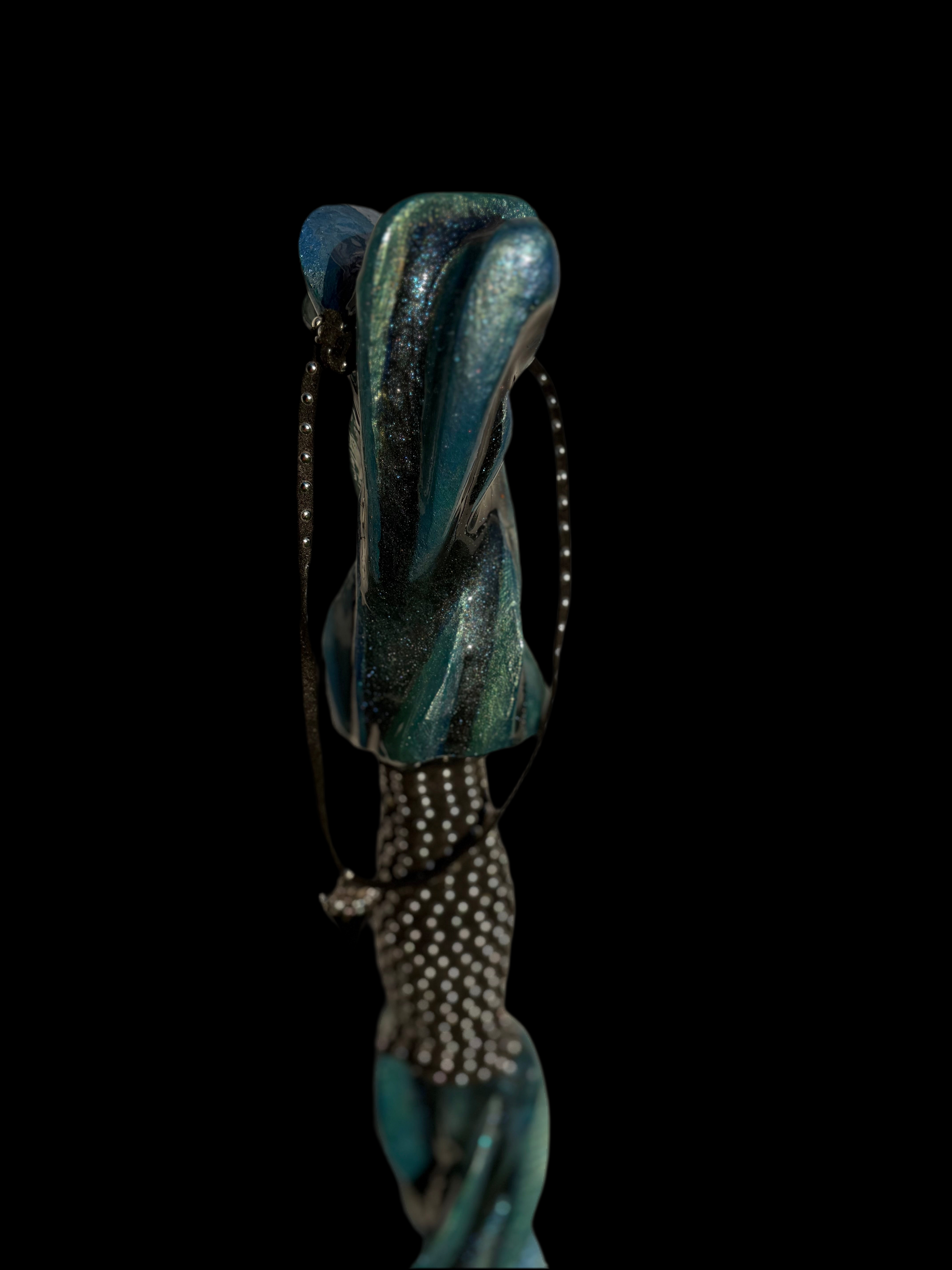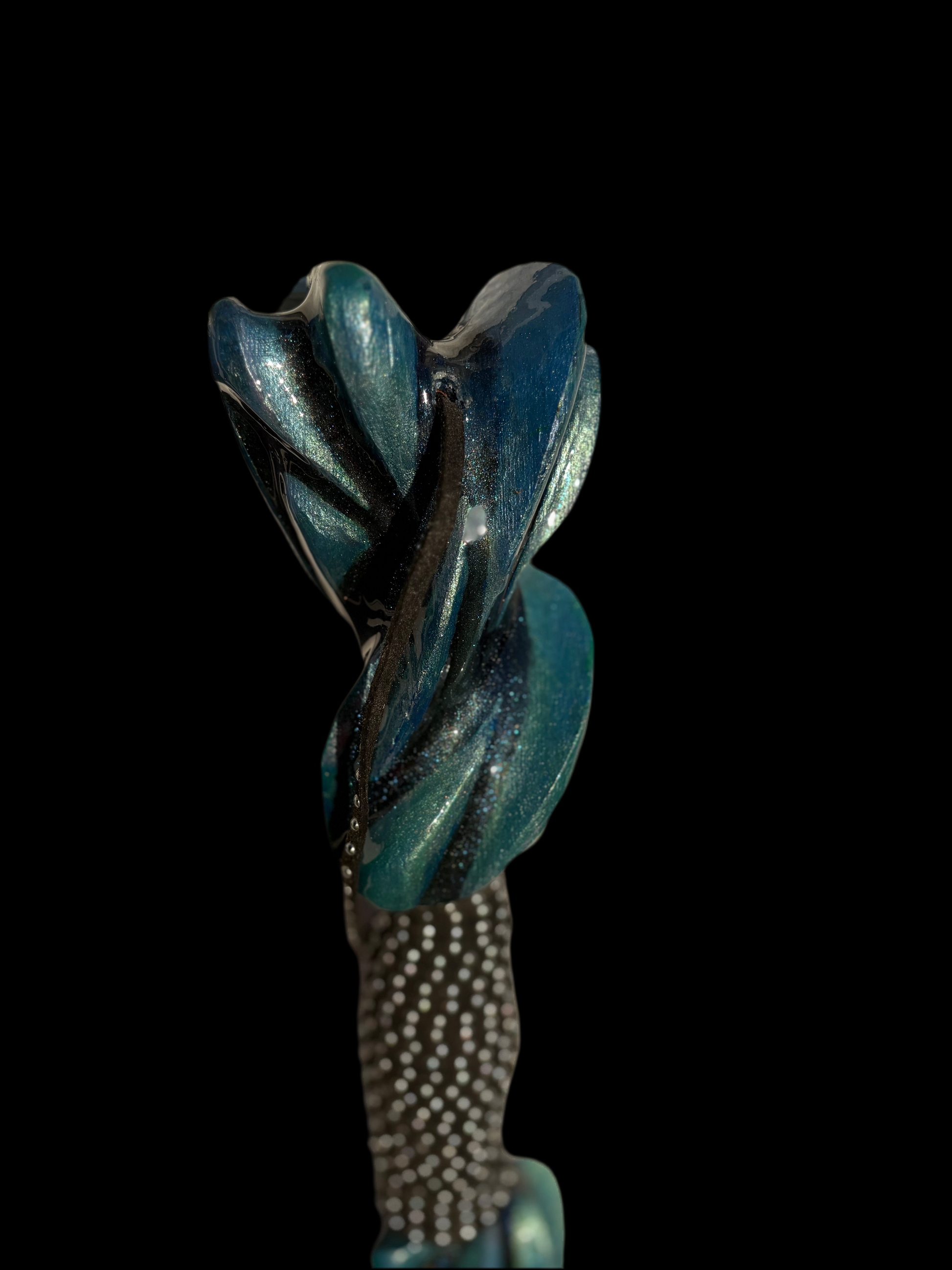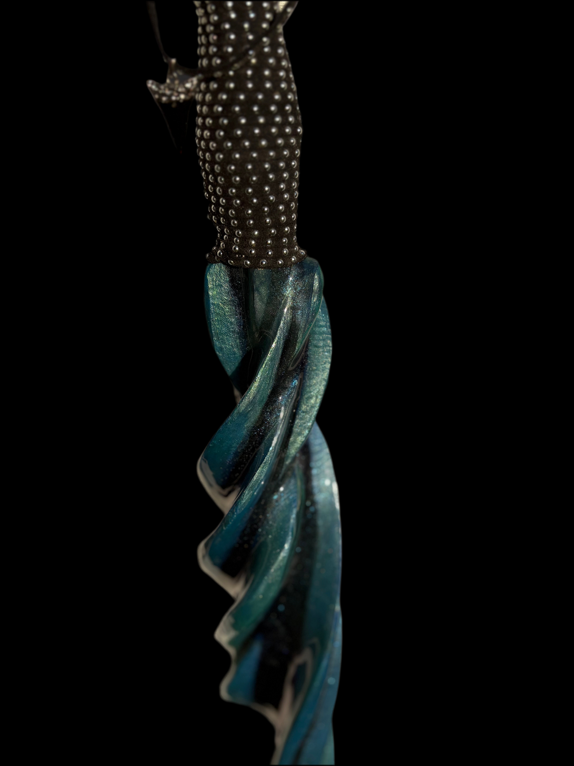 Tide piercer- a shimmering epoxy swirl of deep blue and kelp green,tide piercer feels like a shard broken from the oceans will. Its twisting form catches light like sunlit surf- fluid, fierce, and precise. Crafted for those who stride between waves and storm.Tide piercer stands at 53 3/4 tall and is 3 1/4 by 2 3/4 inches wide.