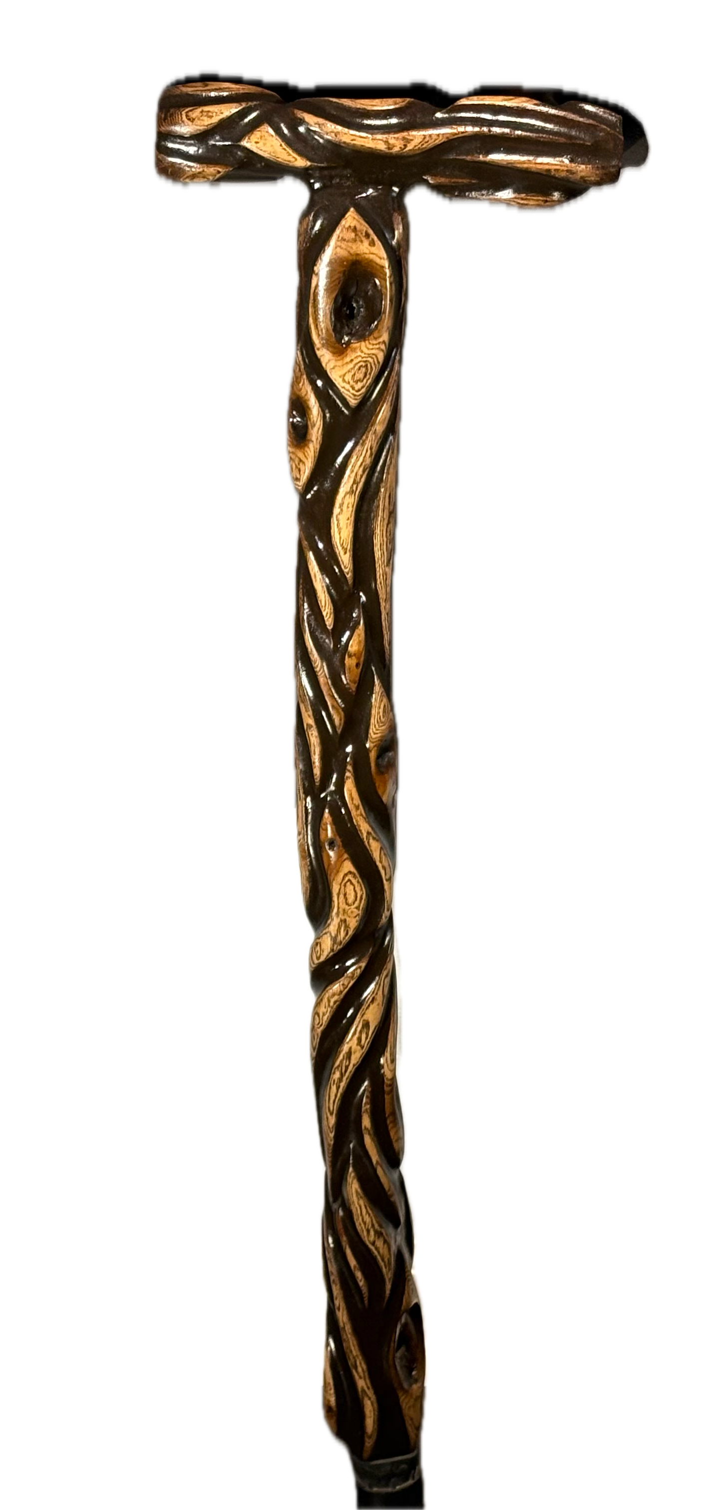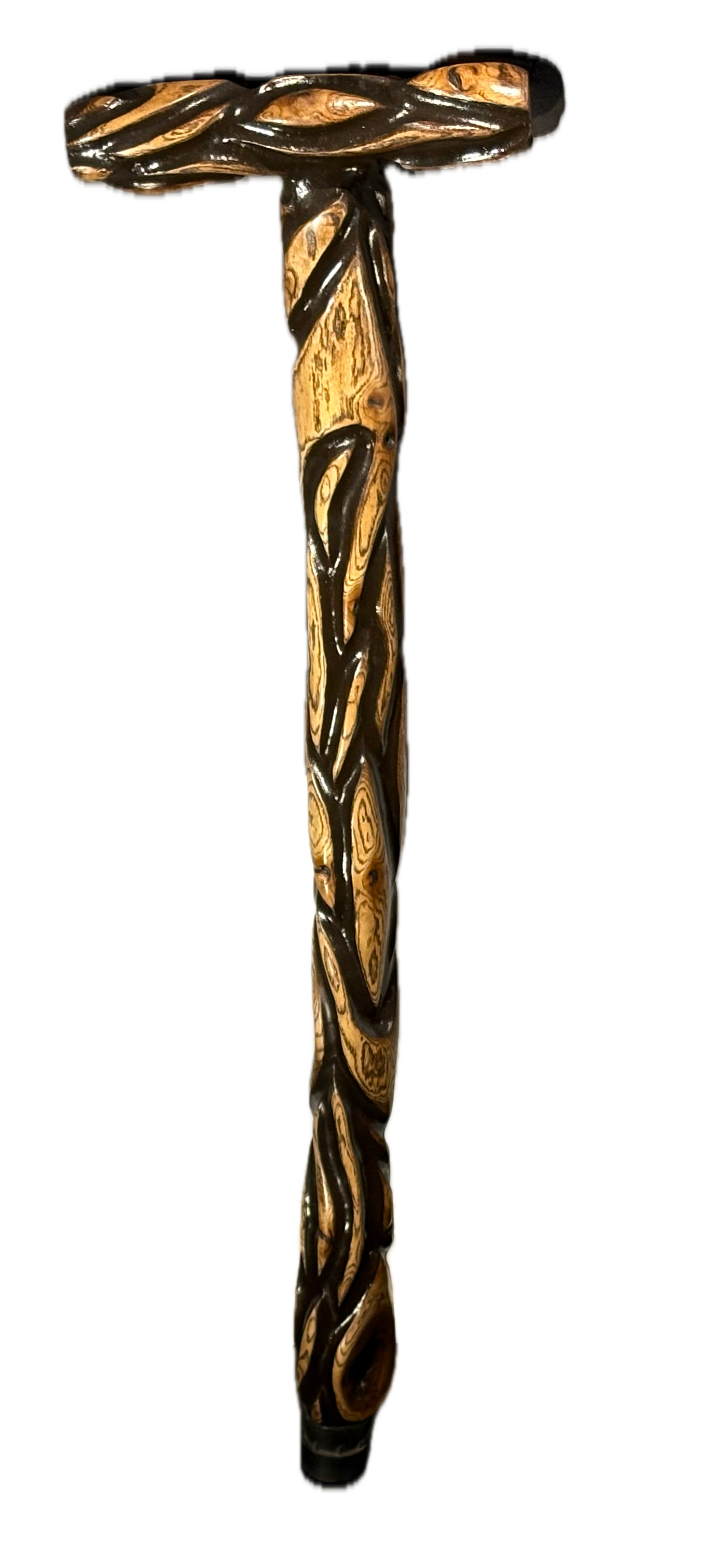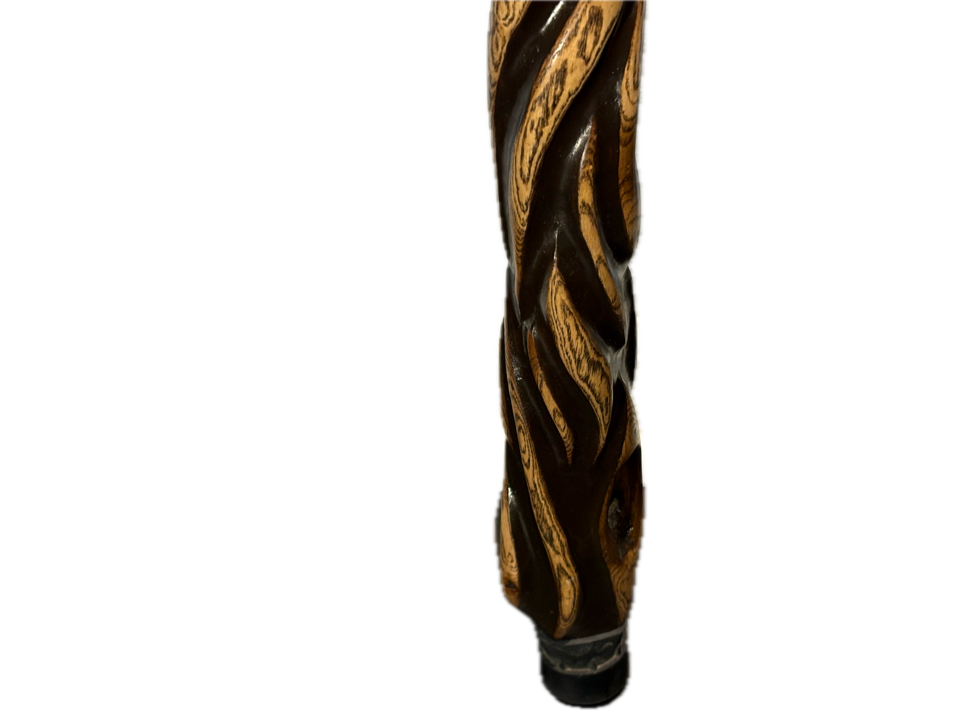 Titian - Sculpted and sleek, this handcrafted cane blends symmetry with statement. It’s twisted silhouette and bold tonal contrast make it an eye-catching piece for those who appreciate form, balance, and quiet drama. Titian stands at32 1/4 inches tall and is 2 1/4 by 2 1/4 inches wide.