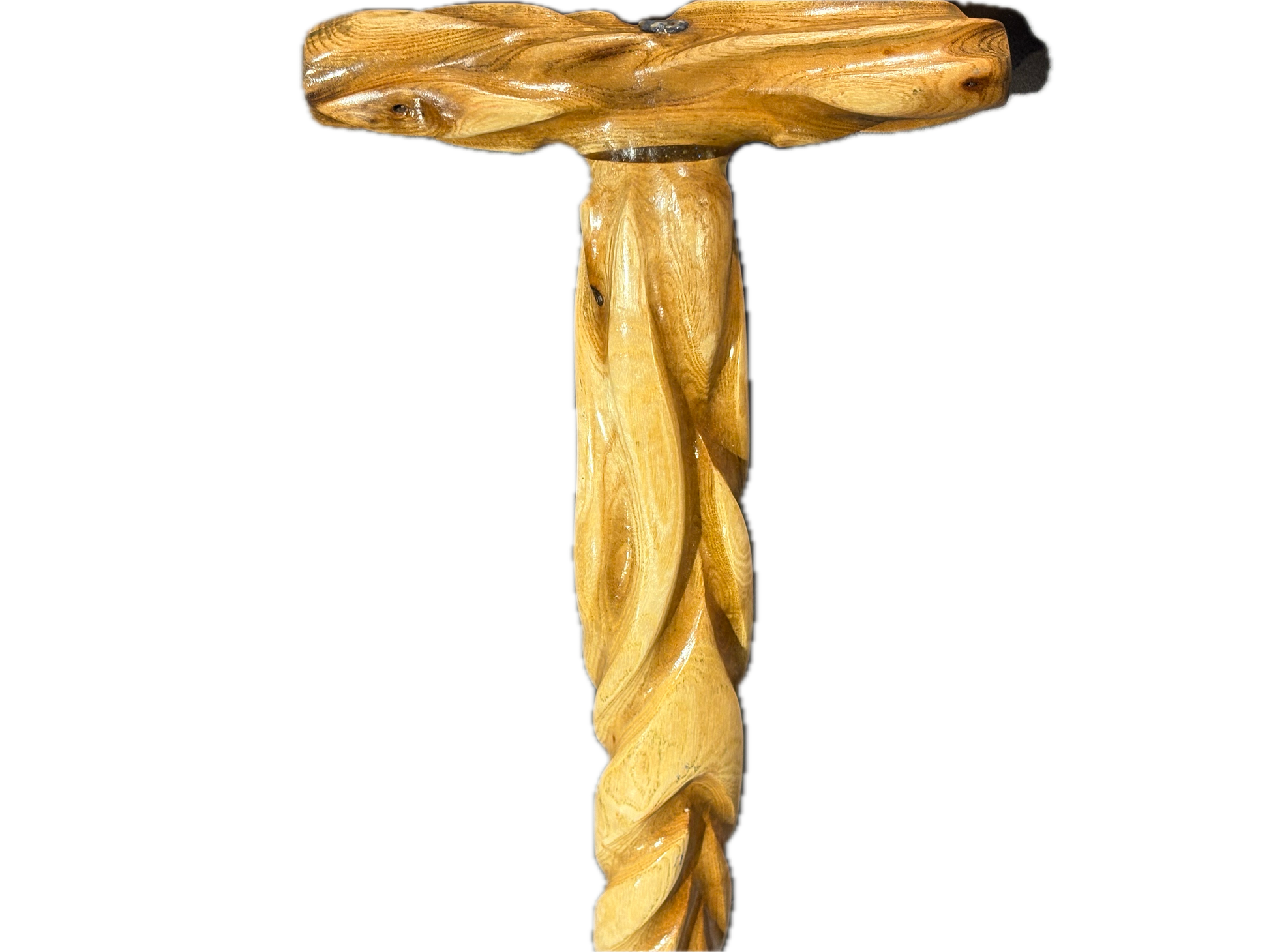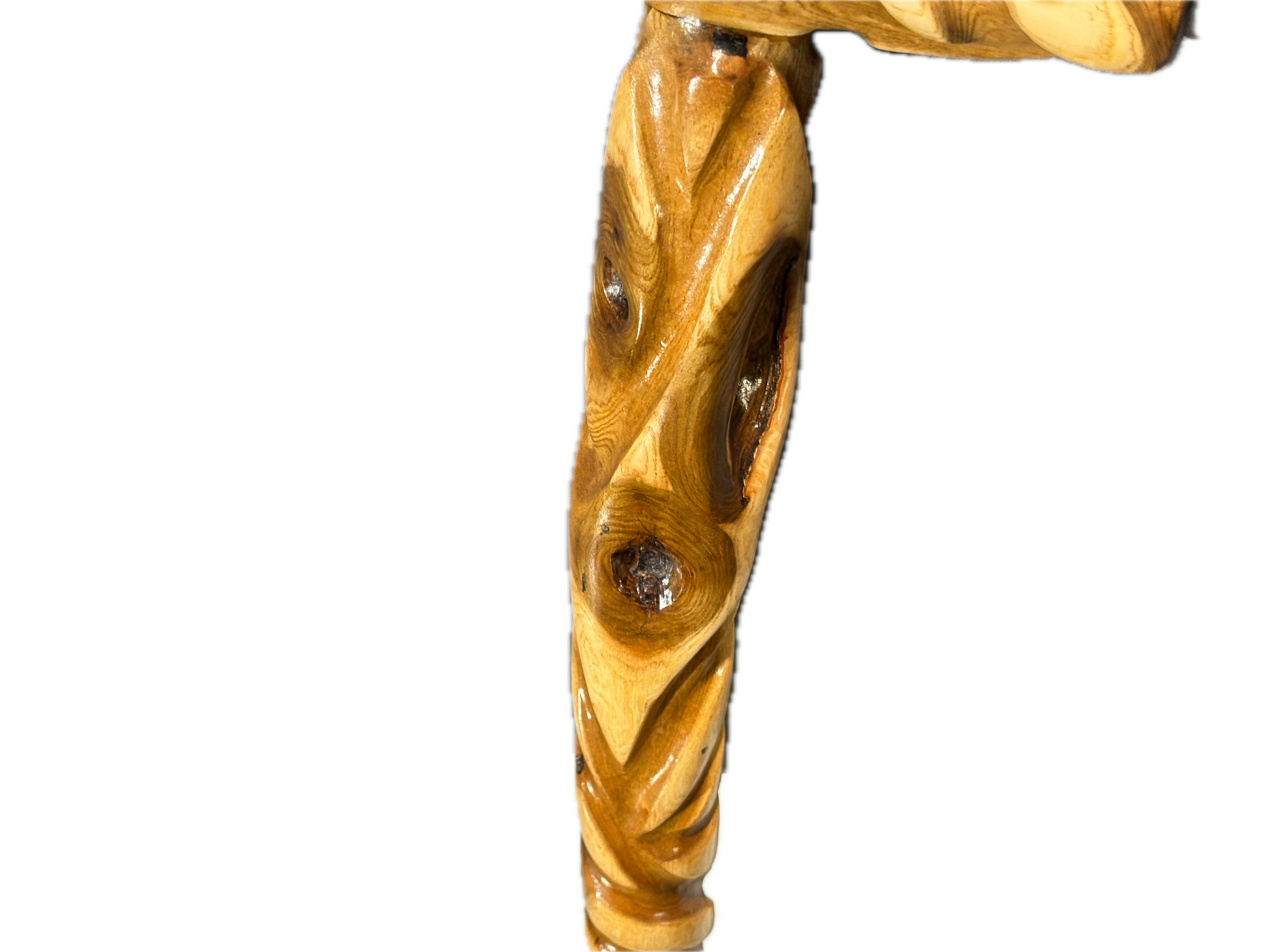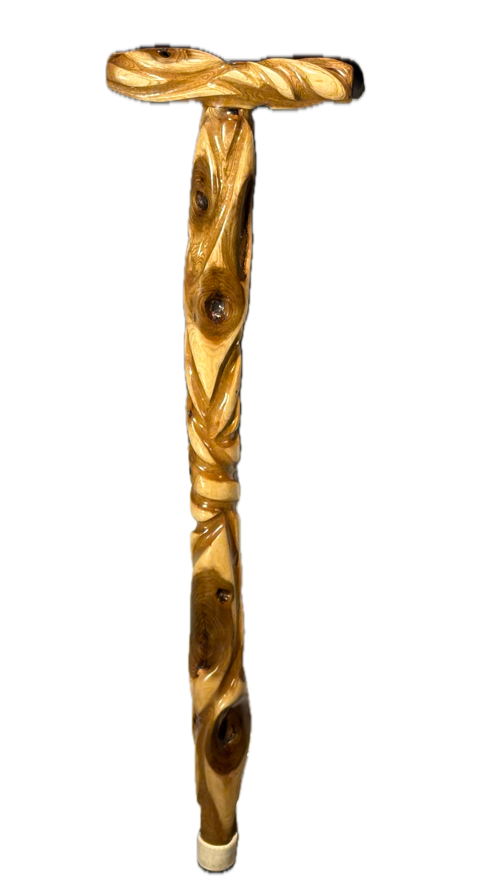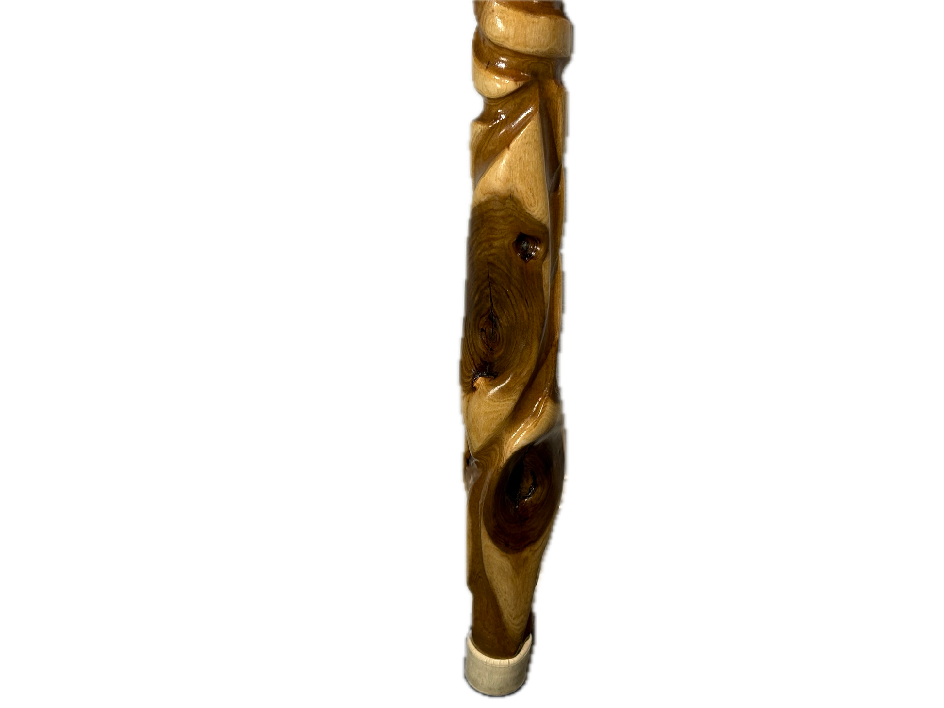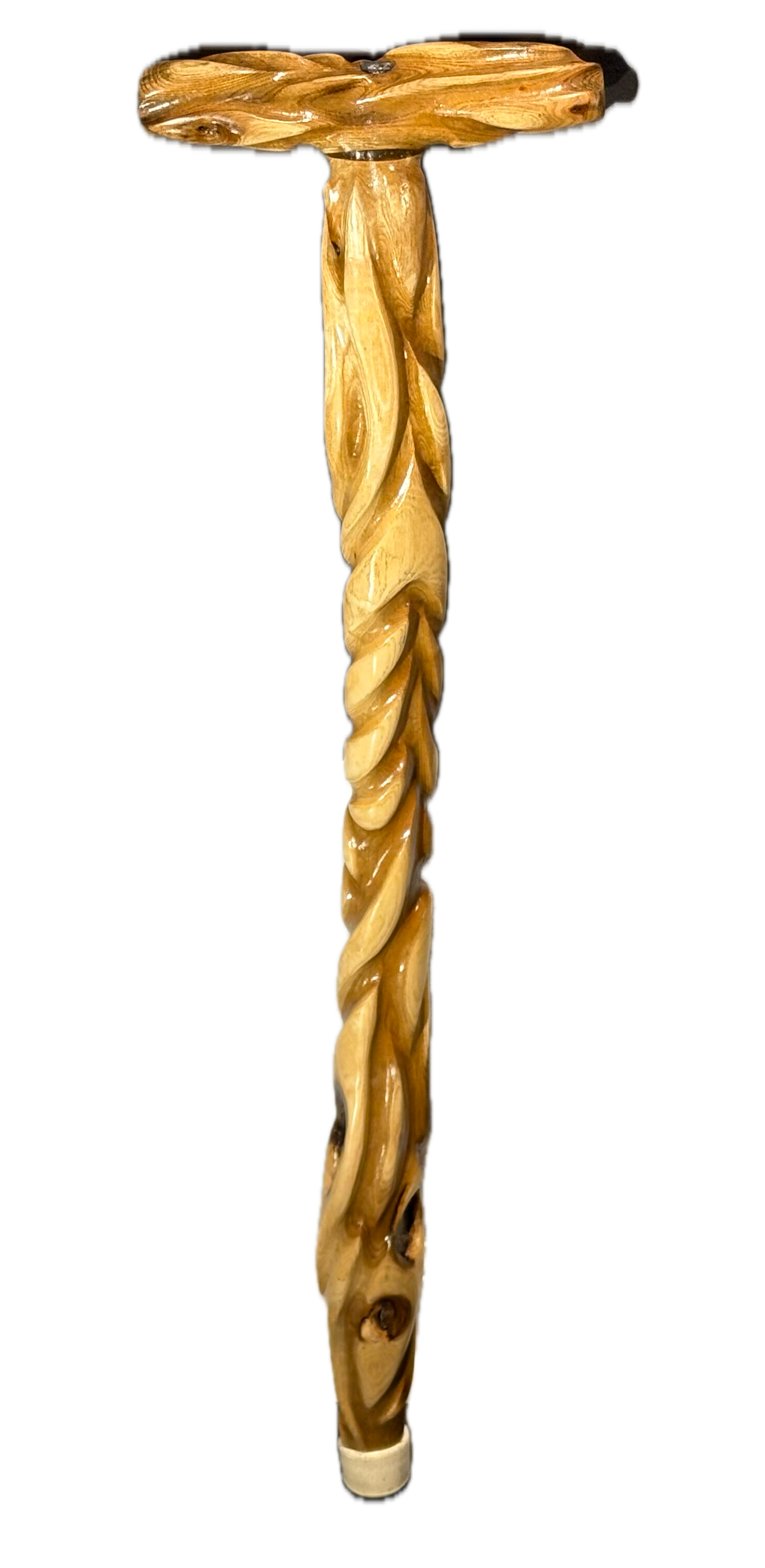Wild wood swirl - The groves reach cane carved with a bold twist, knotted twist and rich natural grain . Wild wood swirl looks like it was coaxed from the heart of an ancient grove. rustic, raw and full of personality, it’s a piece that carries the wild with quiet confidence . Wild wood swirl stands 30 1/4 inches tall and is 1 1/2 by 1 1/4 wide.